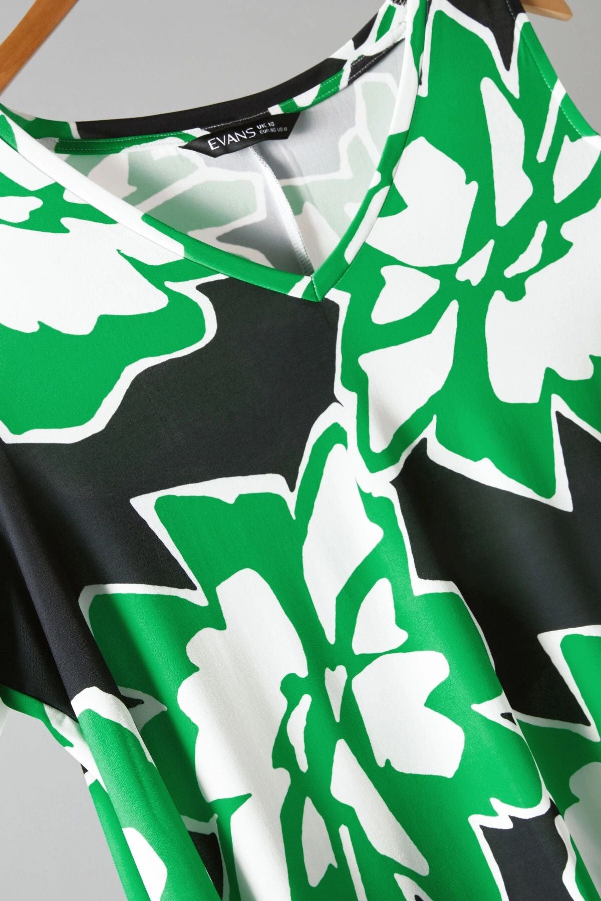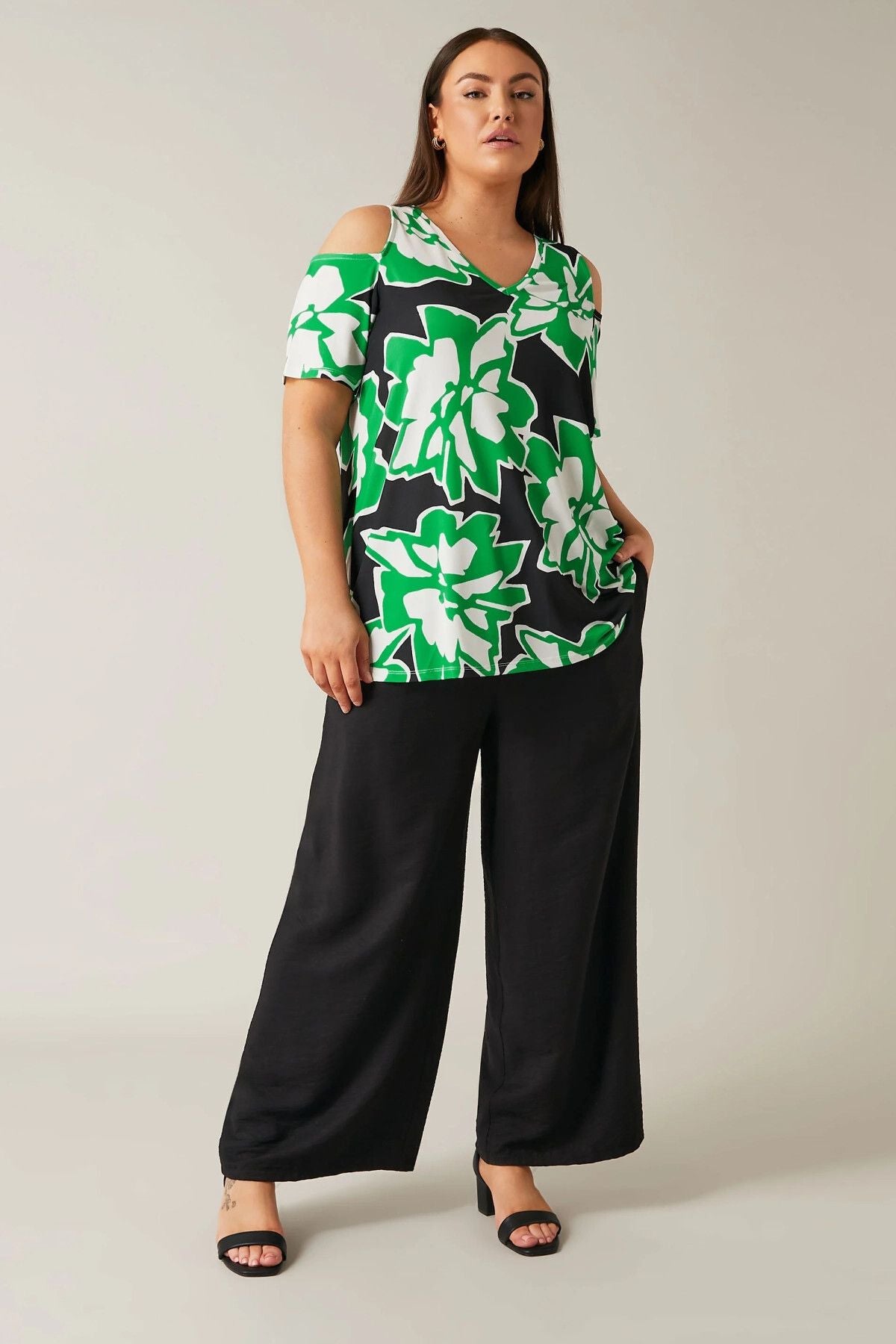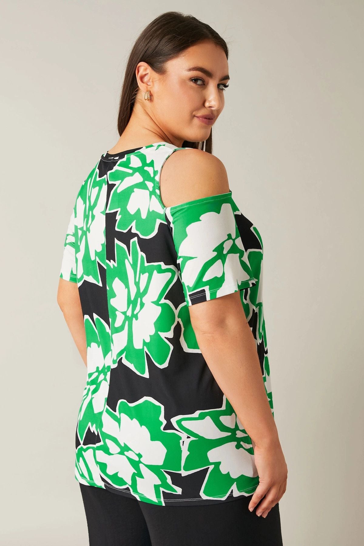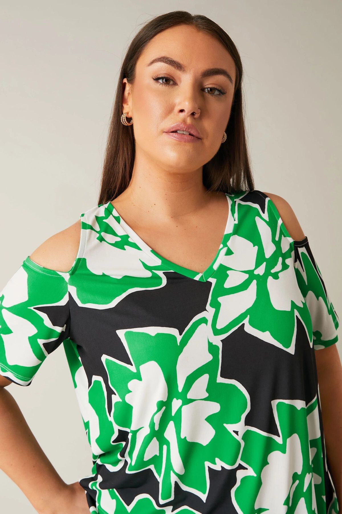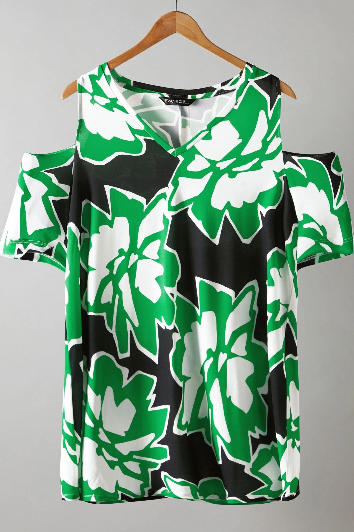 Büyük Beden Açık Omuz Detaylı V Yaka Kısa Kollu Desenli Bluz 615404