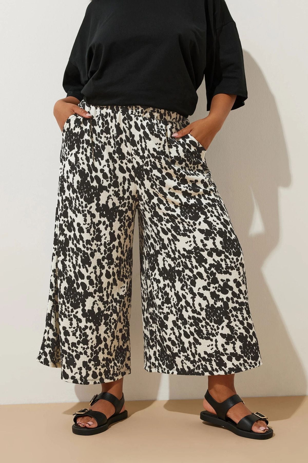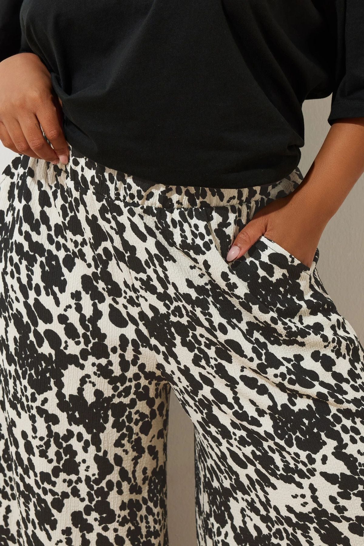 Model Detayı: İnek baskısı, midaxi boy, bol paça stil, iki ön cep, elastik bel bandı