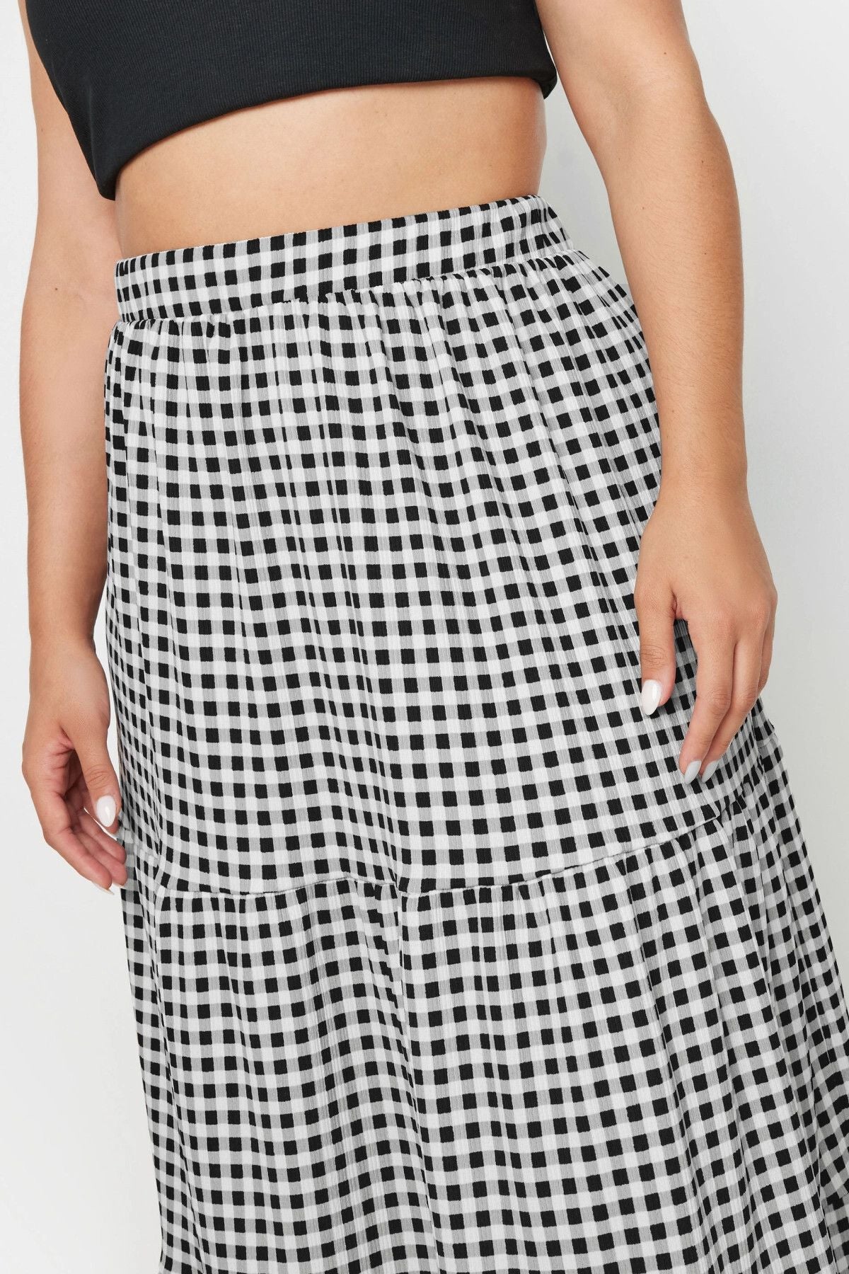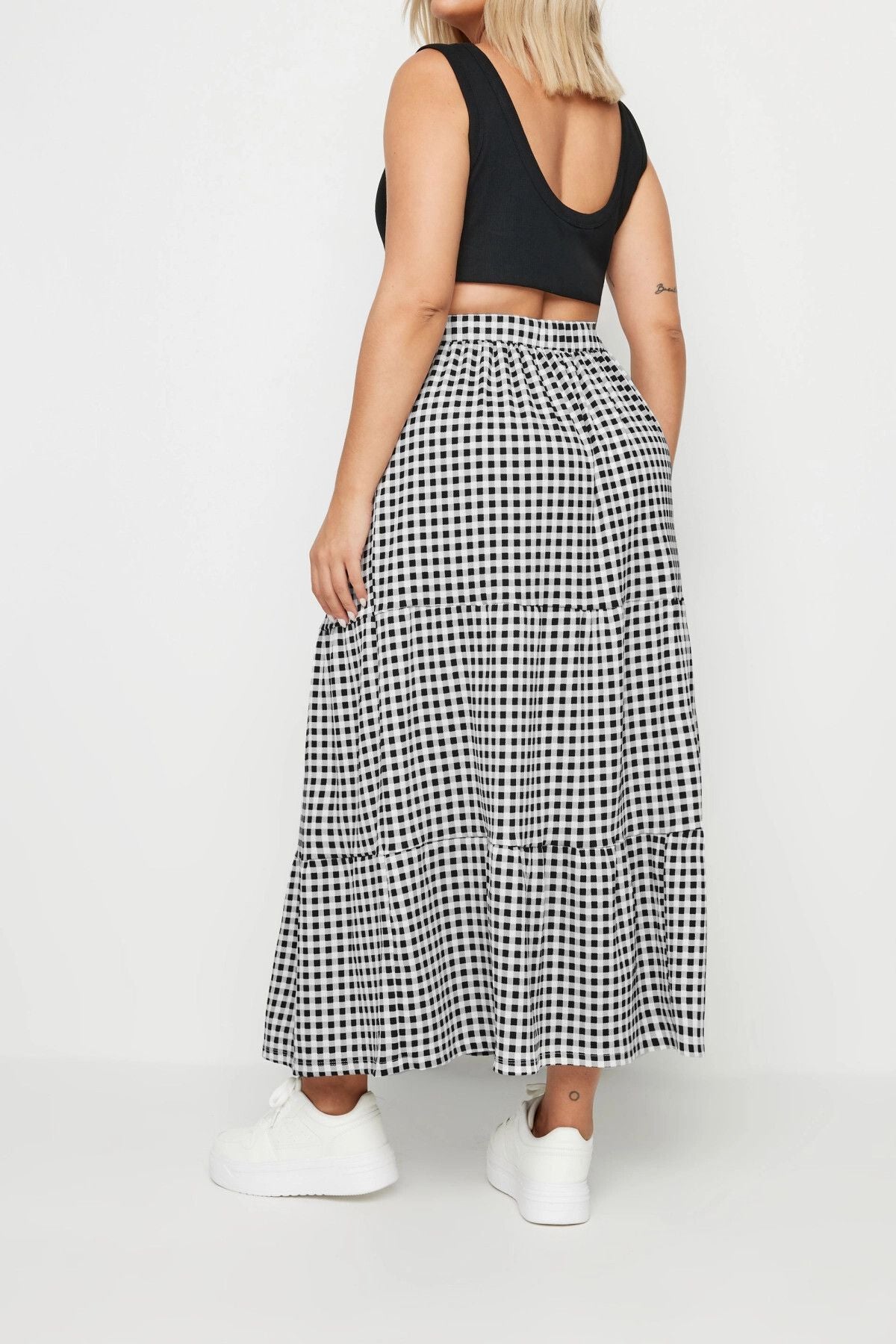 Model Detayı: Pötikareli desen, katlı tasarım, maxi boy, elastik bel bandı