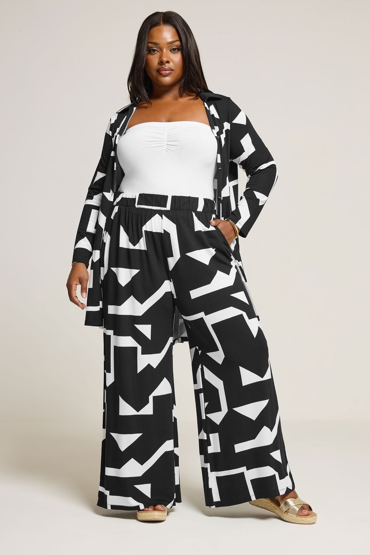 Gardırobunuzun aradığı parça bu yeni soyut desenli pantolon! Rahat bir jarse kumaştan üretilen bu pantolon, geniş paça modeli, beli lastikli ve iki yan cepli tasarımıyla öne çıkıyor. Bu sezon çok seveceğiniz trend bir hafta sonu görünümü için uyumlu gömleği ve spor ayakkabılarla kombinleyin! Yeni favori pantolonunuz!