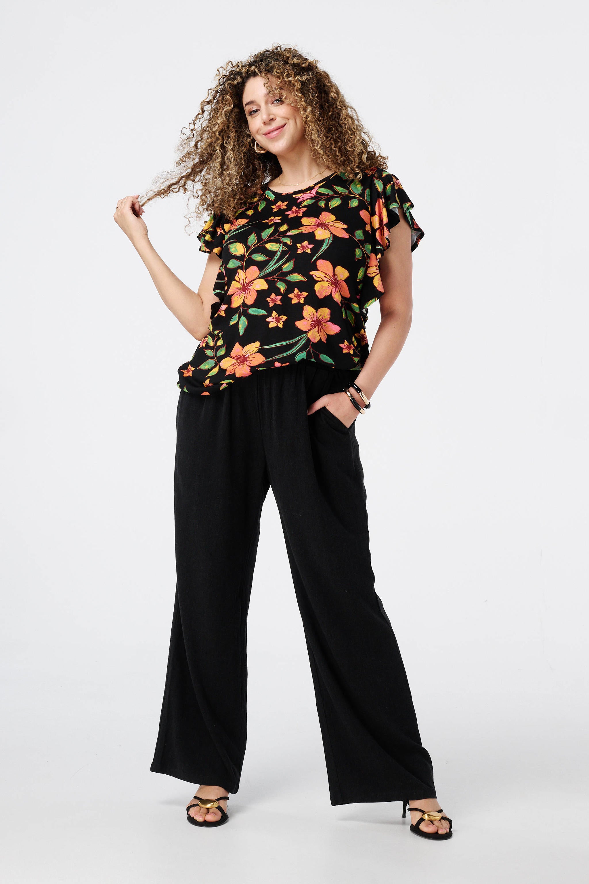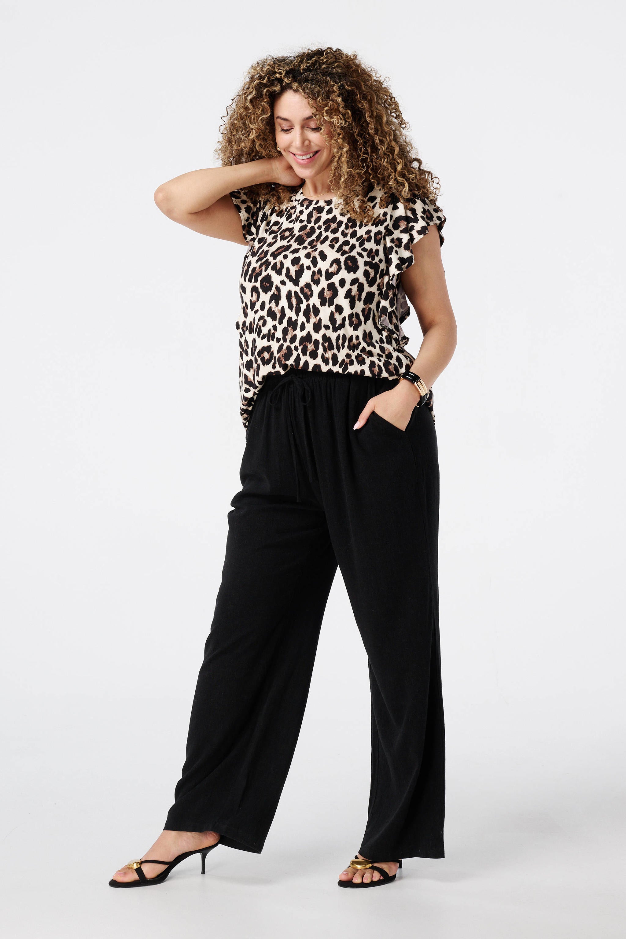 Moda Notu: Bu bluz, düz kesimi ve yuvarlak yakasıyla klasik bir şıklık sunar. Fırfırlı kısa kolları ve leopar deseni, görünümünüze eğlenceli bir dokunuş katıyor.