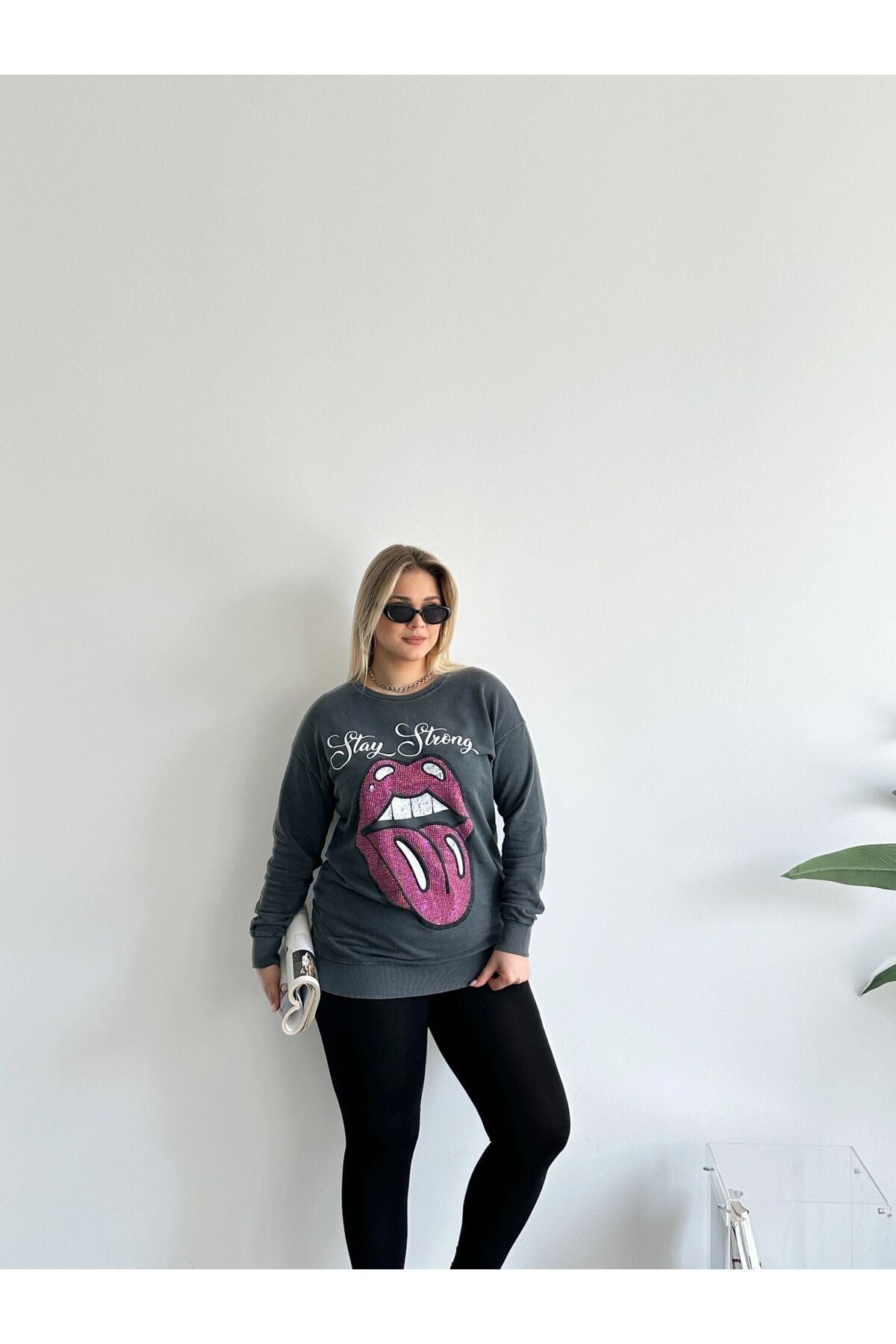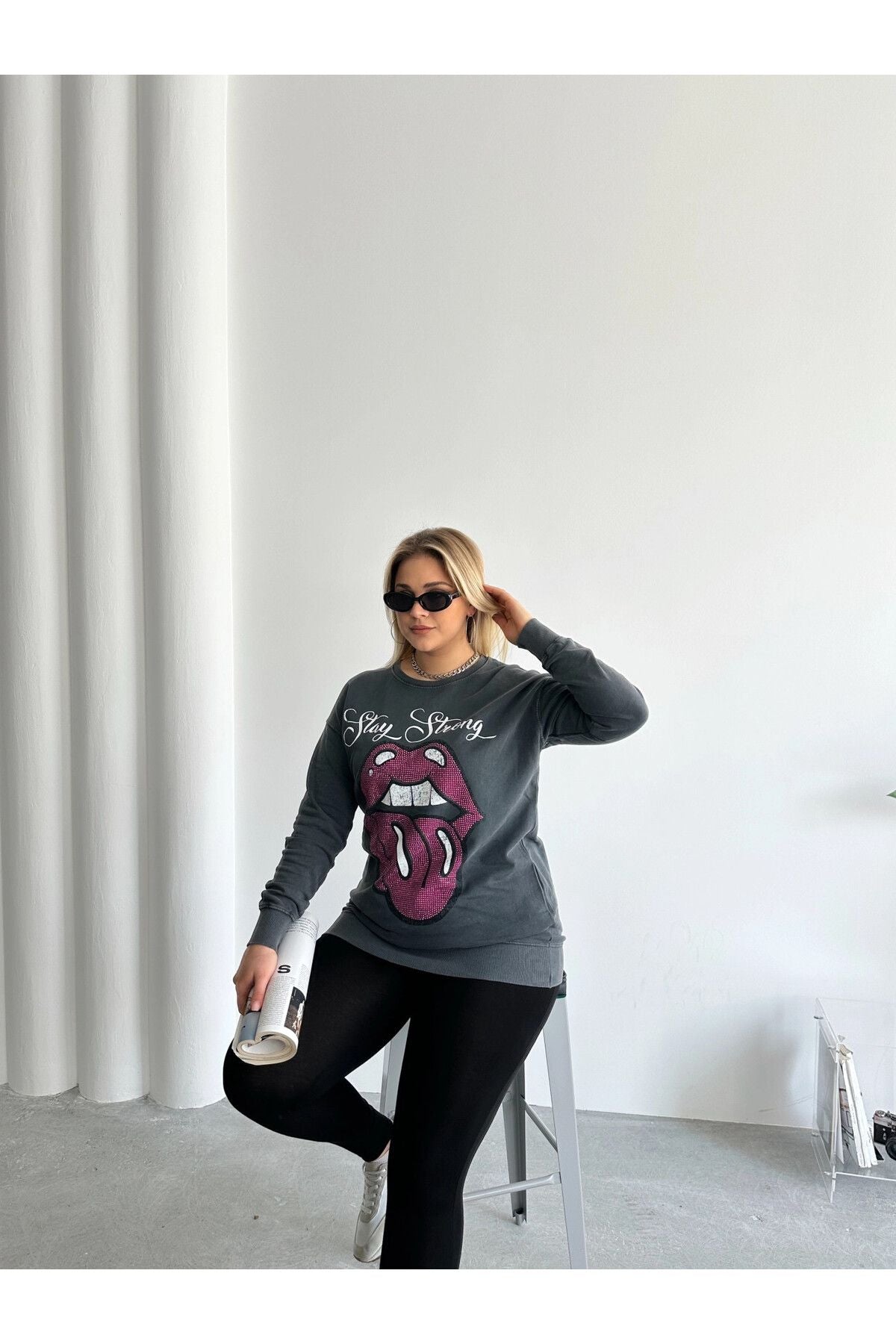 Model Detayı: Taş İşlemeli Dil Baskılı, 'Stay Strong' Yazılı, Yuvarlak Yaka, Uzun Kollu Sweatshirt