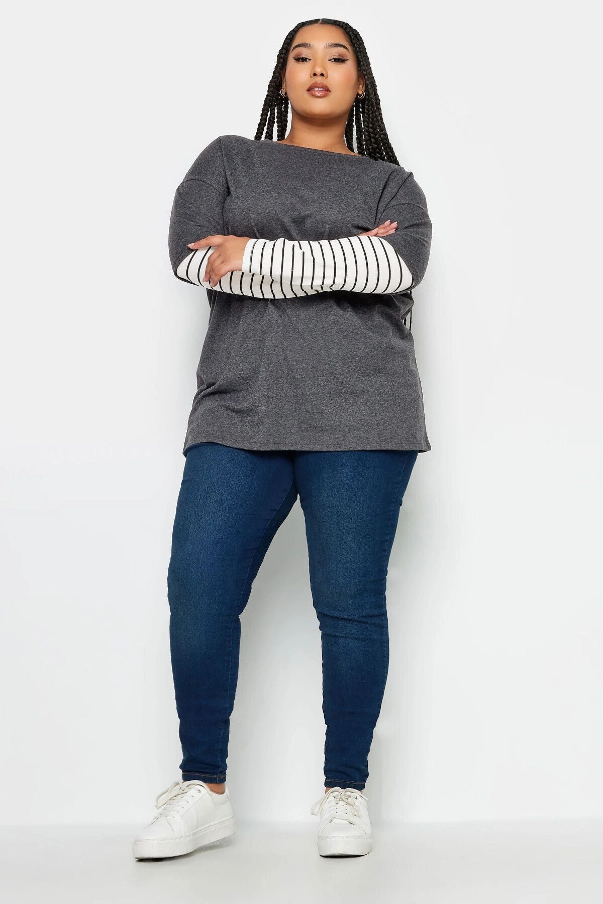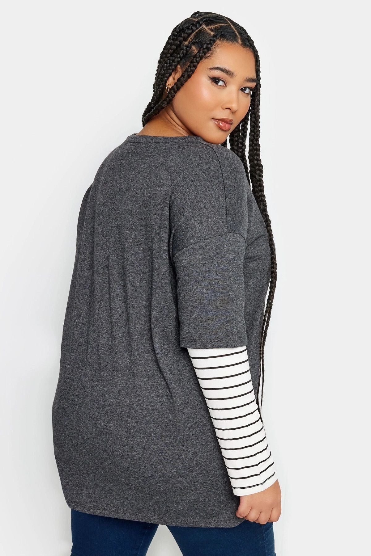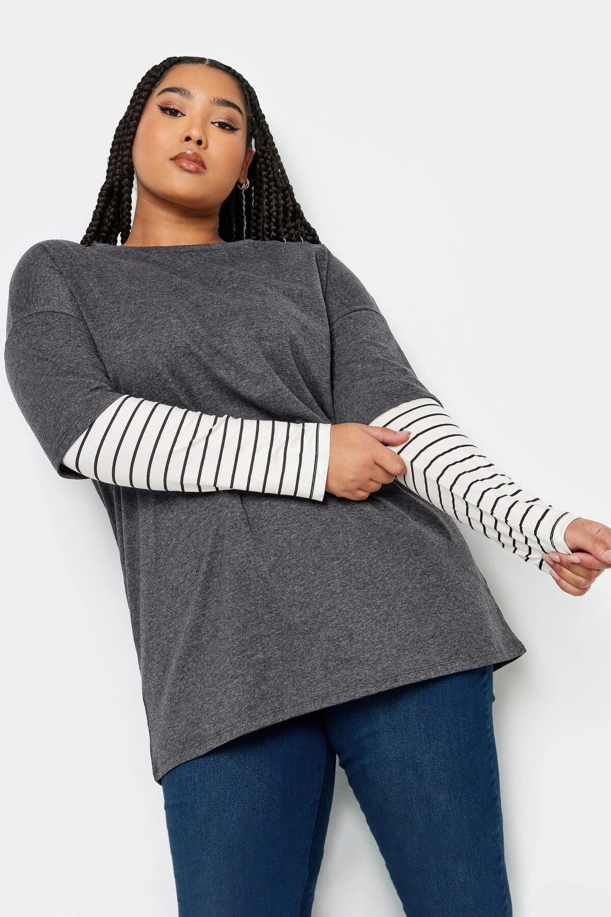 Büyük Beden Bisiklet Yaka Çift Katlı Kolları Çizgili T-shirt 302764
