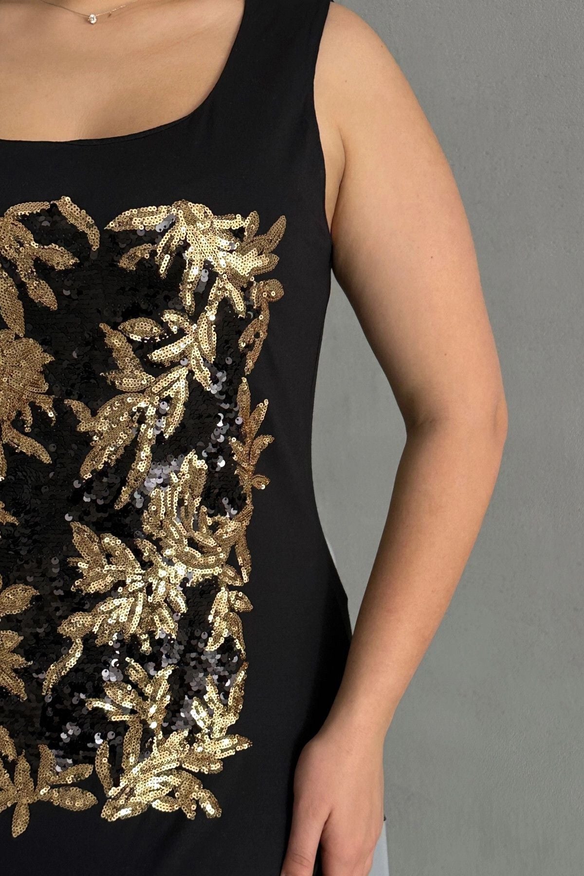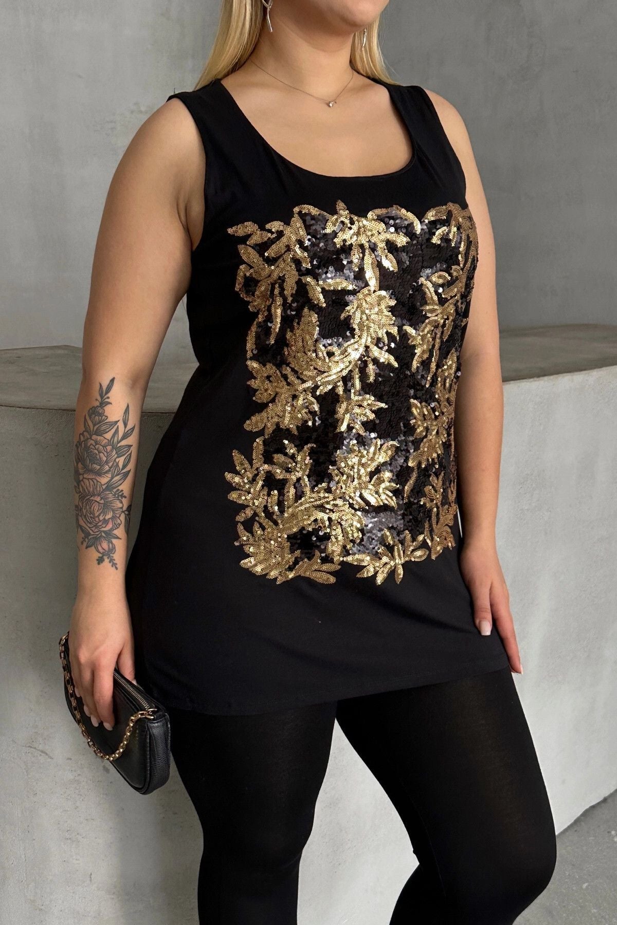 Büyük Beden Bisiklet Yaka Kolsuz Payetli Bluz 303102