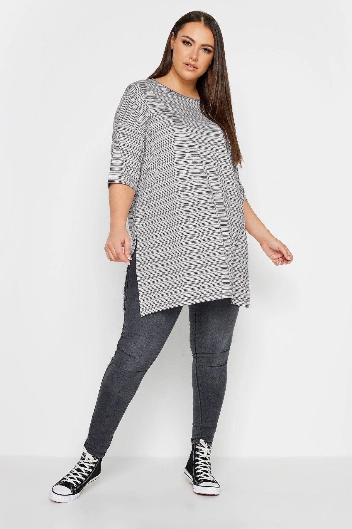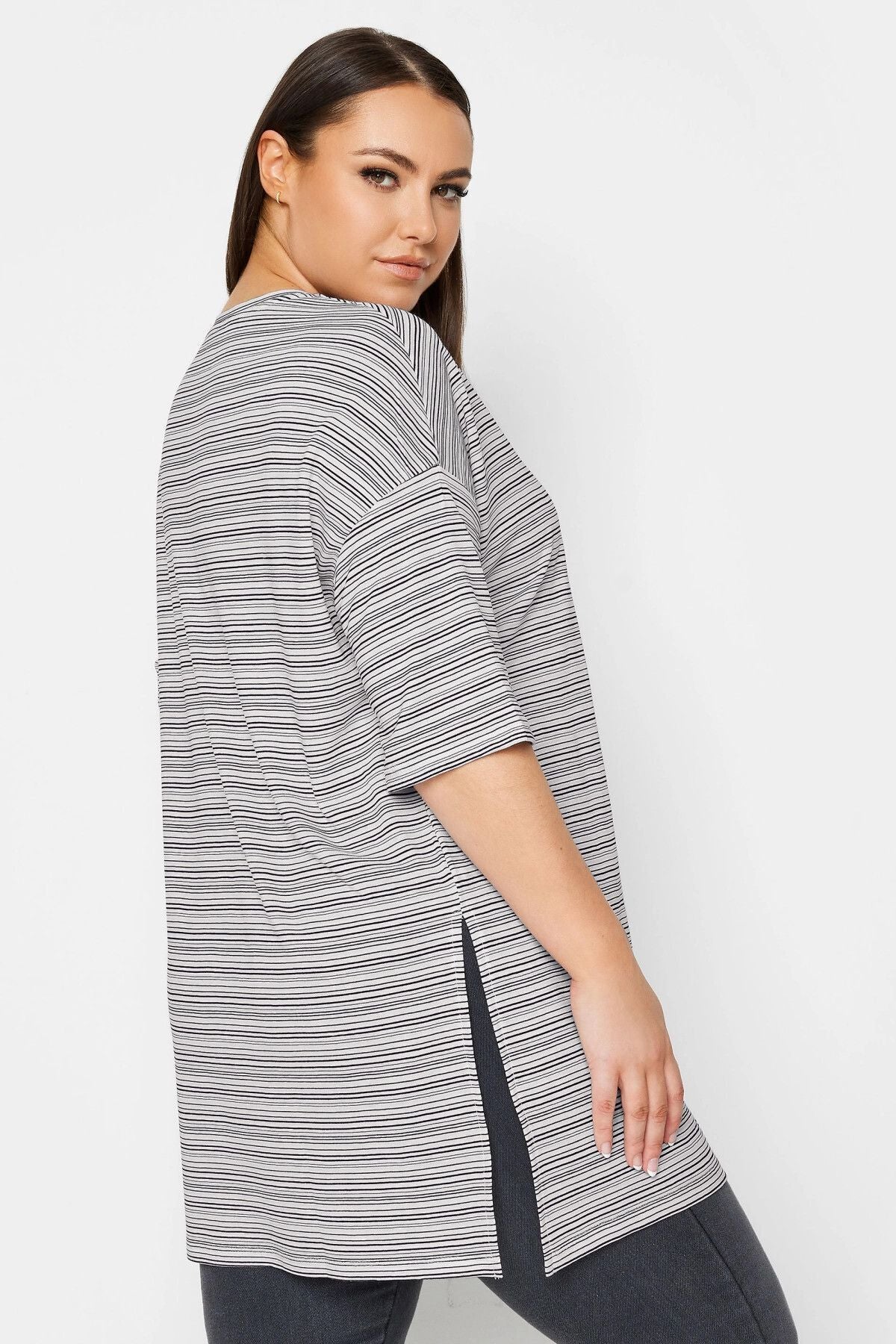 Büyük Beden Bisiklet Yaka Yarım Kollu Yırtmaç Detaylı Çizgili T-shirt 302946