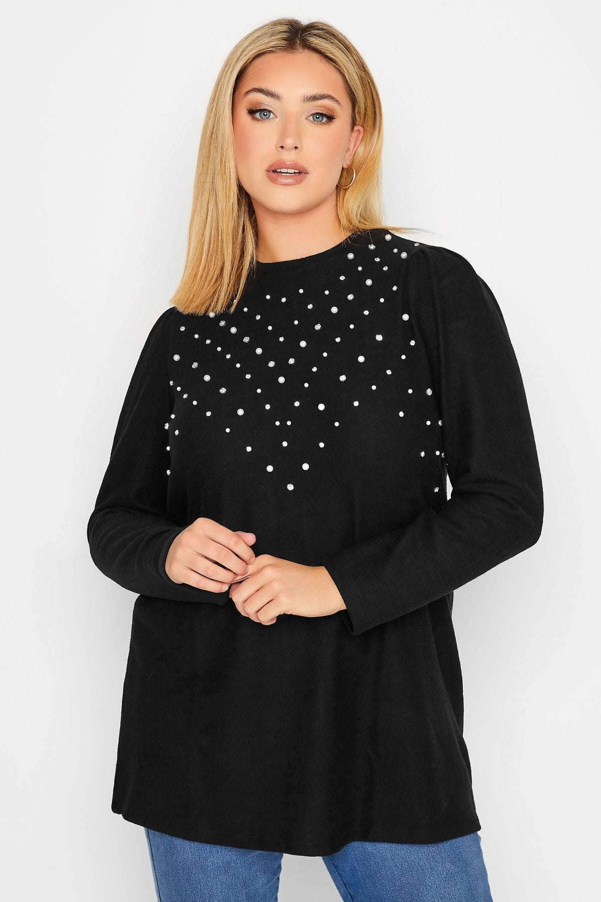 Büyük Beden Bisiklet Yaka Yumuşak Dokulu İnci İşlemeli Bluz 301421