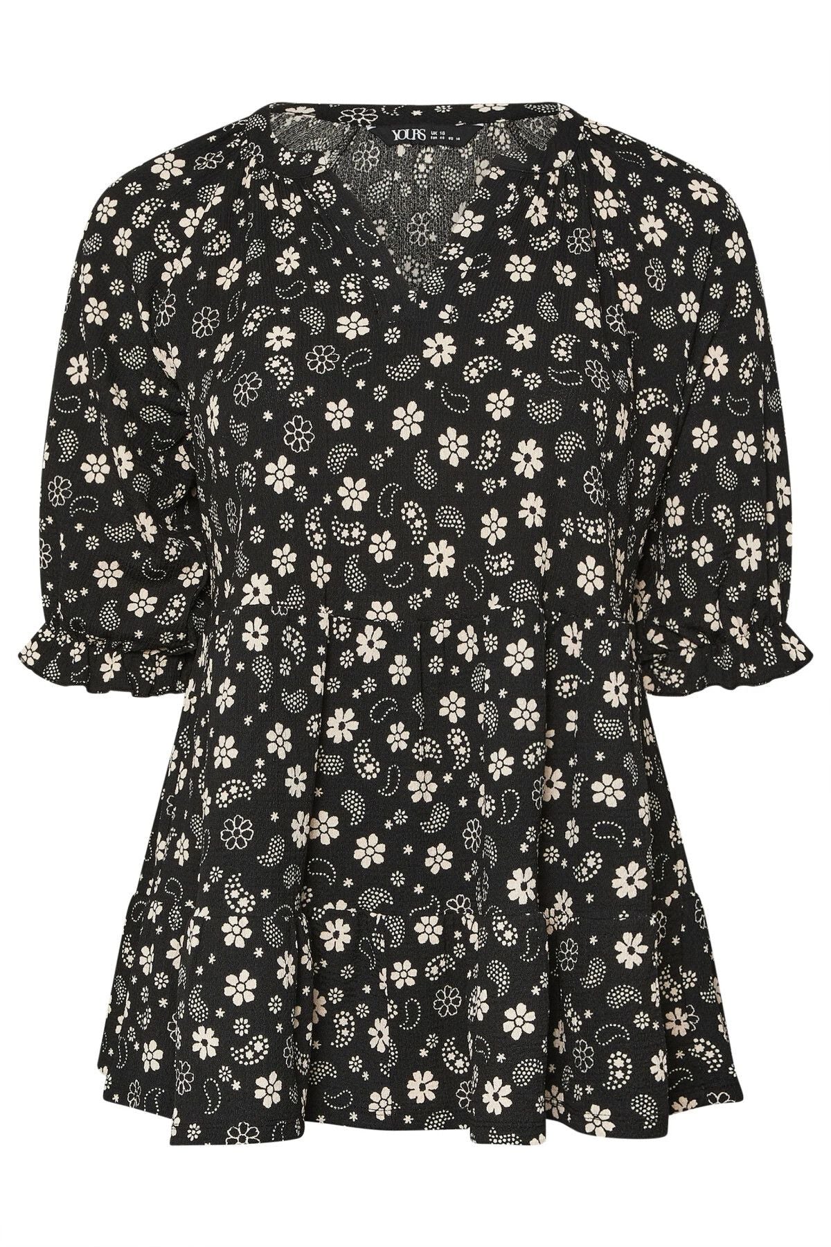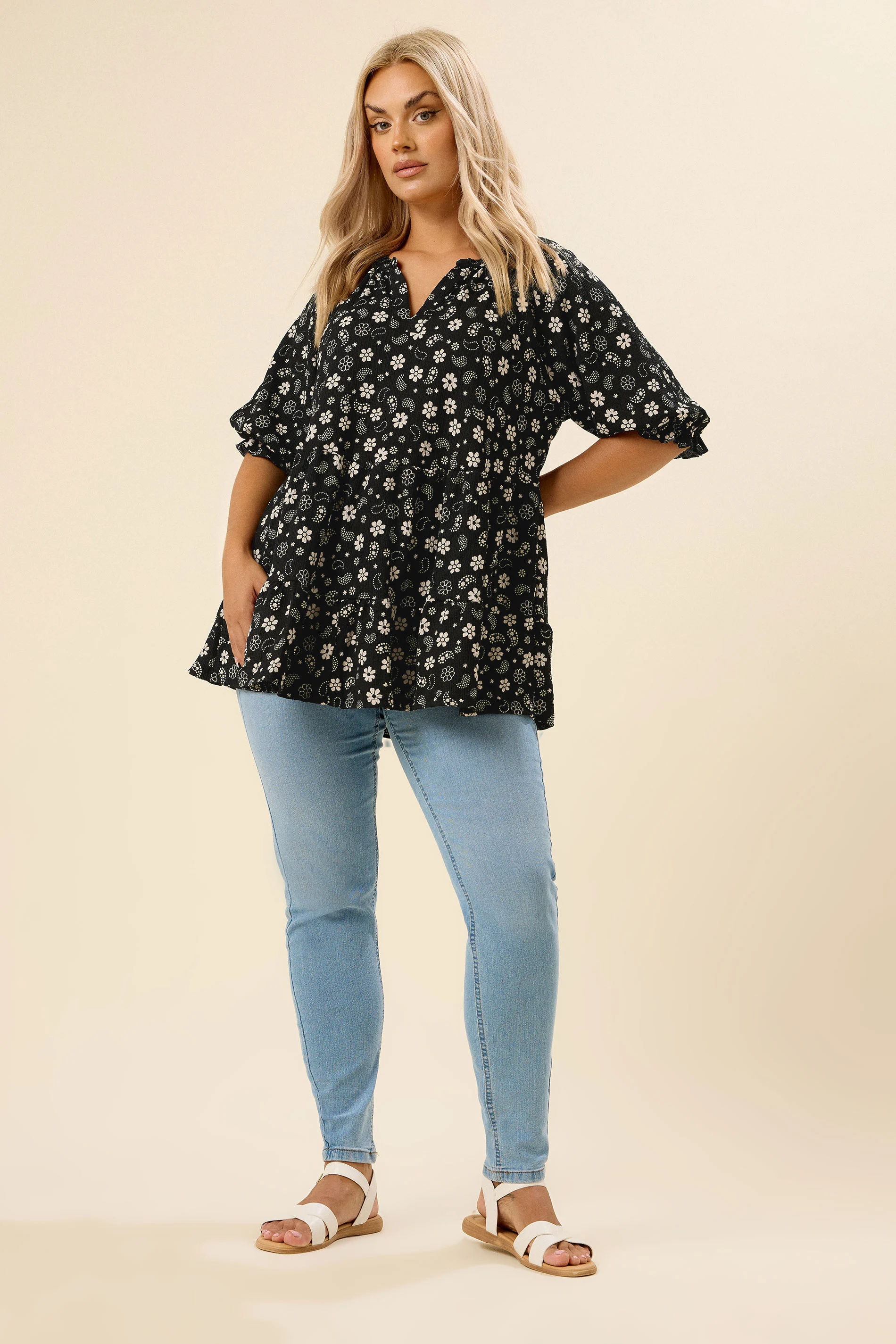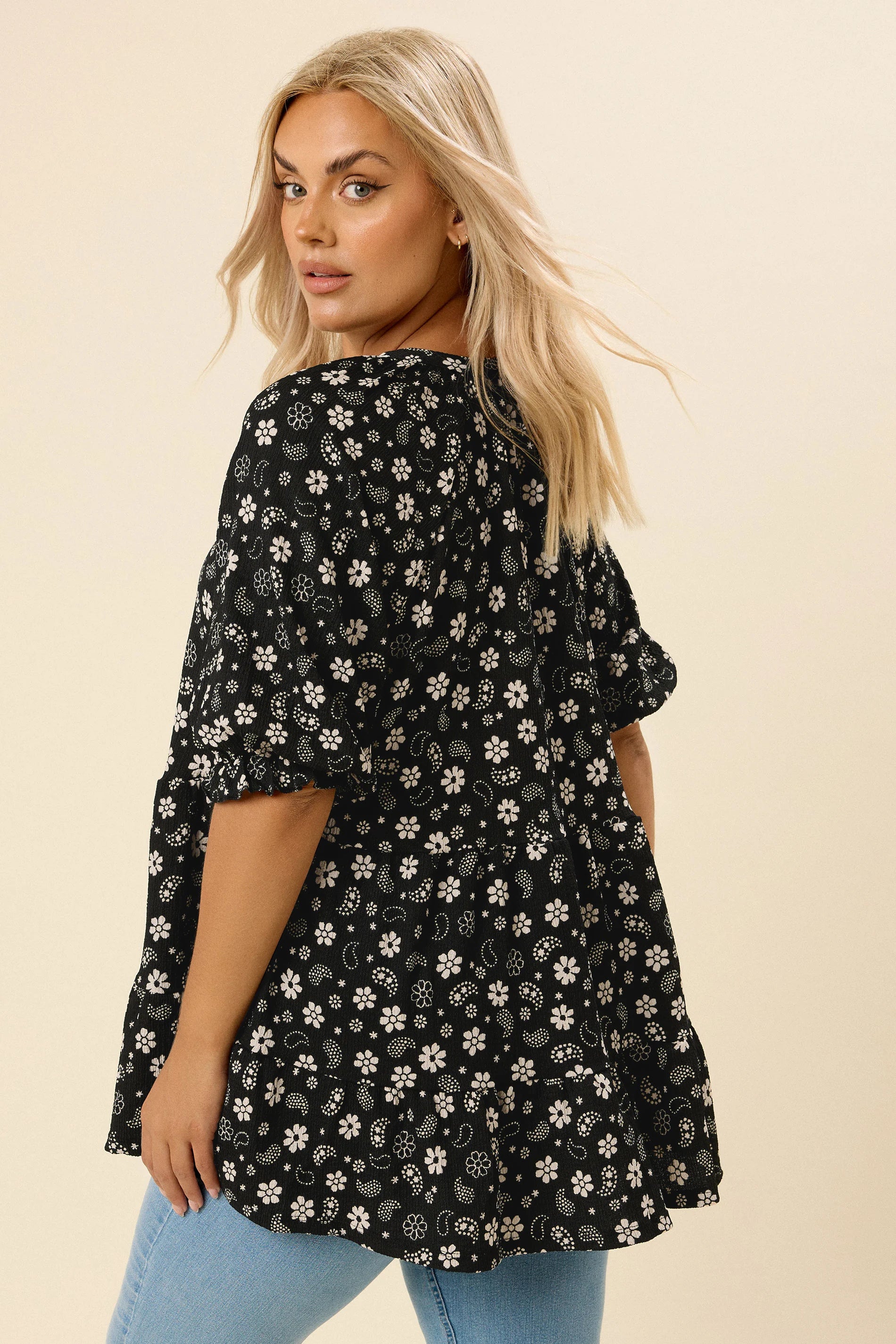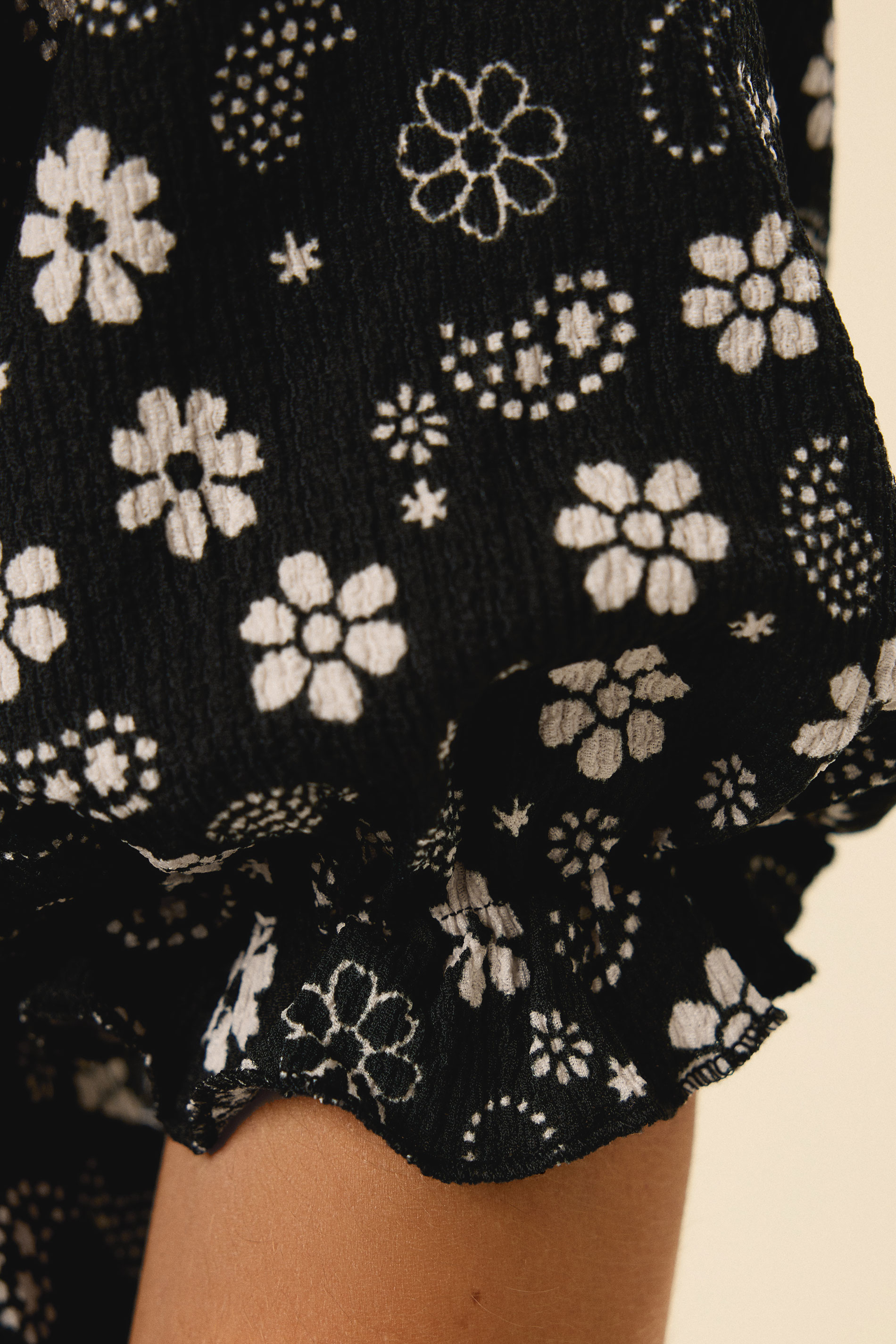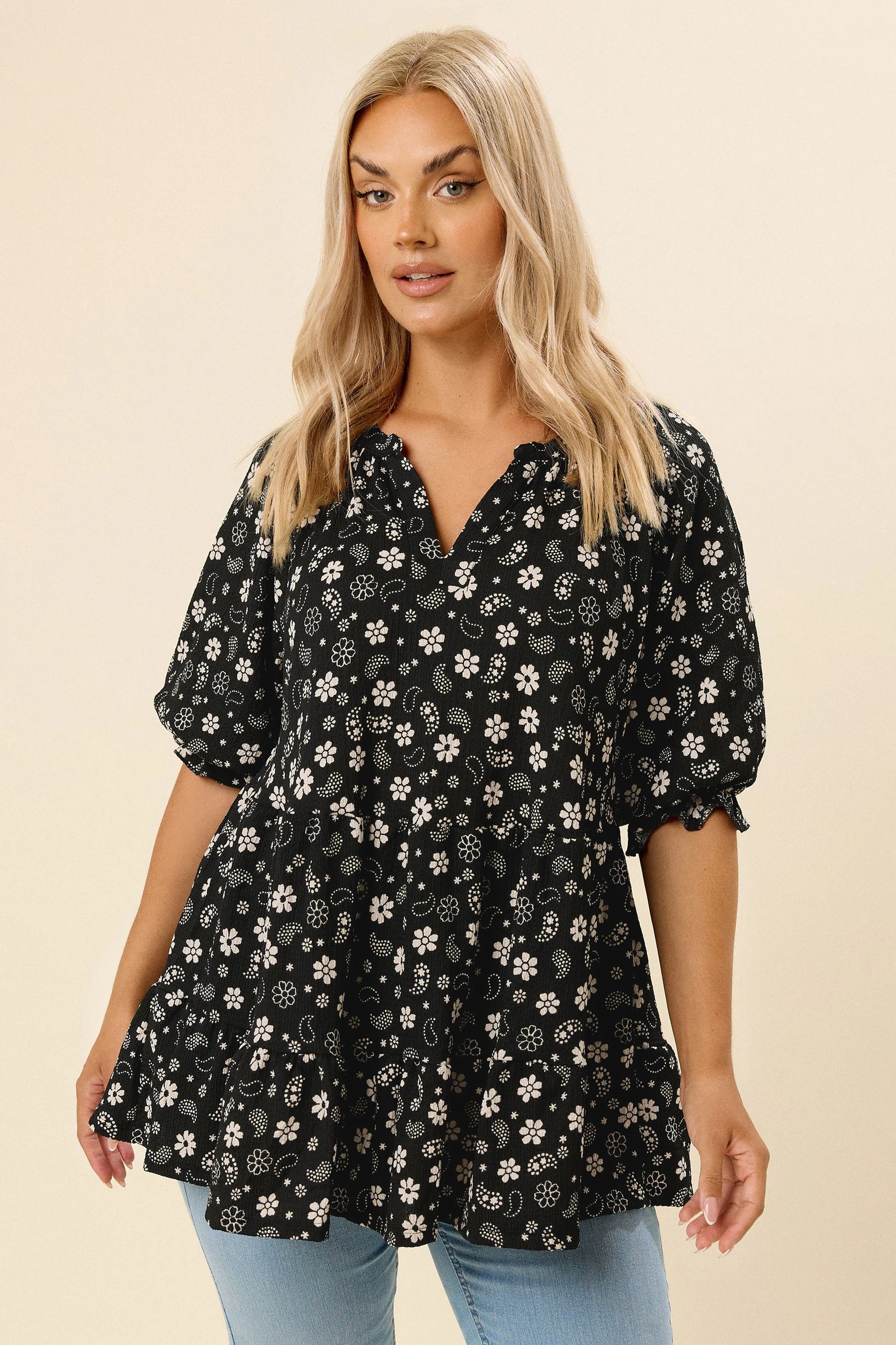 Model Detayı: Çiçekli şal deseni, çentik yaka, kat kat model, kısa kol.
