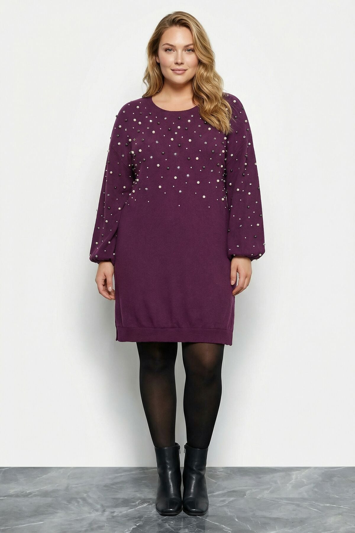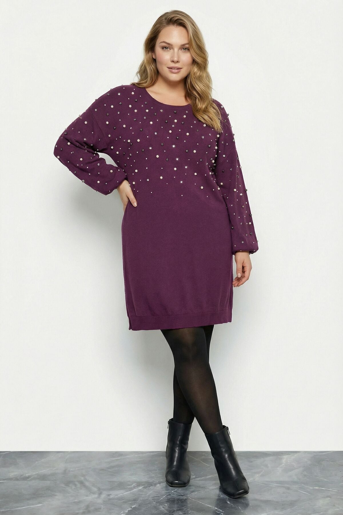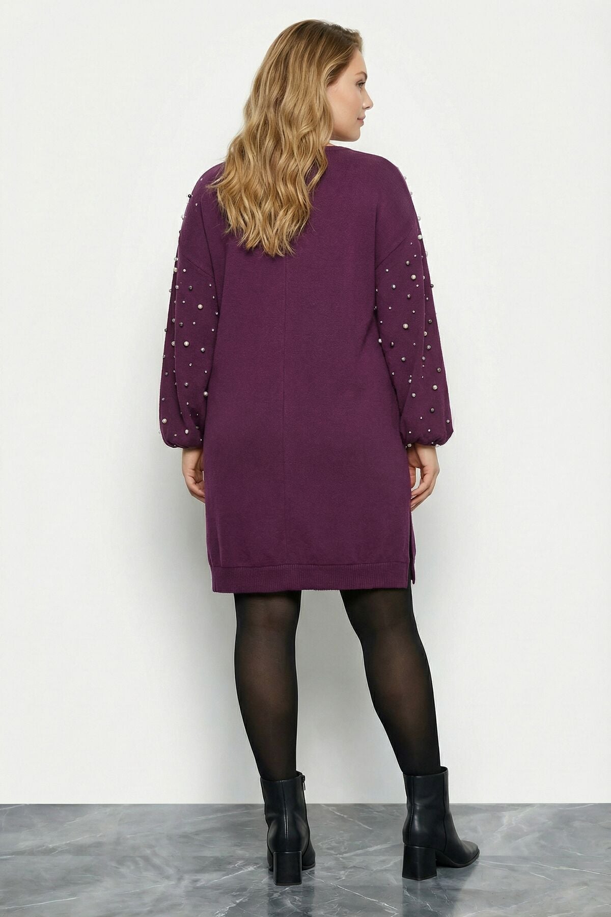 Büyük Beden İnci ve Taş Nakışlı Yumuşak Dokulu Mor Elbise 616396