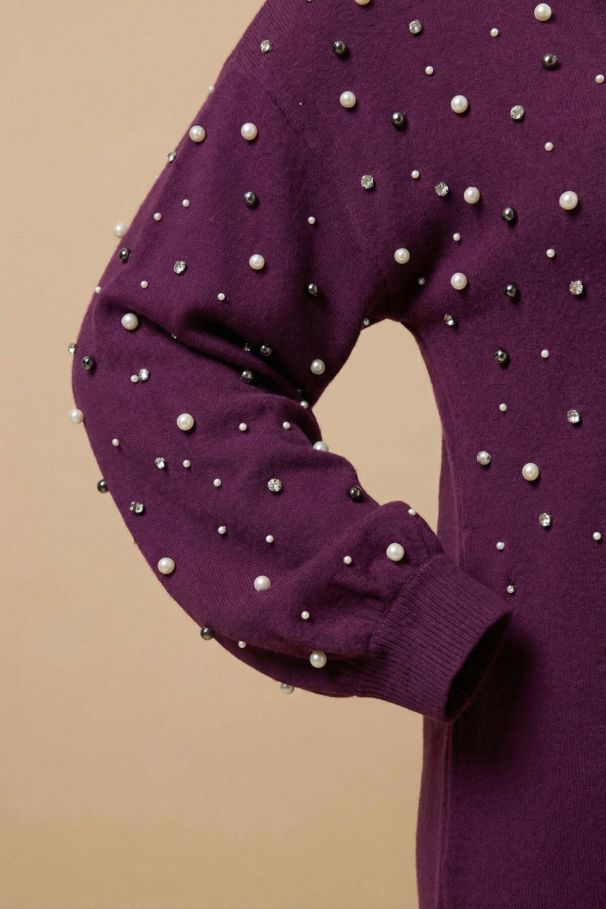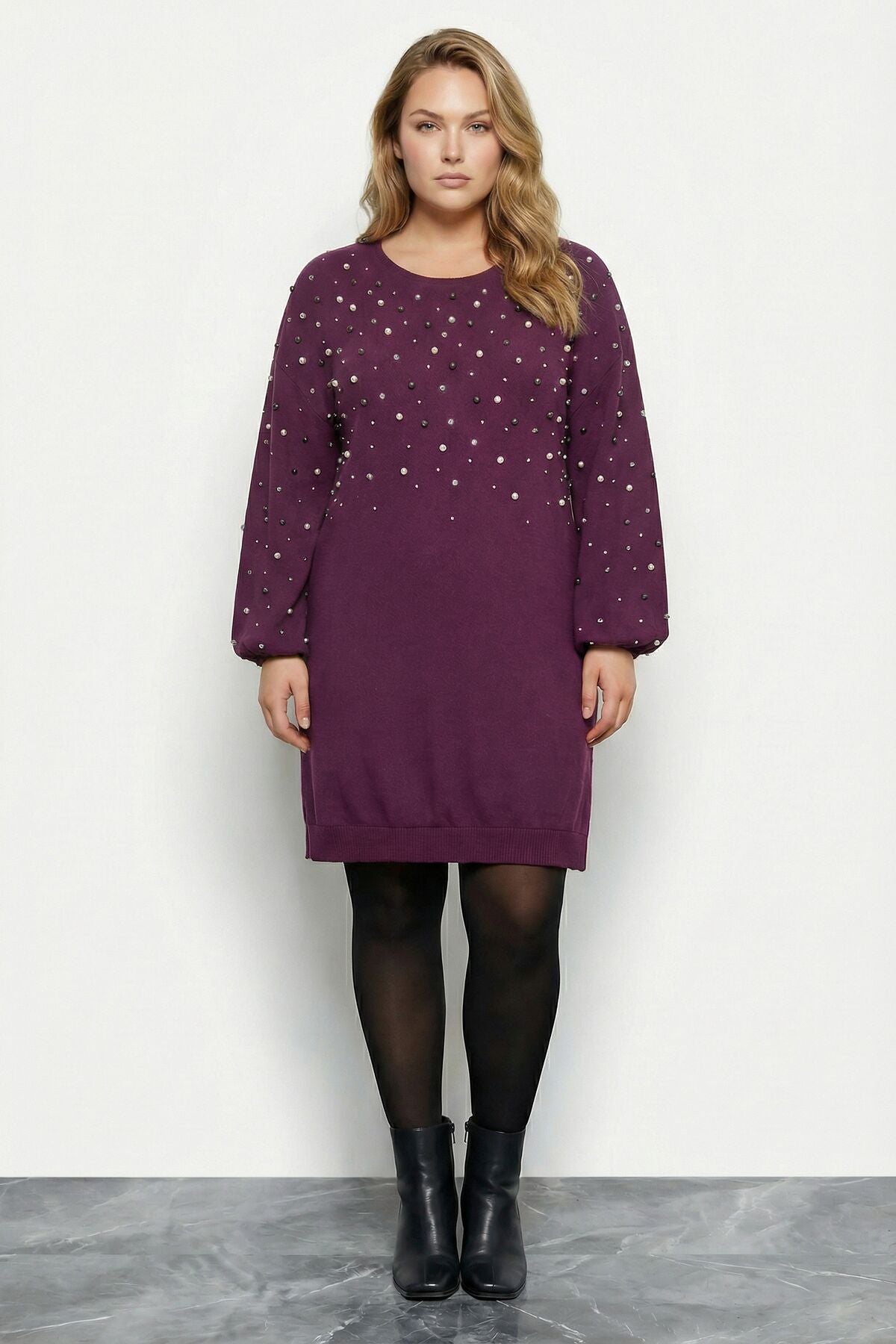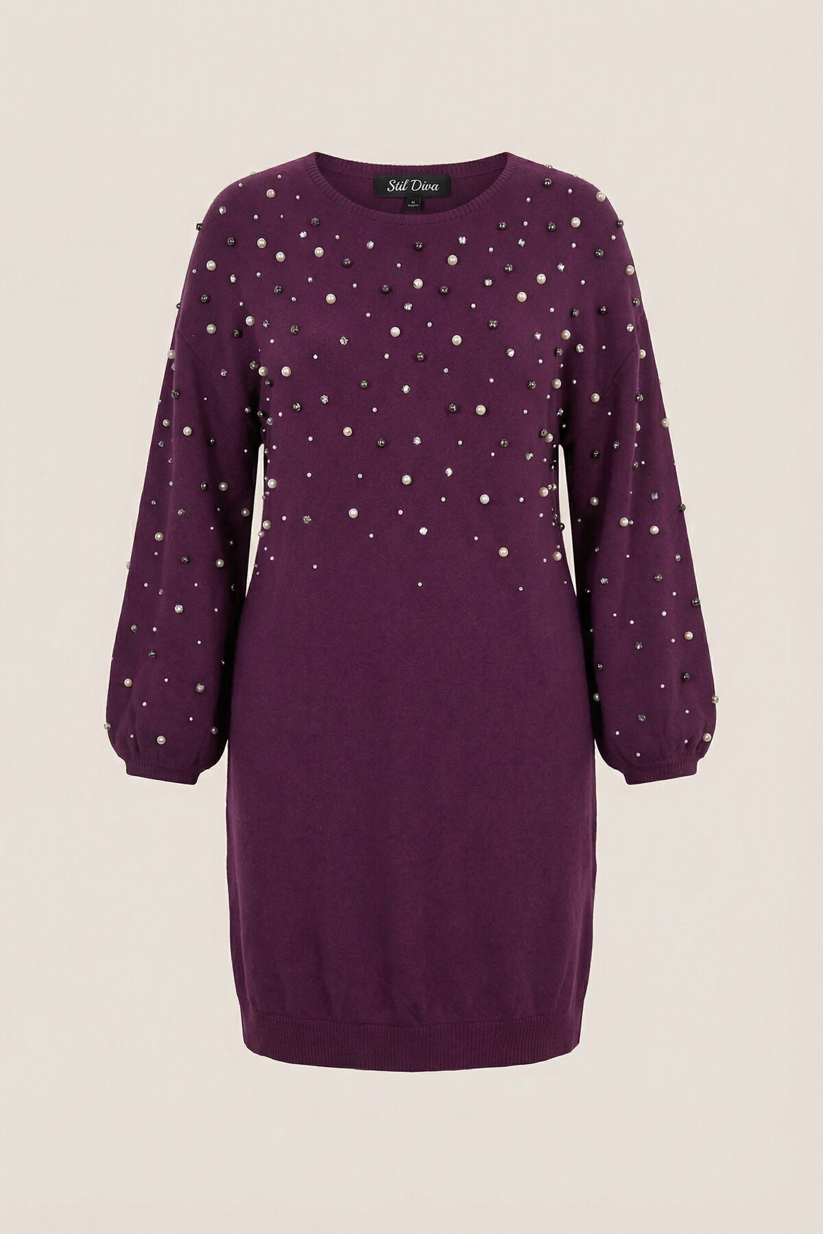Büyük Beden İnci ve Taş Nakışlı Yumuşak Dokulu Mor Elbise 616396
