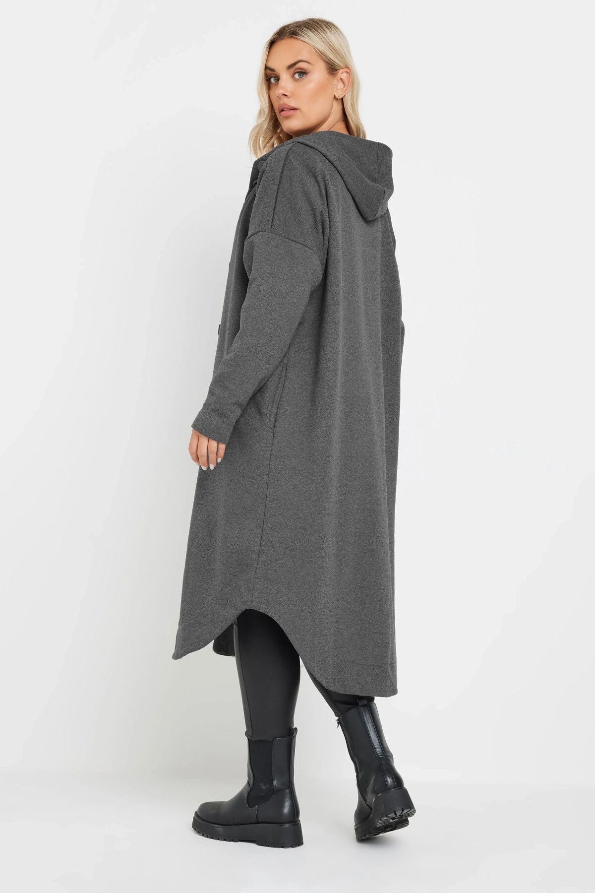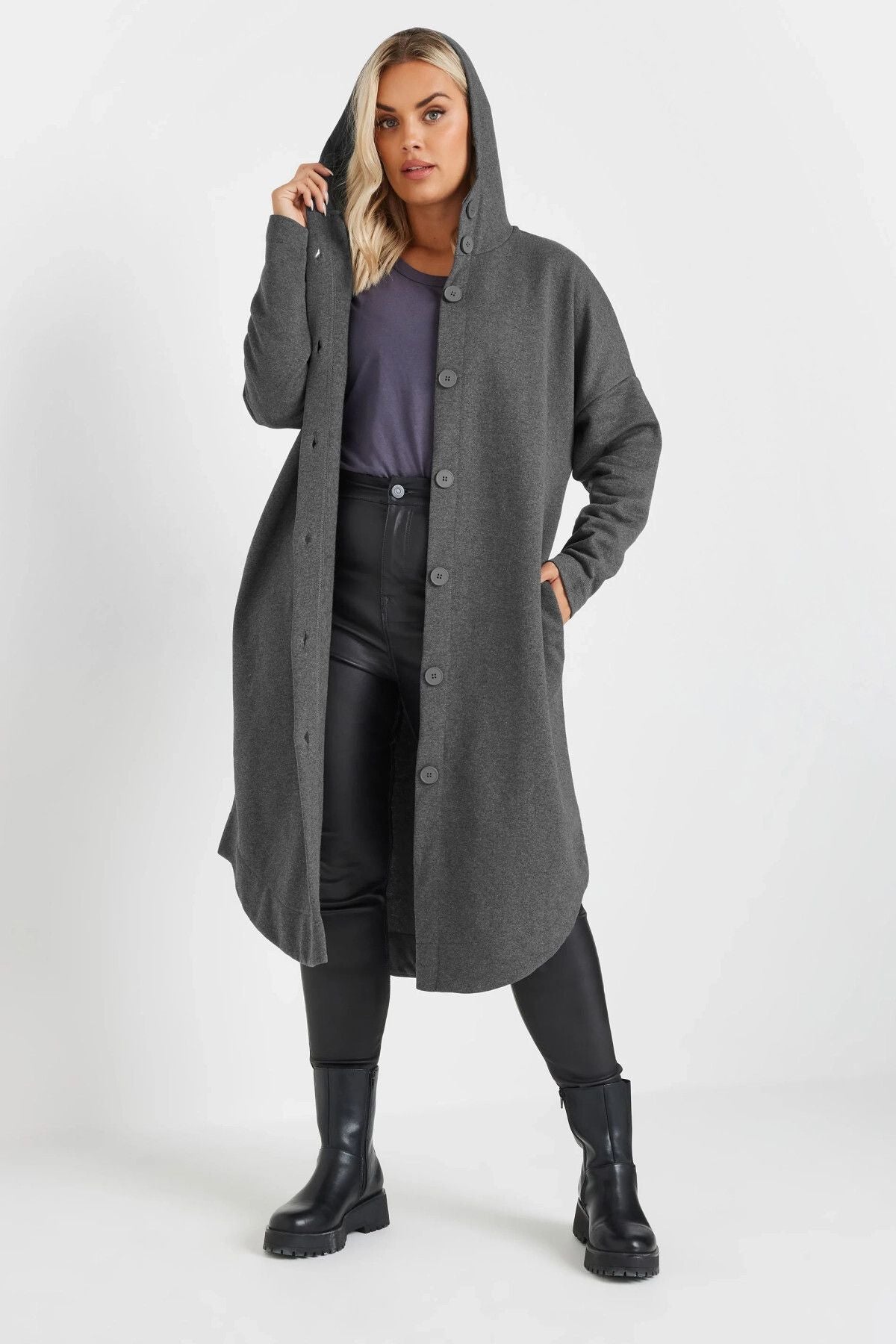 Model Detayı: Düğmeli, Kapüşonlu Tasarım, Uzun Kollu, İki Yan Cep, Midi Boy