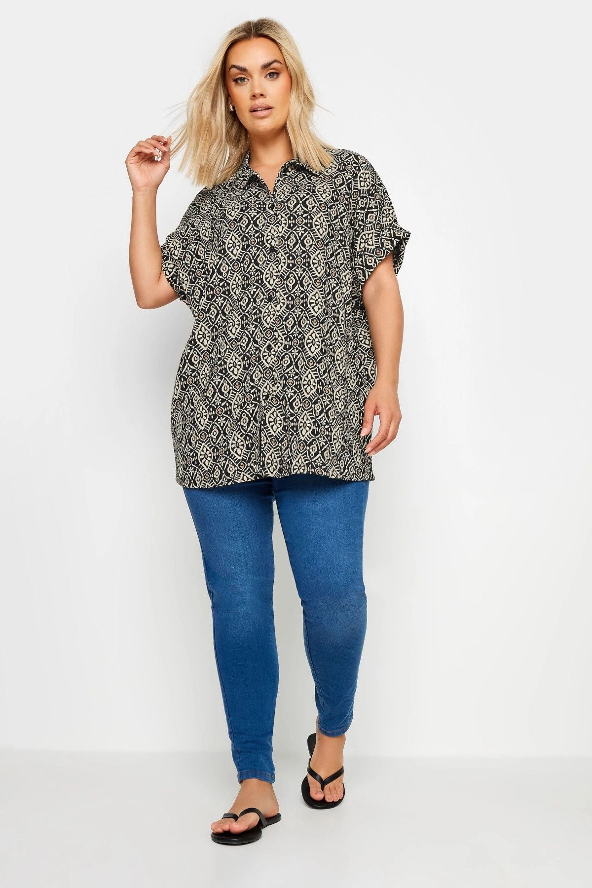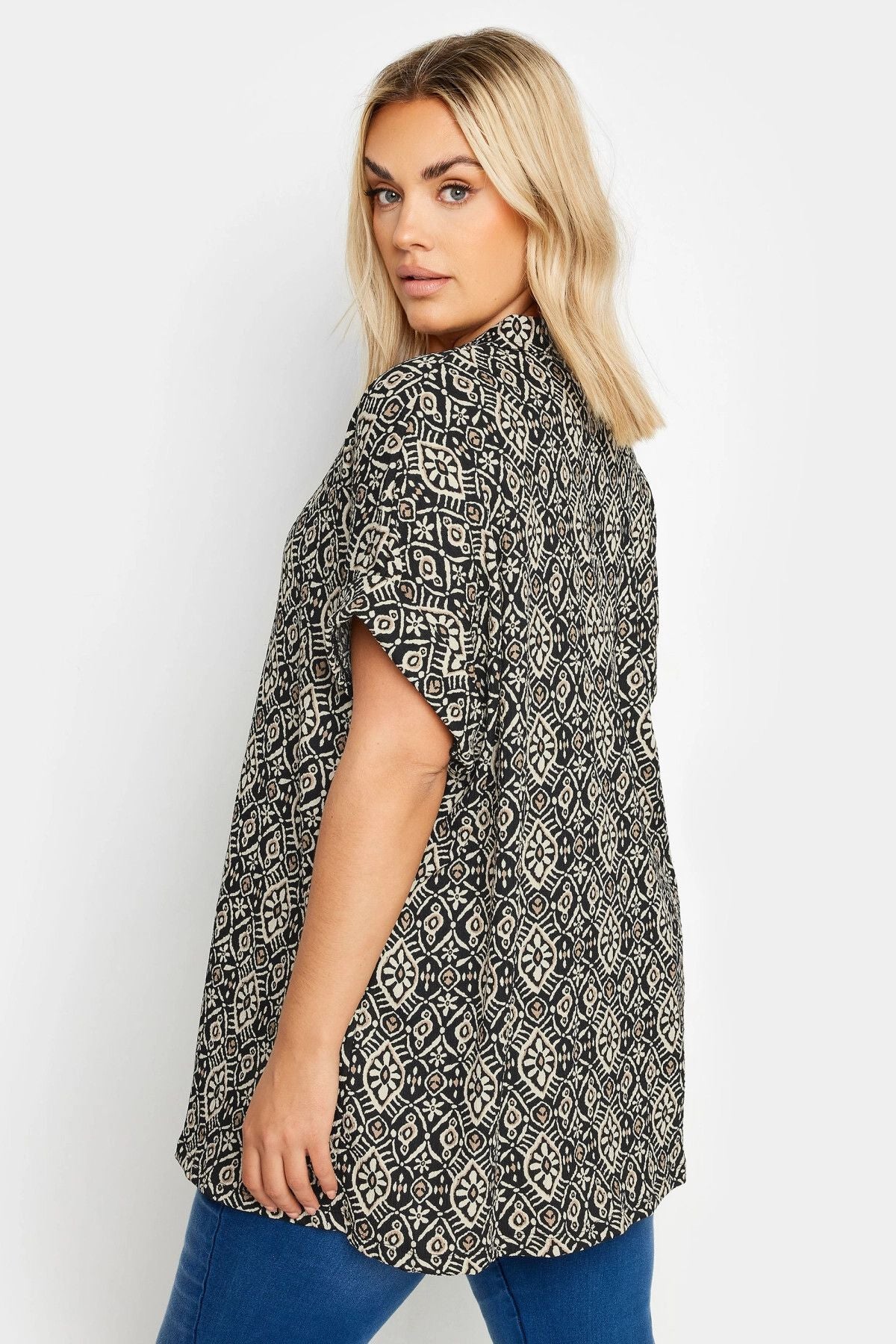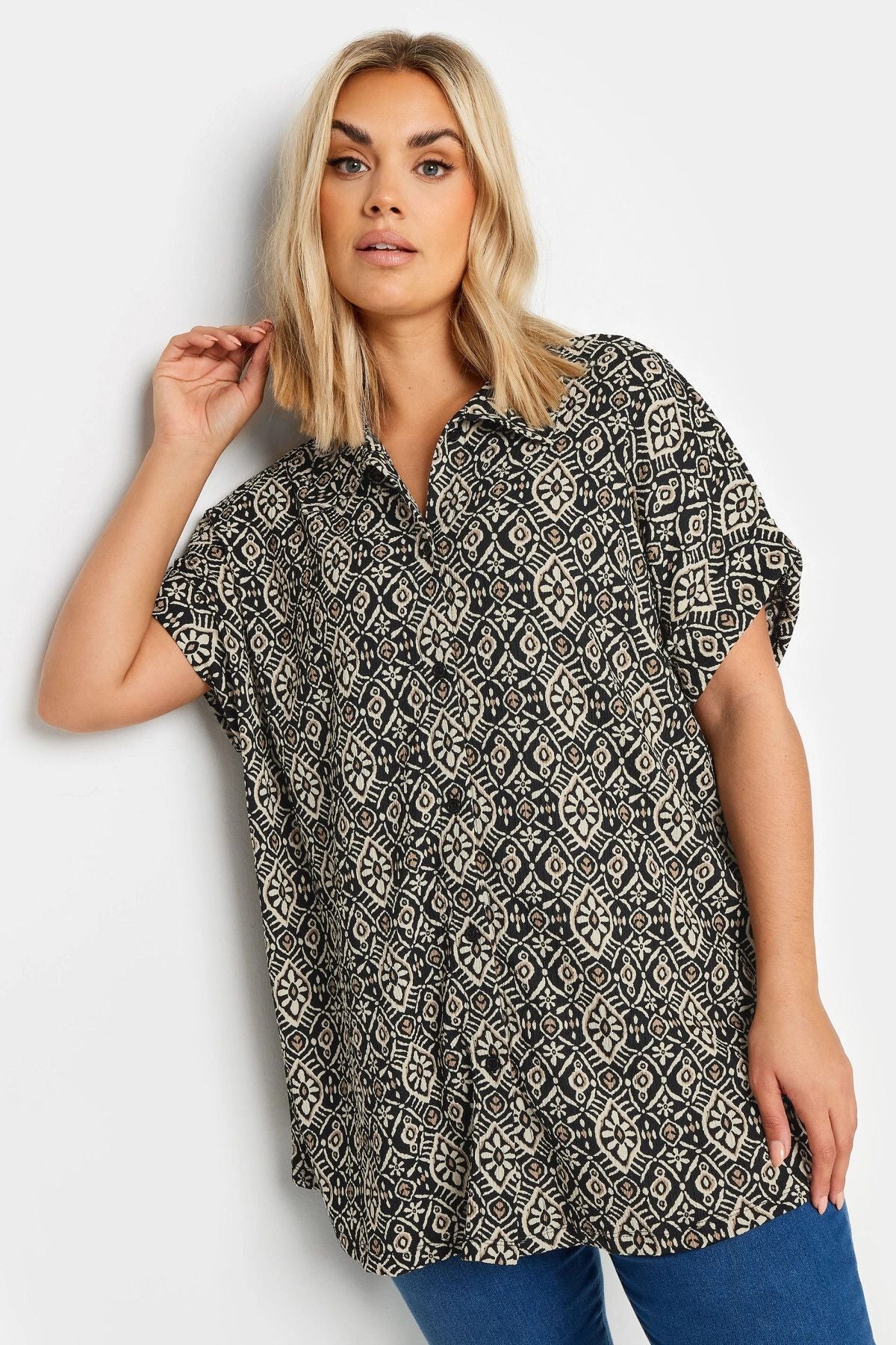 Model Detayı: Siyah zemin üzerine beyaz geometrik desenli, klasik gömlek yakalı, düğmeli ön kapama, kısa kollu