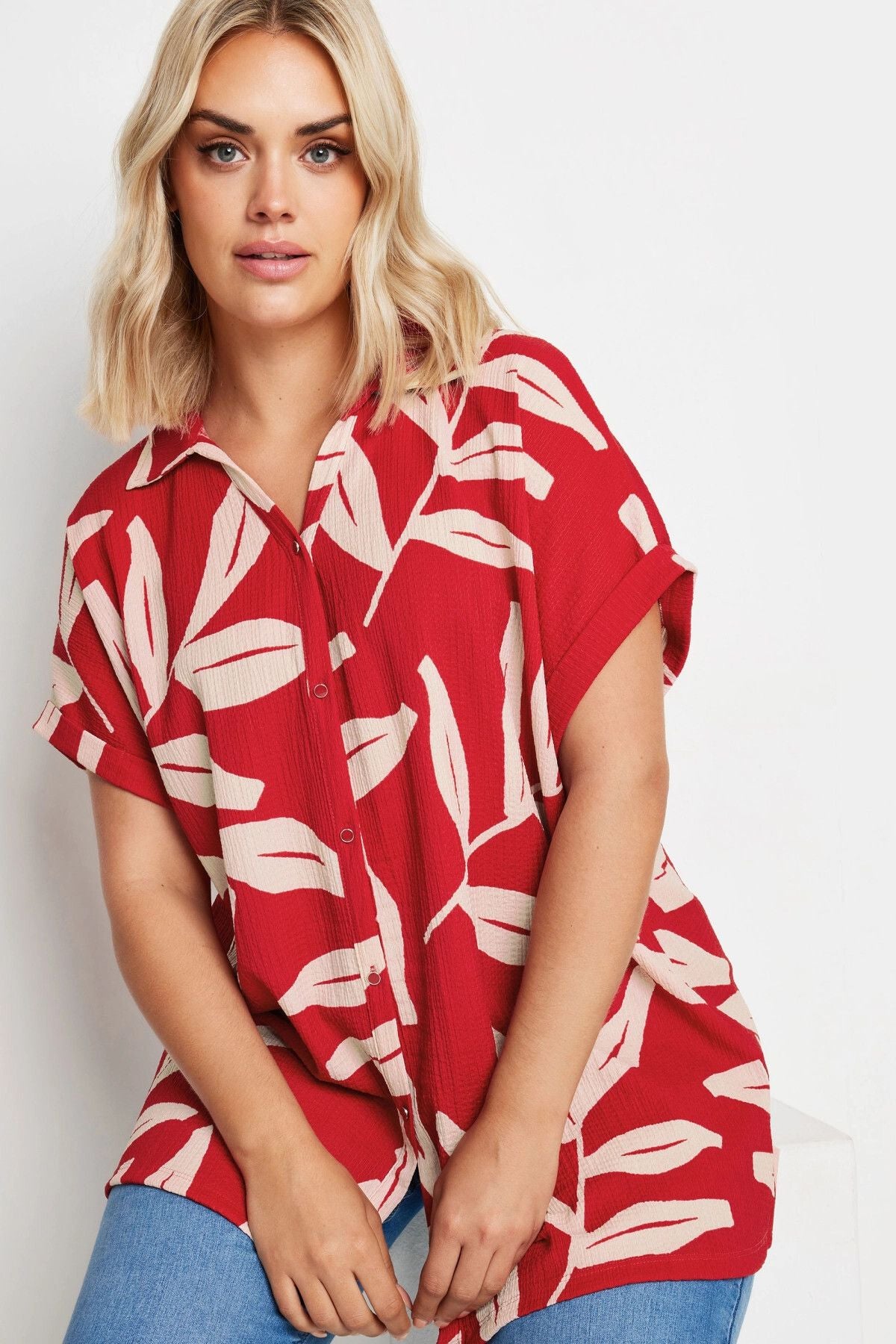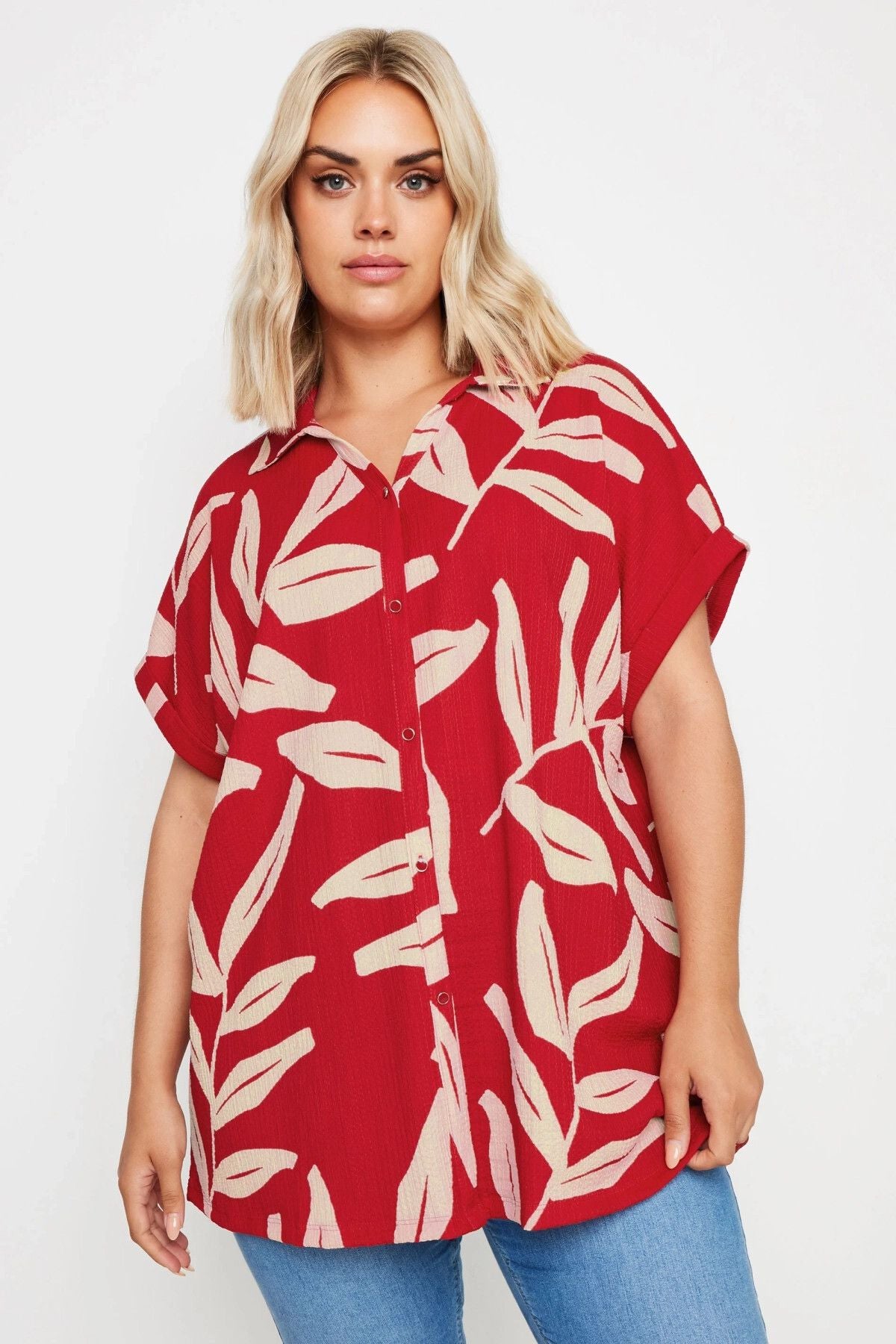 Model Detayı: Kırmızı zemin üzerine bej yaprak desenli, klasik gömlek yakalı, düğmeli ön kapama, kısa kimono kollu, krinkıl dokulu