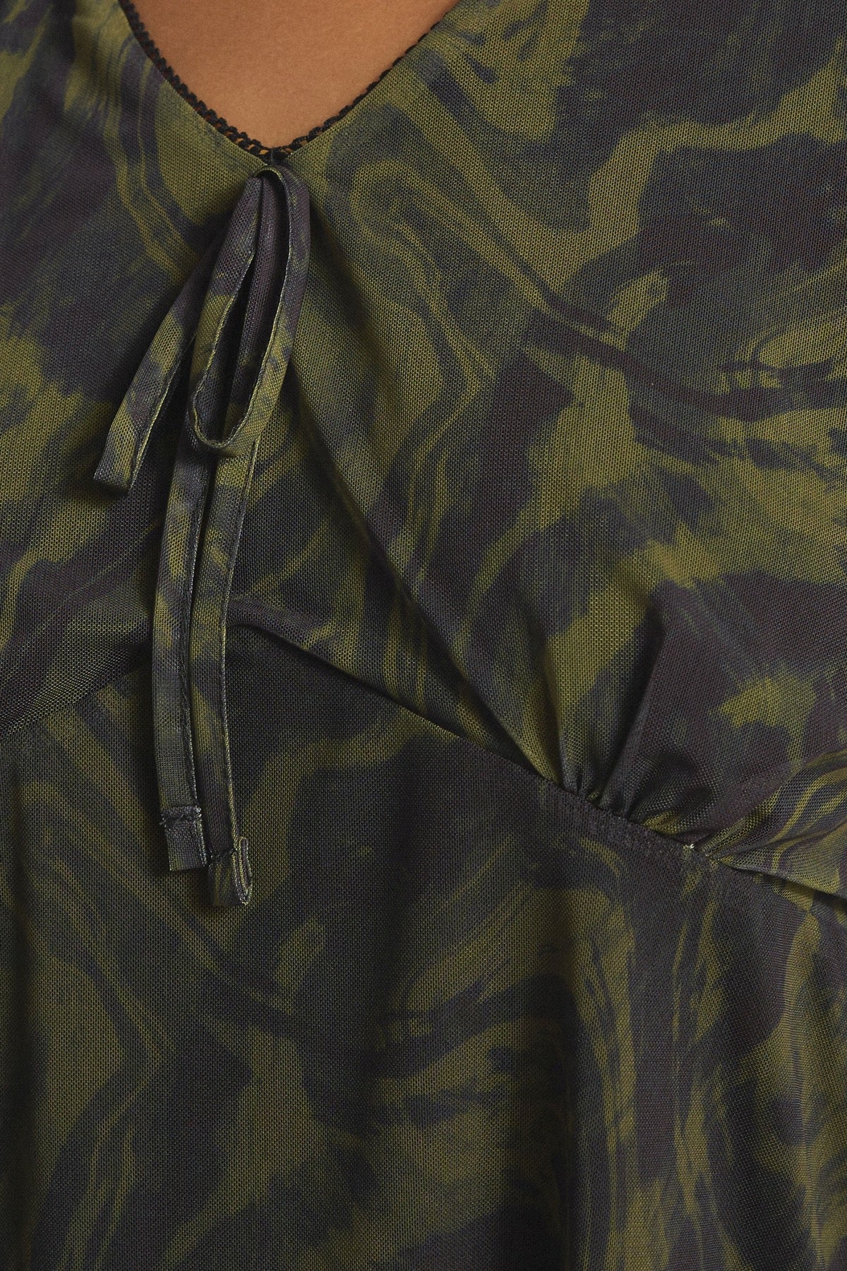 Model Detayı: Dalgalı desenli, V yaka, yaka kenarı pikolu (ince fırfırlı), önü fiyonk detaylı, kısa kollu, içi astarlı.