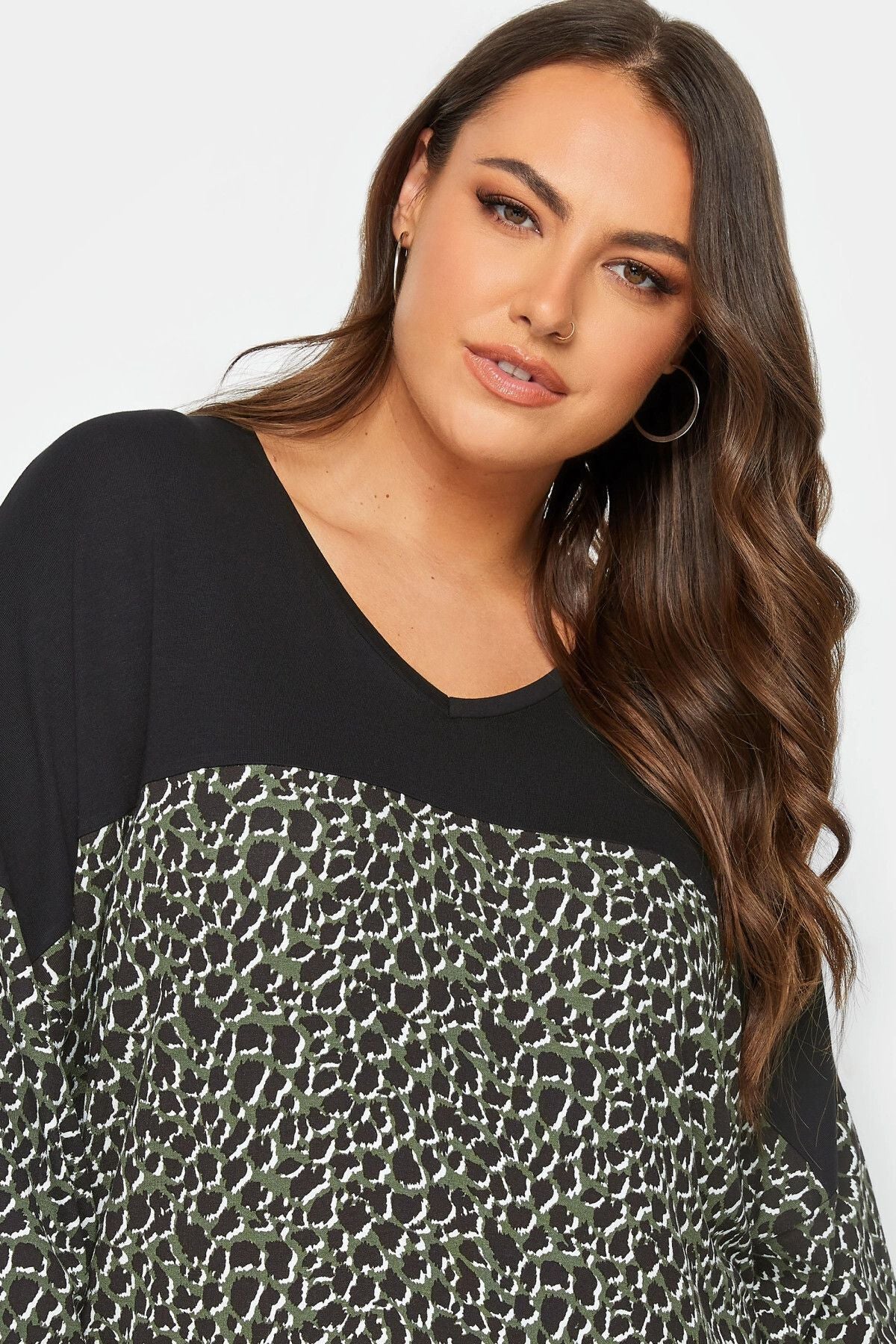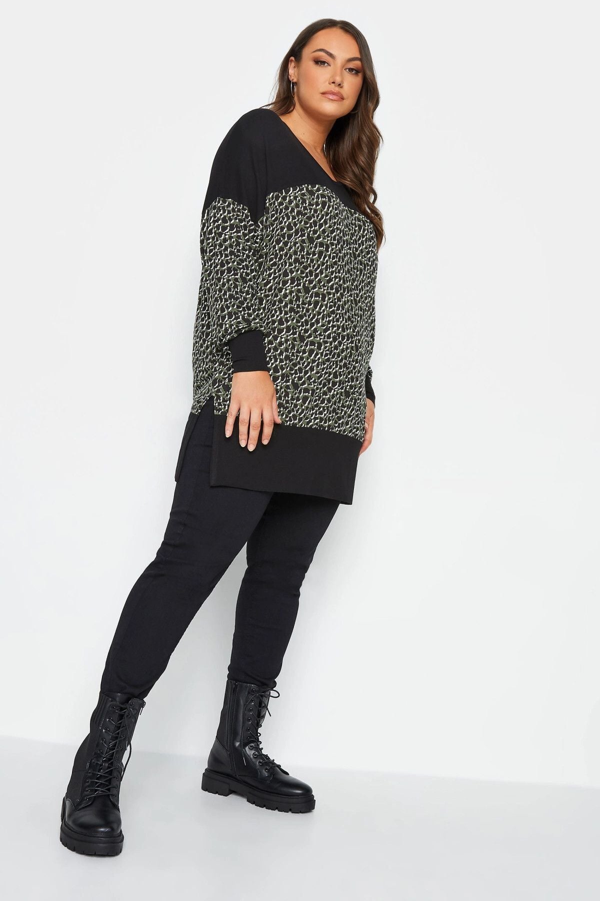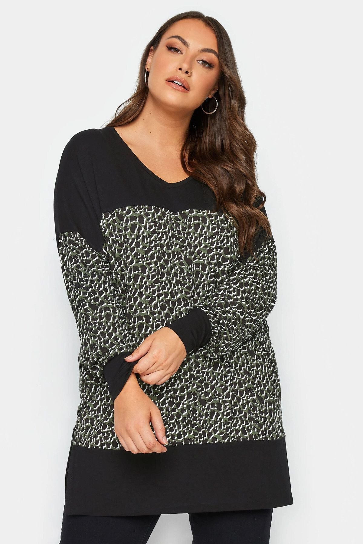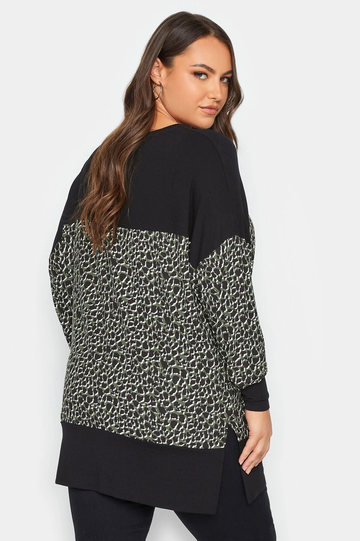 Büyük Beden Leopar Desenli Esnek Kumaş Uzun Kollu Uzun Kesim Bluz 302498