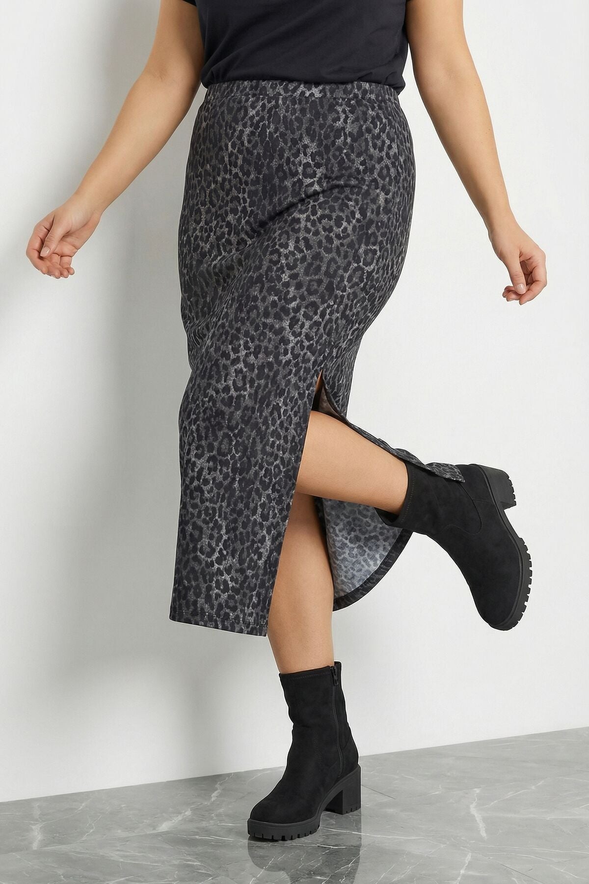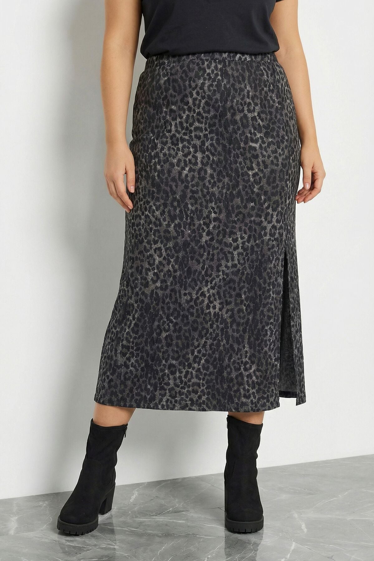 Büyük Beden Leopar Desenli Yırtmaçlı Kalem Etek 160379
