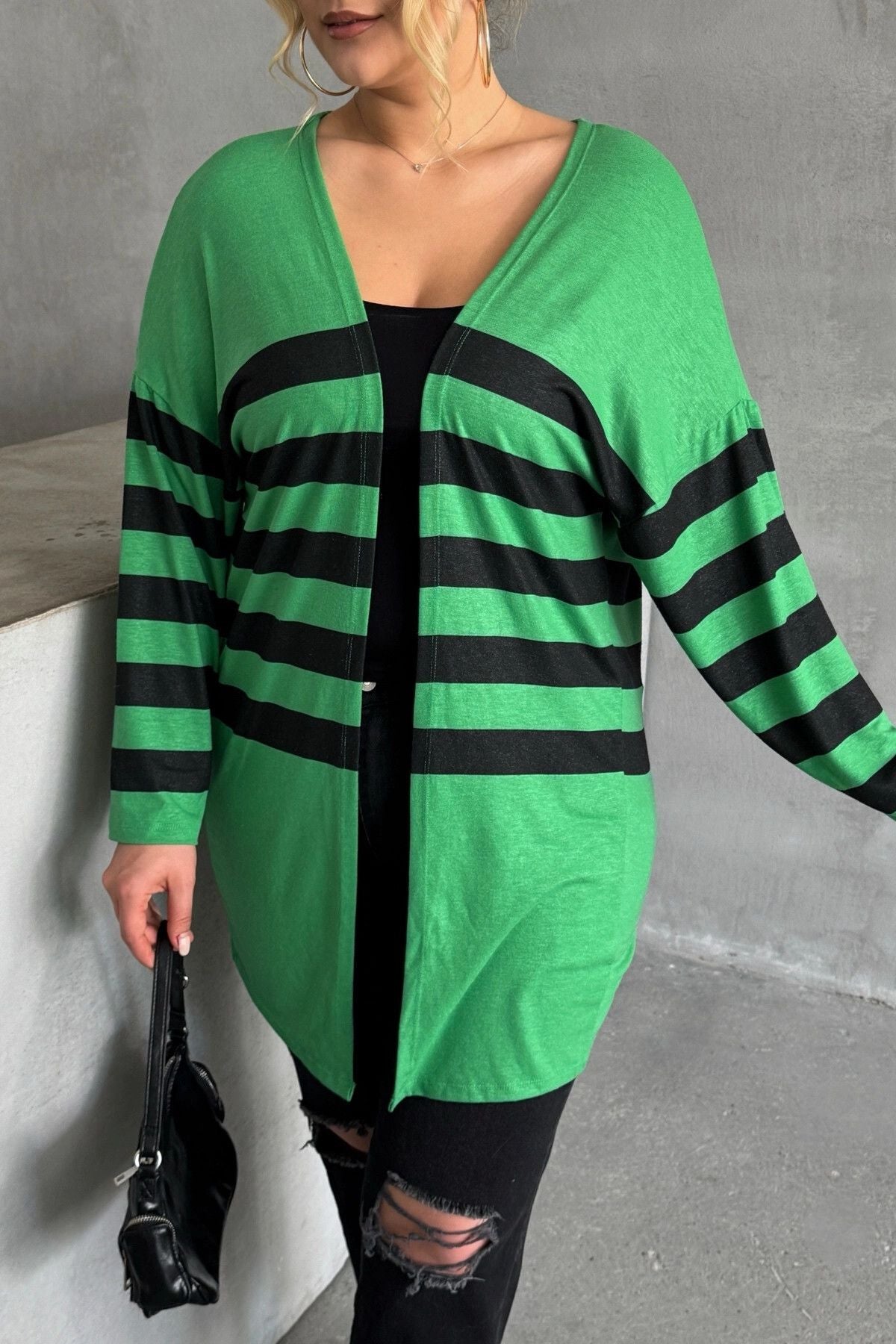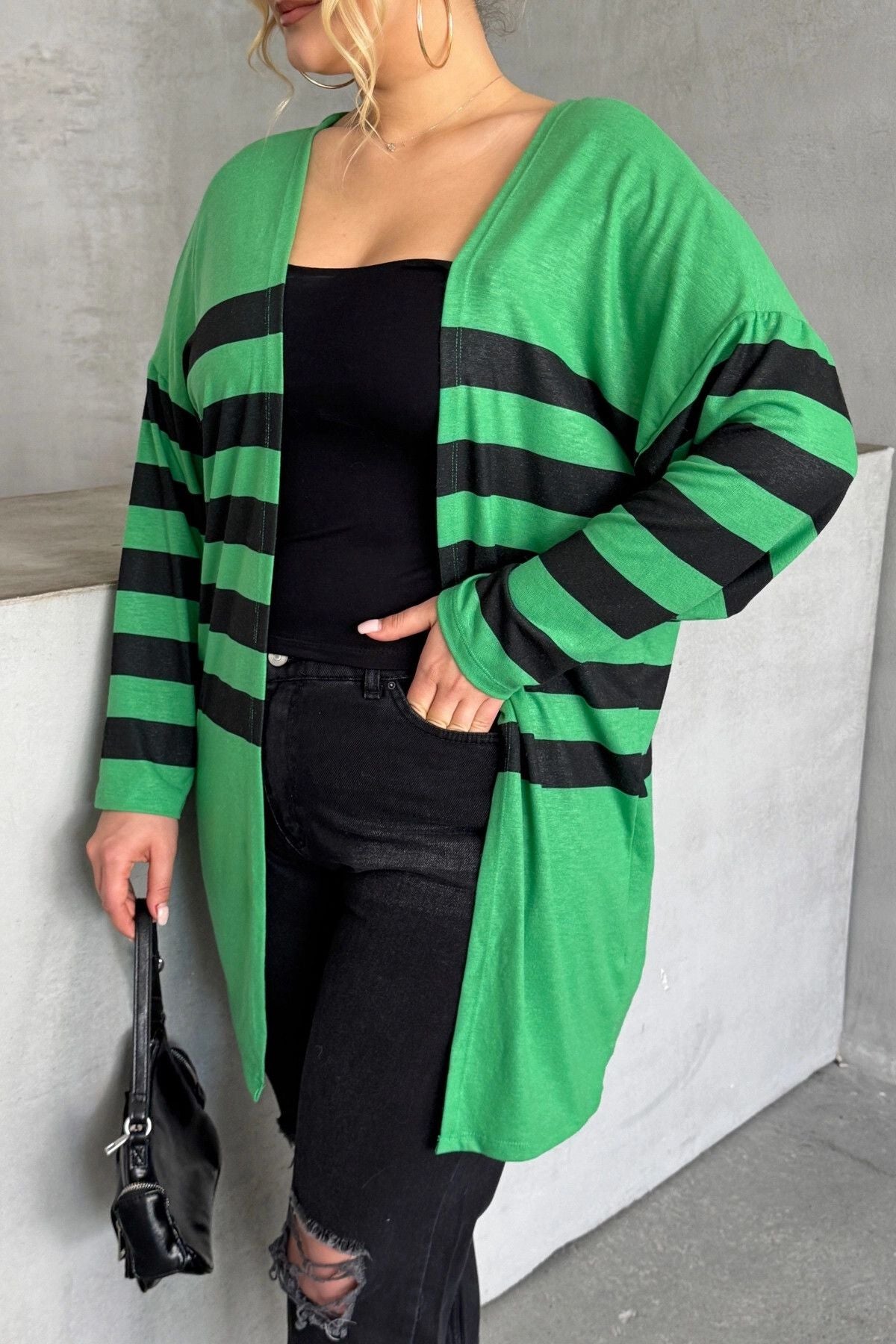 Büyük Beden Midi Boy Uzun Kollu Çizgili İnce Hırka 301568