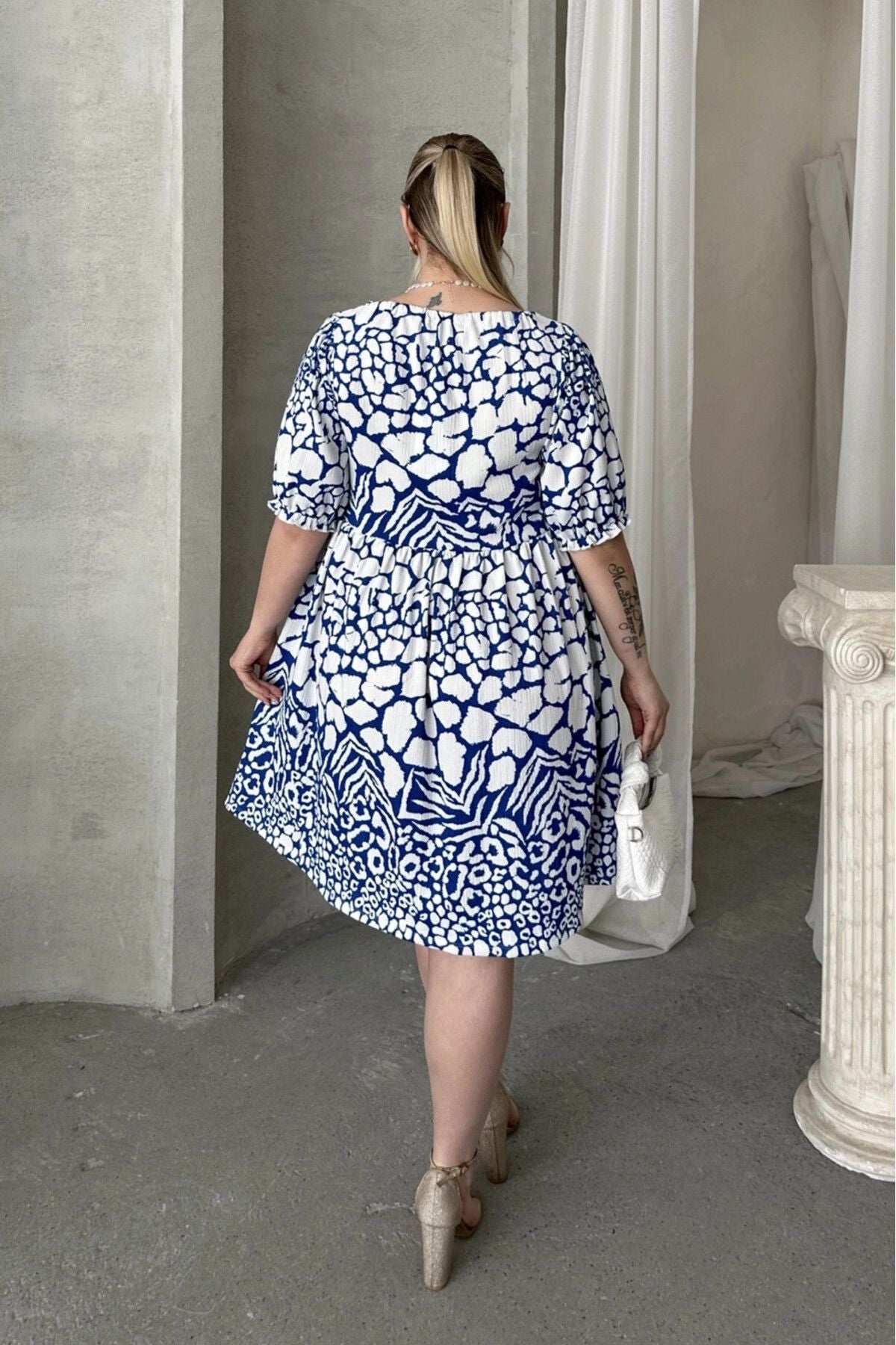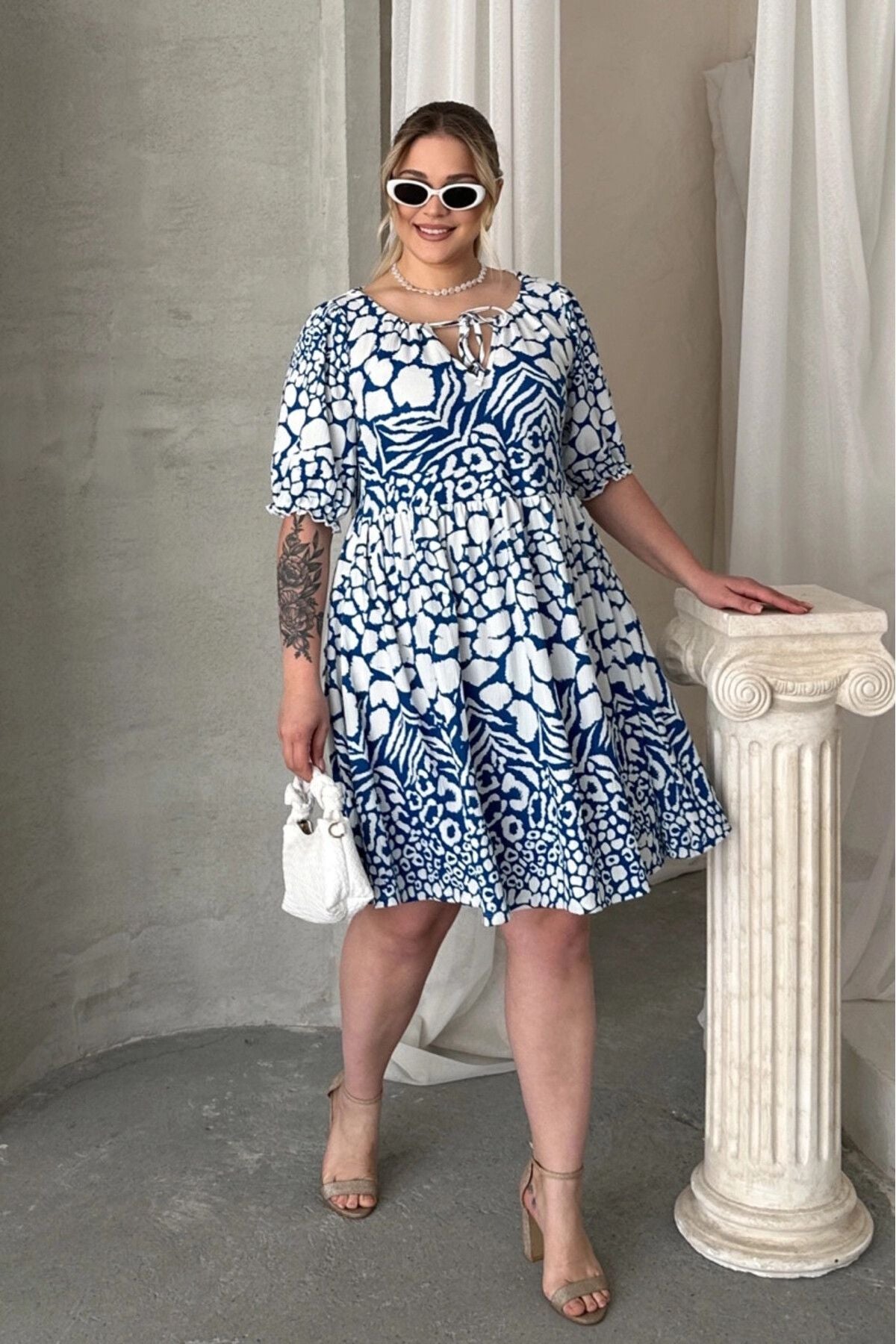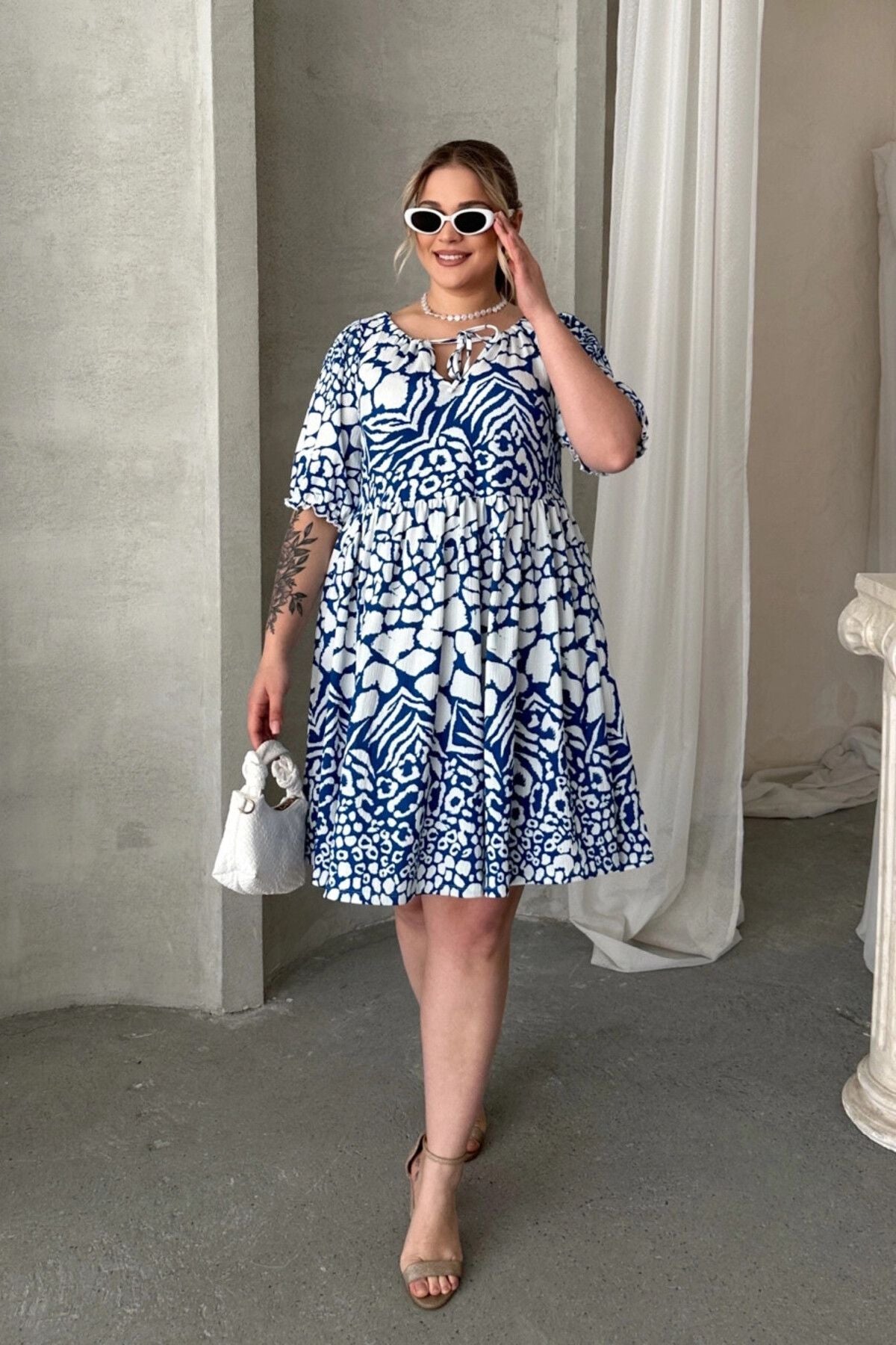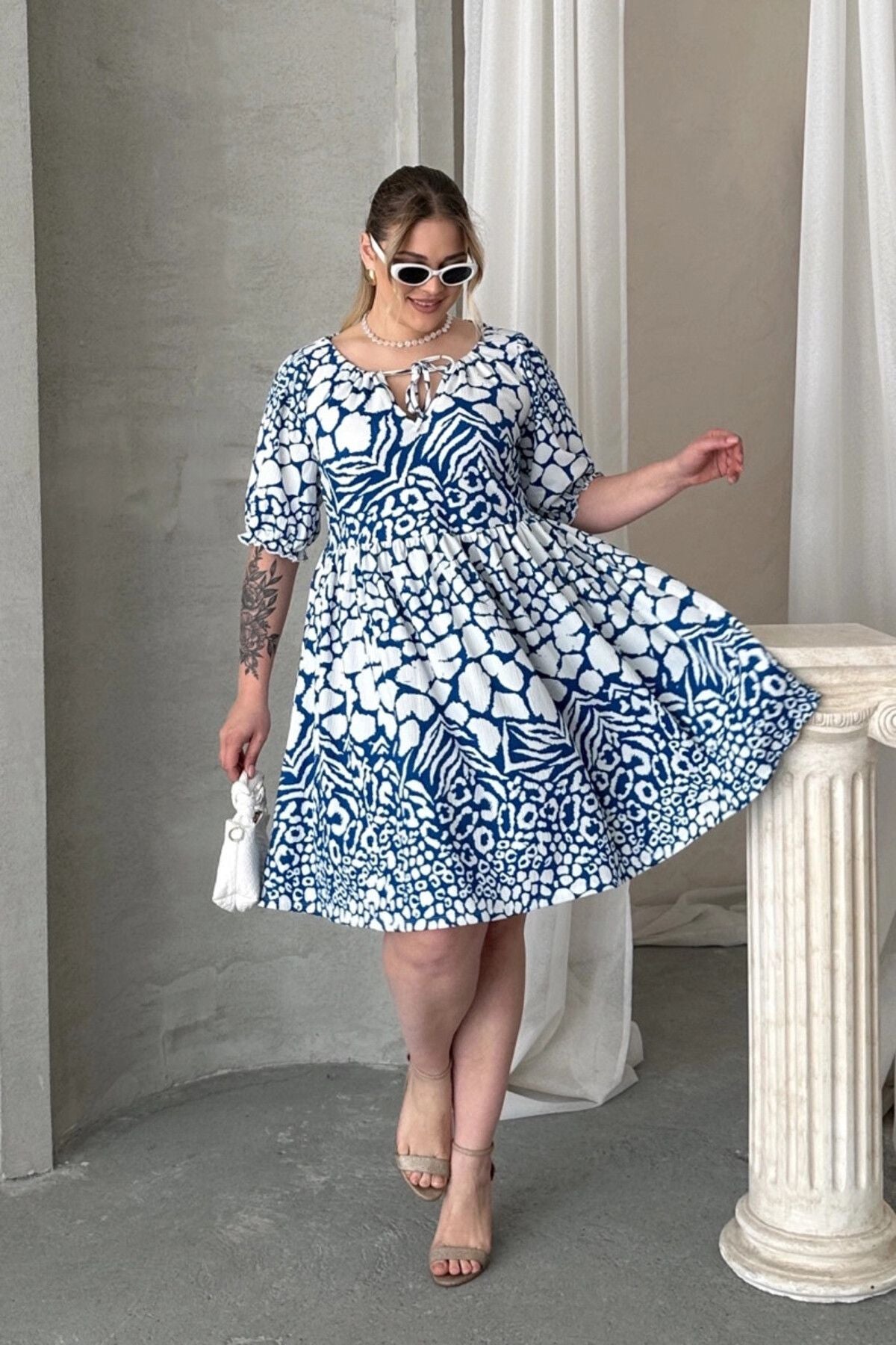 Moda Notu: Yazın enerjisini yansıtan bu hayvan desenli mini elbise, önündeki bağlama detayı ve rahat kesimiyle hem şık hem de konforlu bir seçenek sunuyor. Sandaletler ve sade aksesuarlarla kombinleyerek zahmetsiz bir yaz stili yaratabilirsiniz.