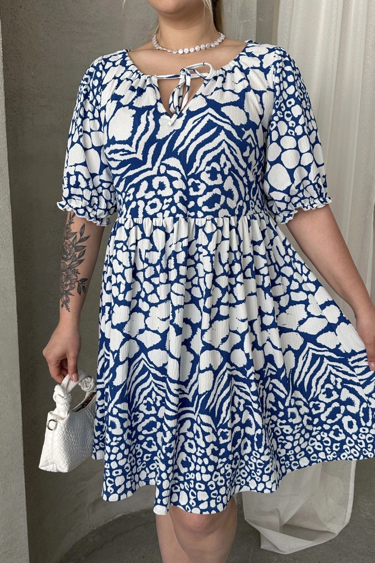 Model Detayı: Karışık Hayvan Desenli, Önü Bağlamalı, Yarım Kollu, Mini Elbise