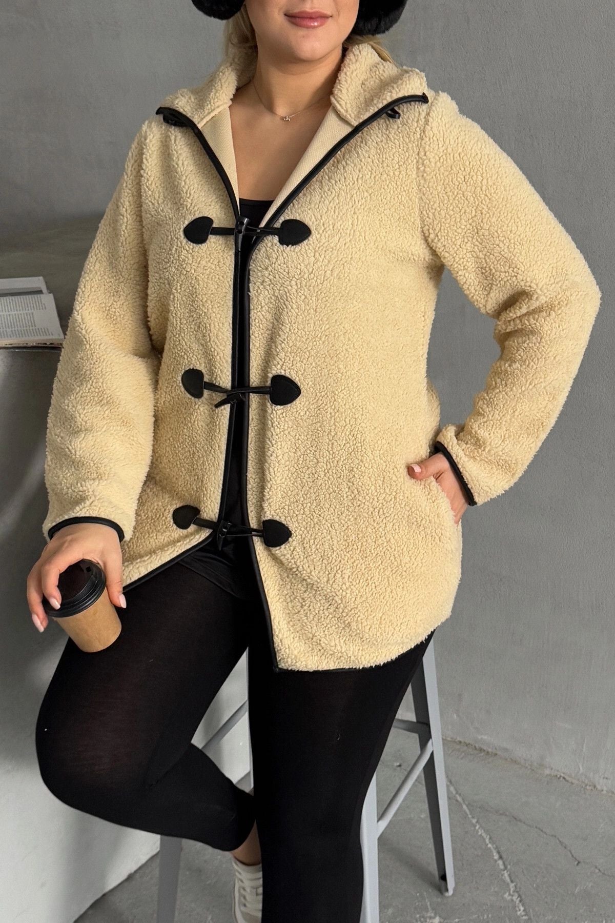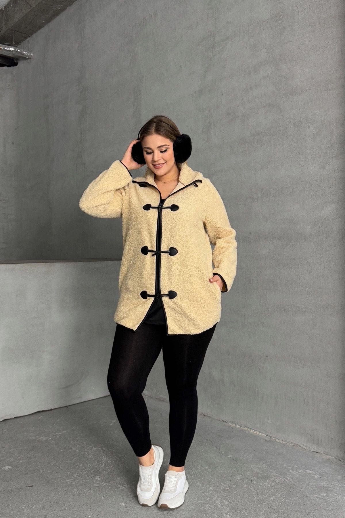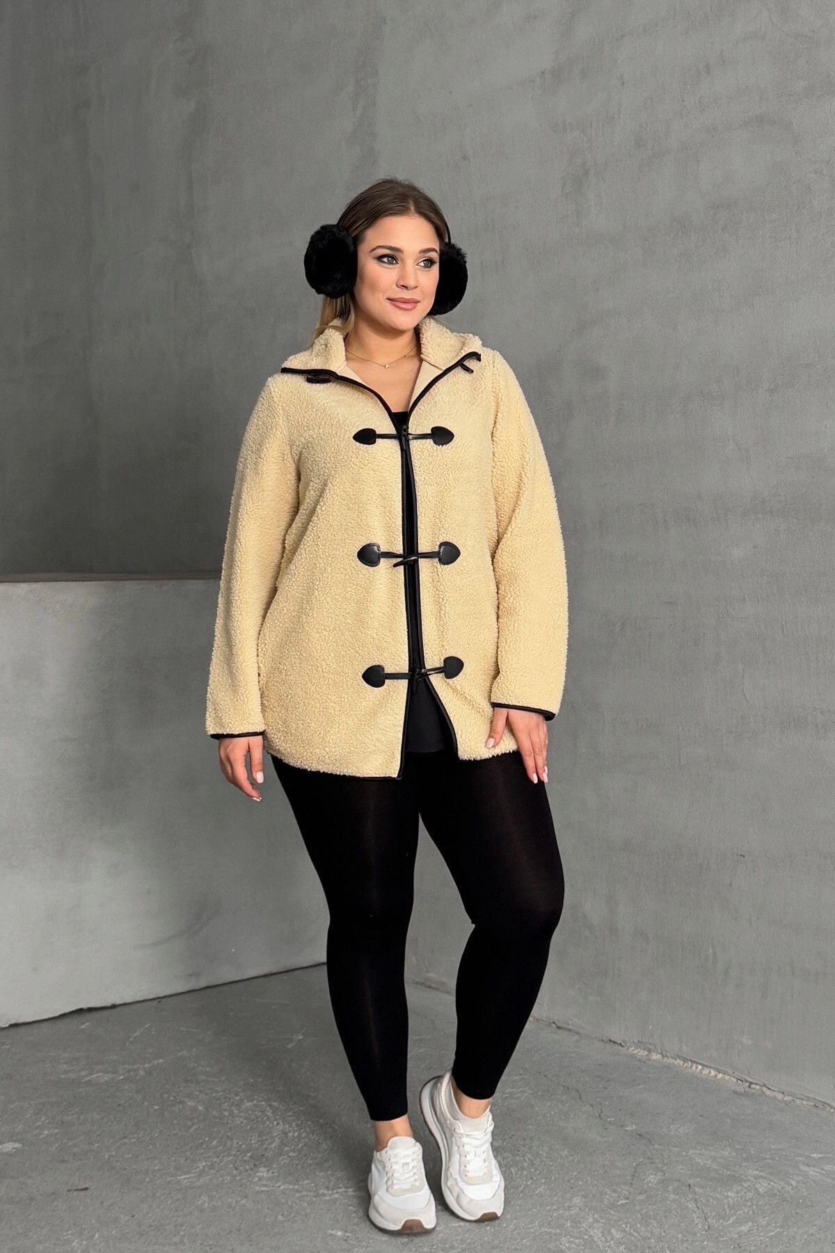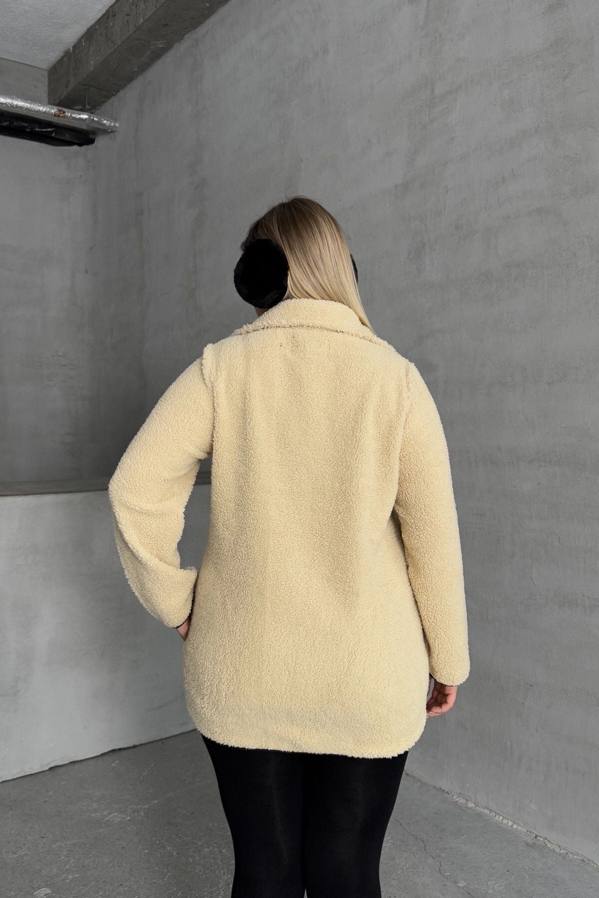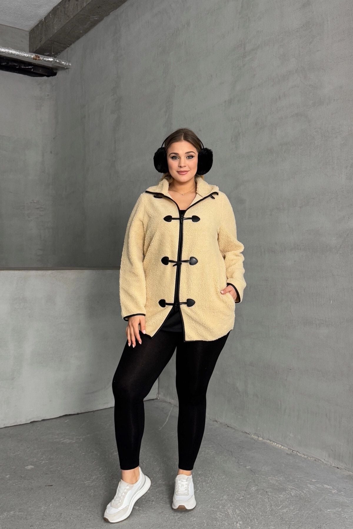 Büyük Beden Önü Kapamalı Cepli Uzun Kollu Peluş Mont 301815