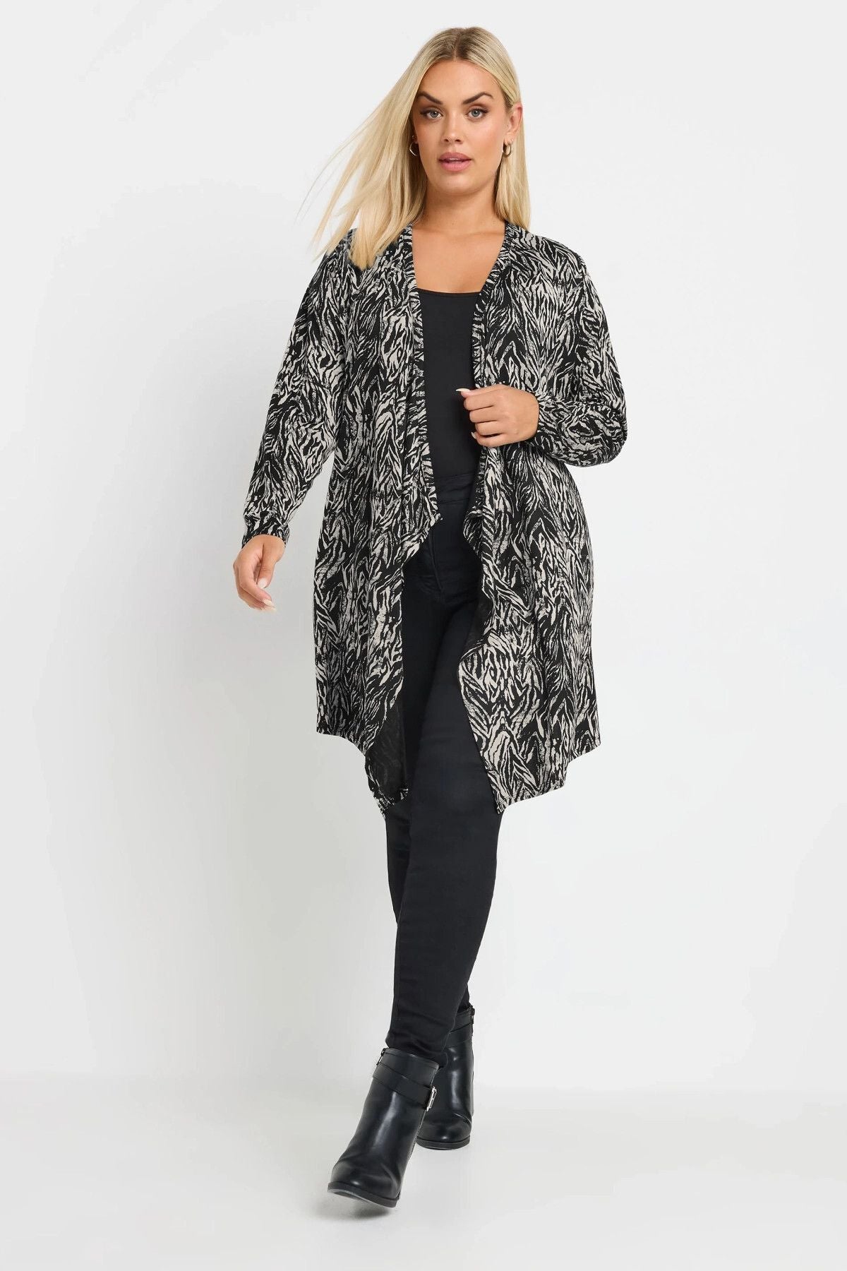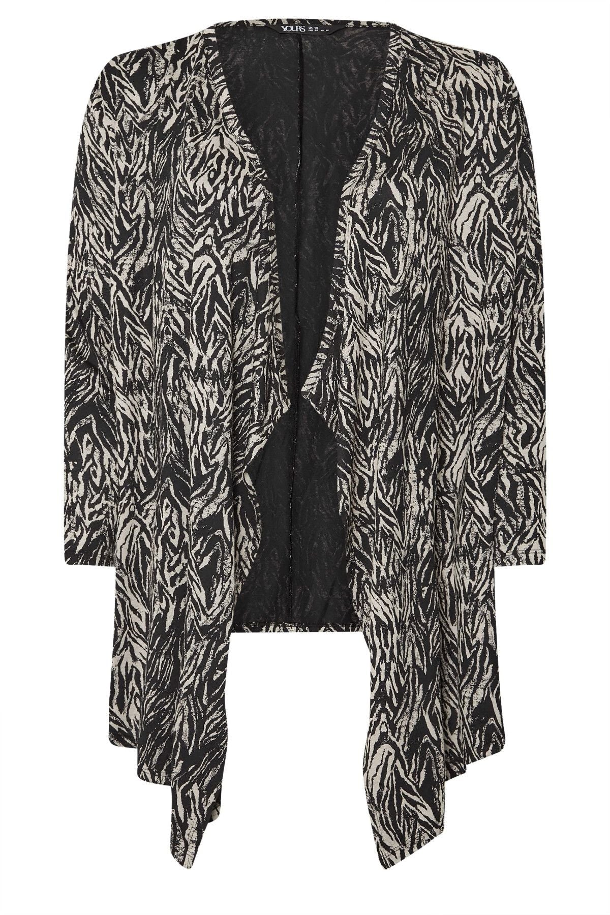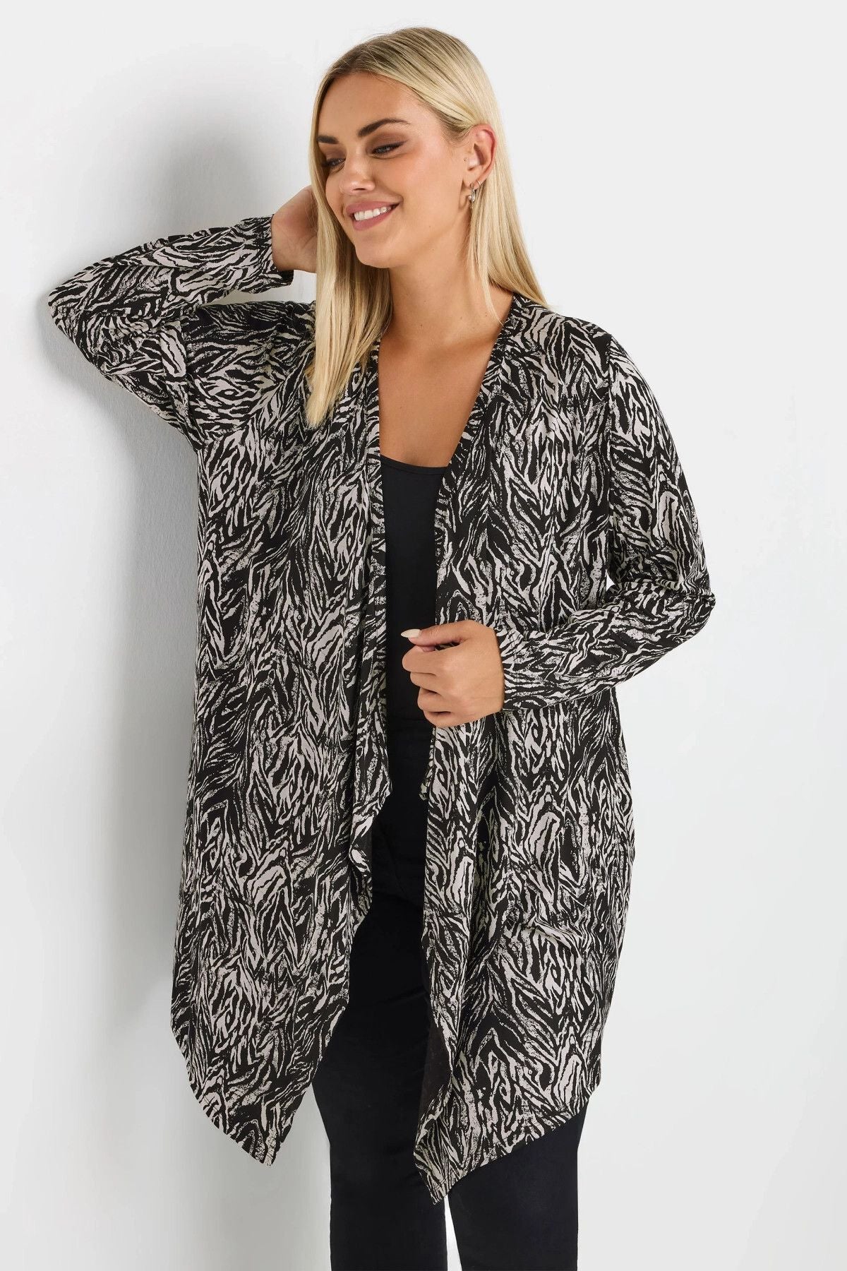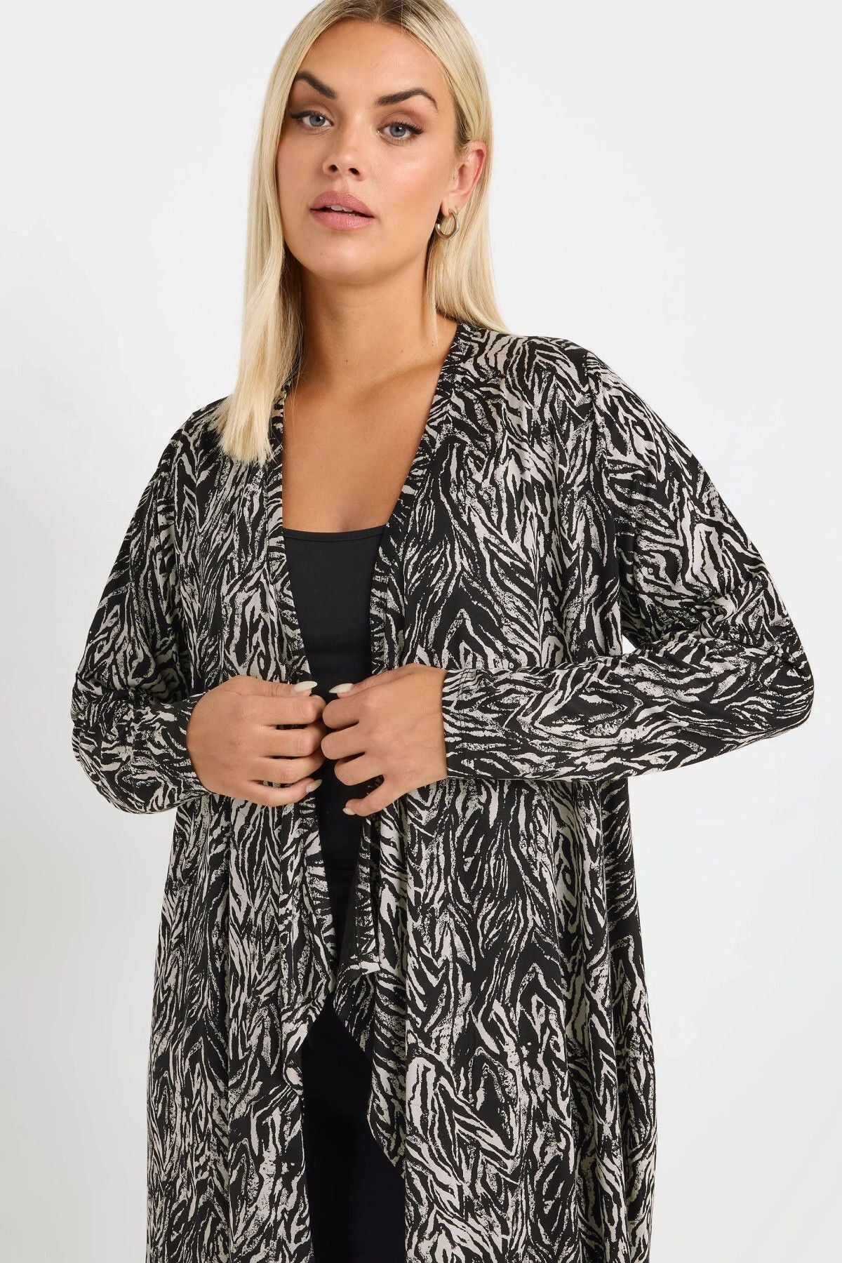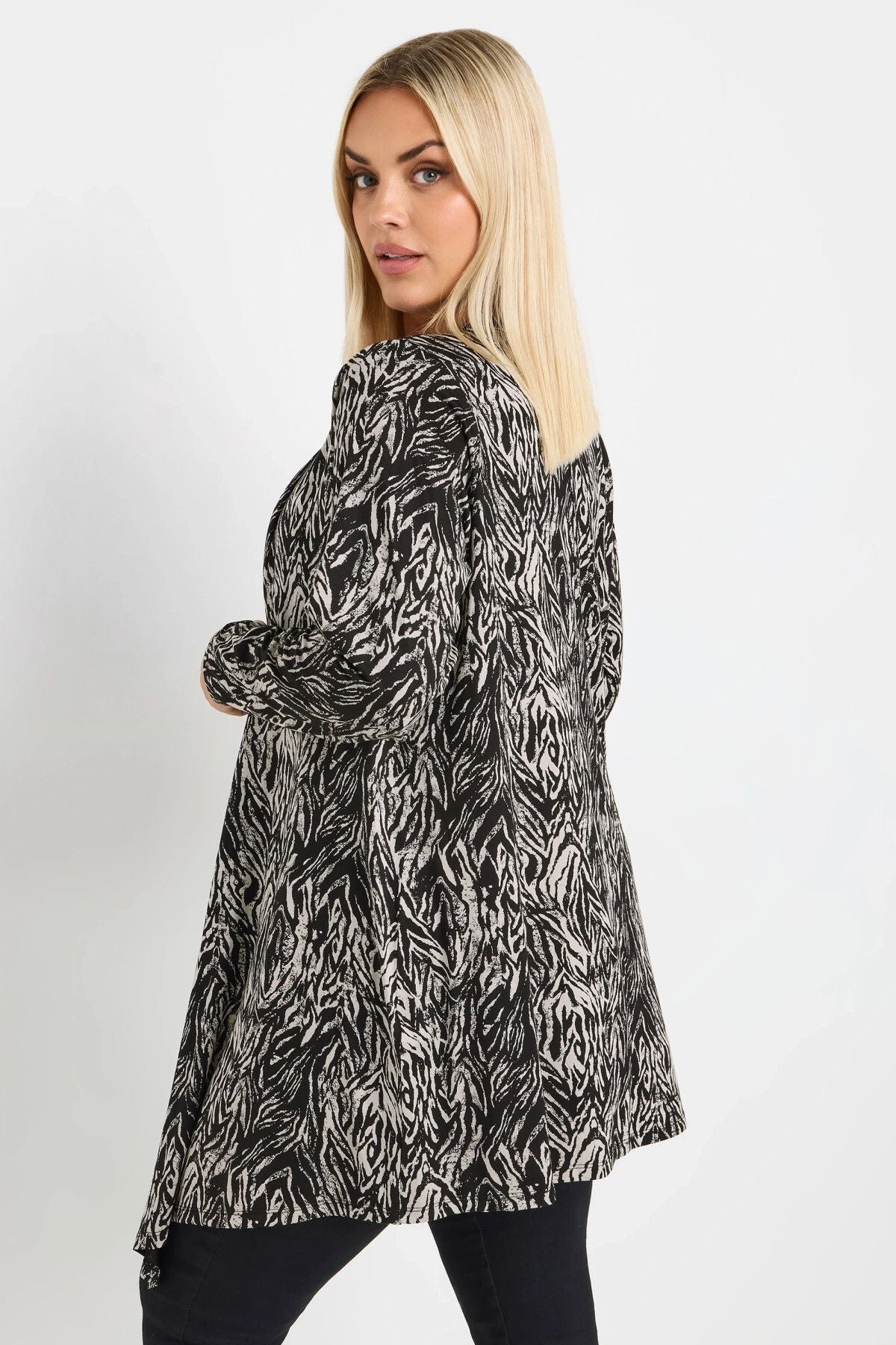 Model Detayı: Soyut desen baskısı, uzun kollu, şelale tasarımı, açık ön