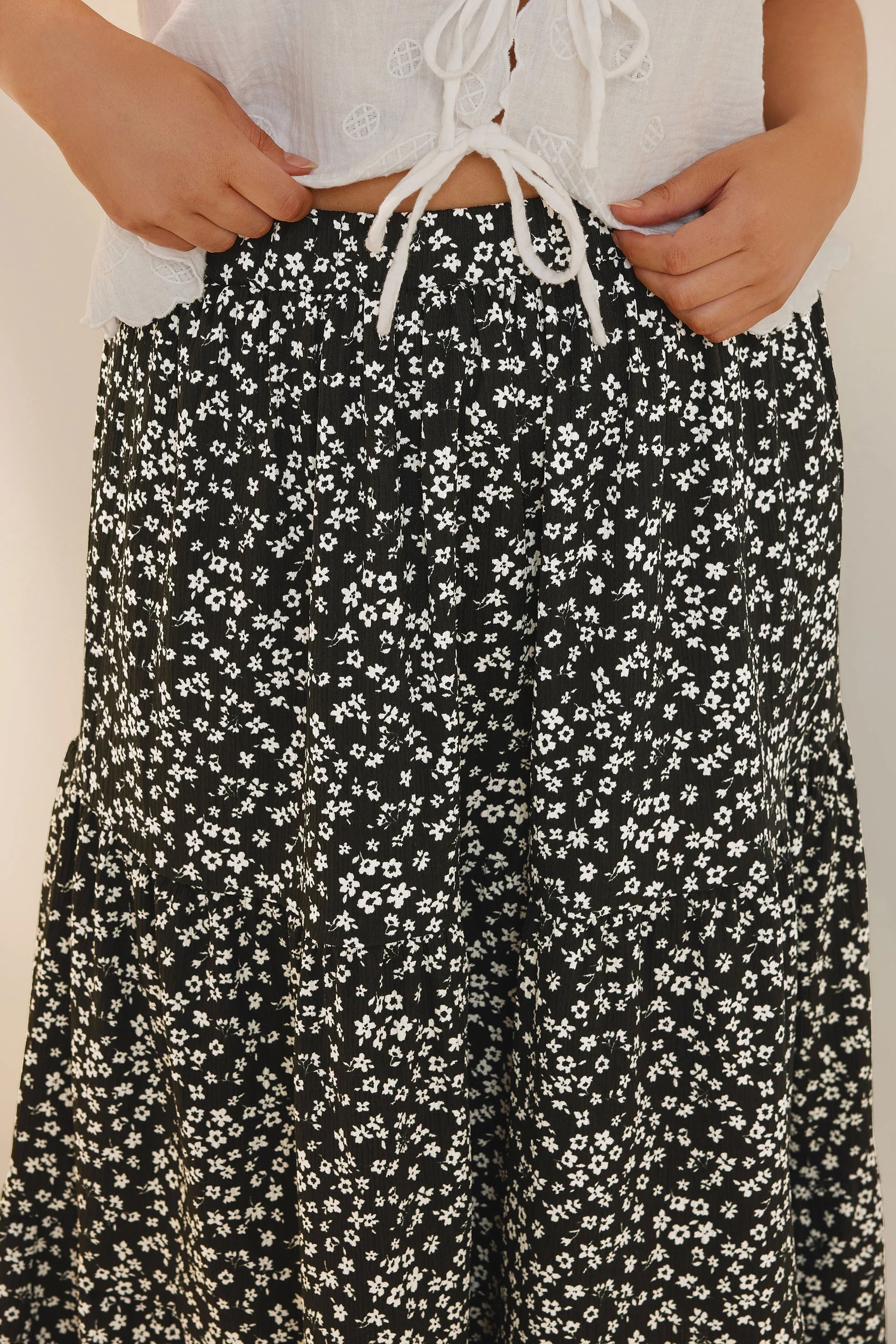 Model Detayı: Beli Lastikli, Katmanlı (Kat Kat) Tasarım, Midaxi Boy, Çıtır Çiçek Desenli