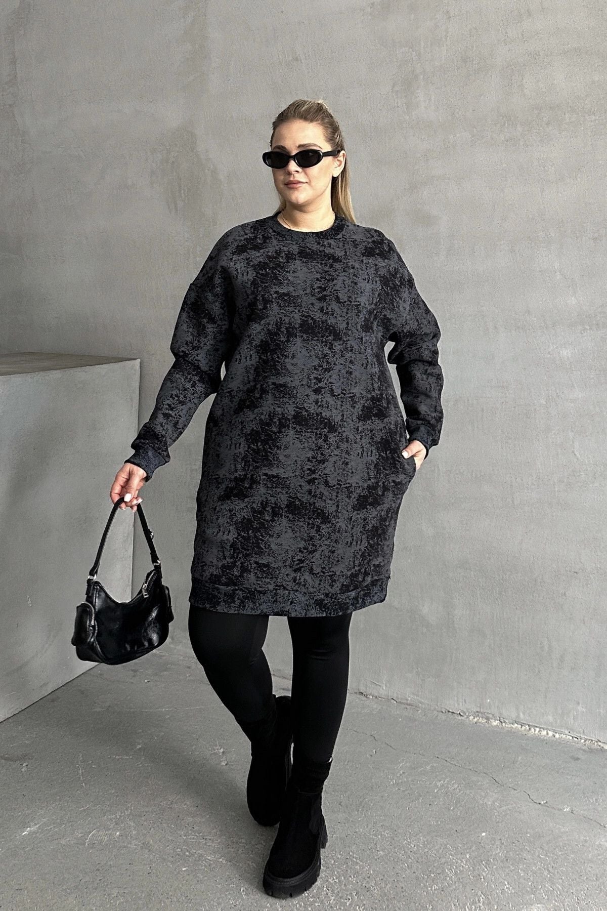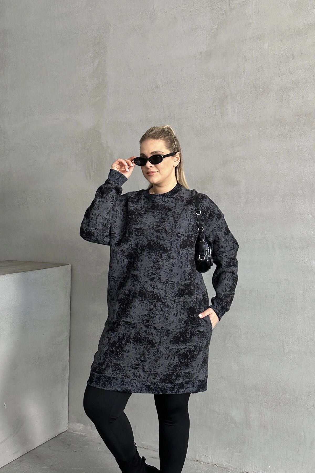Büyük Beden Uzun Kollu Bisiklet Yaka Cepli Desenli Elbise 106-75