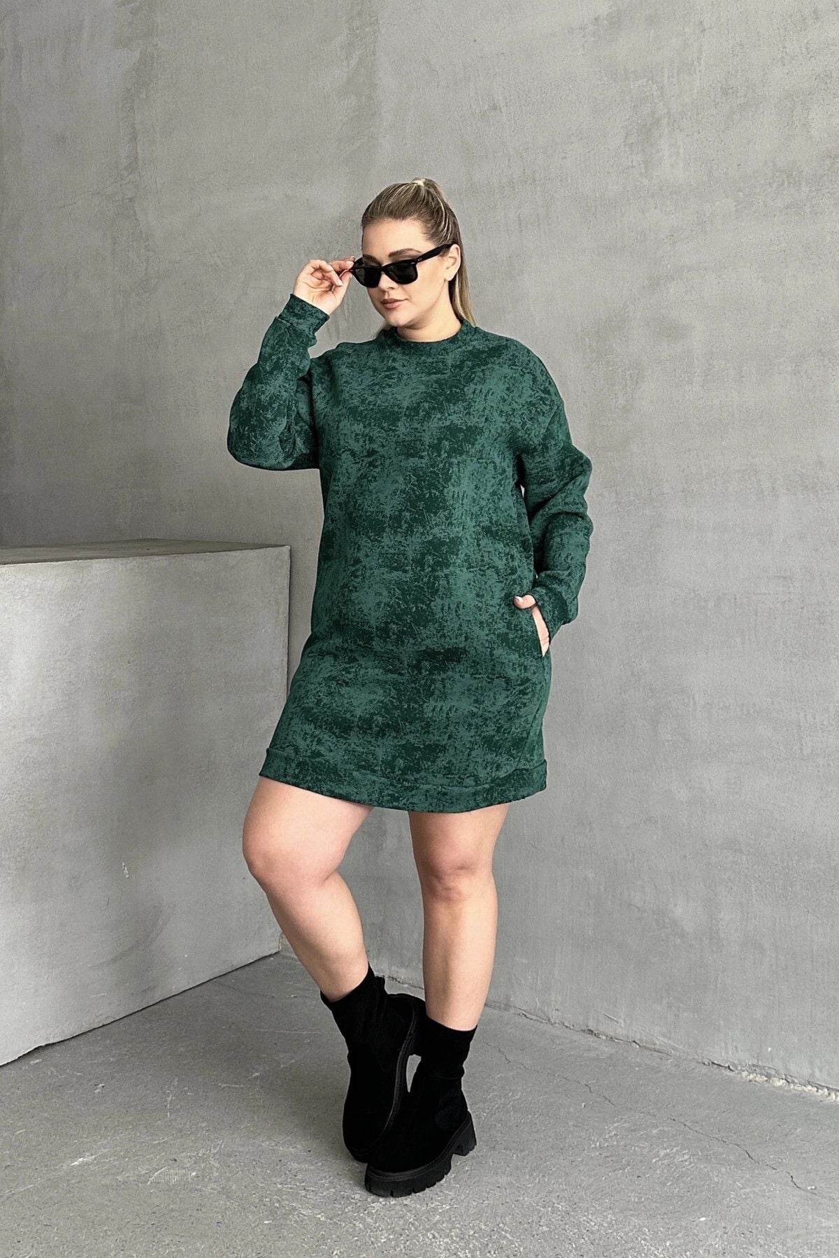 Büyük Beden Uzun Kollu Bisiklet Yaka Cepli Desenli Elbise 106-77