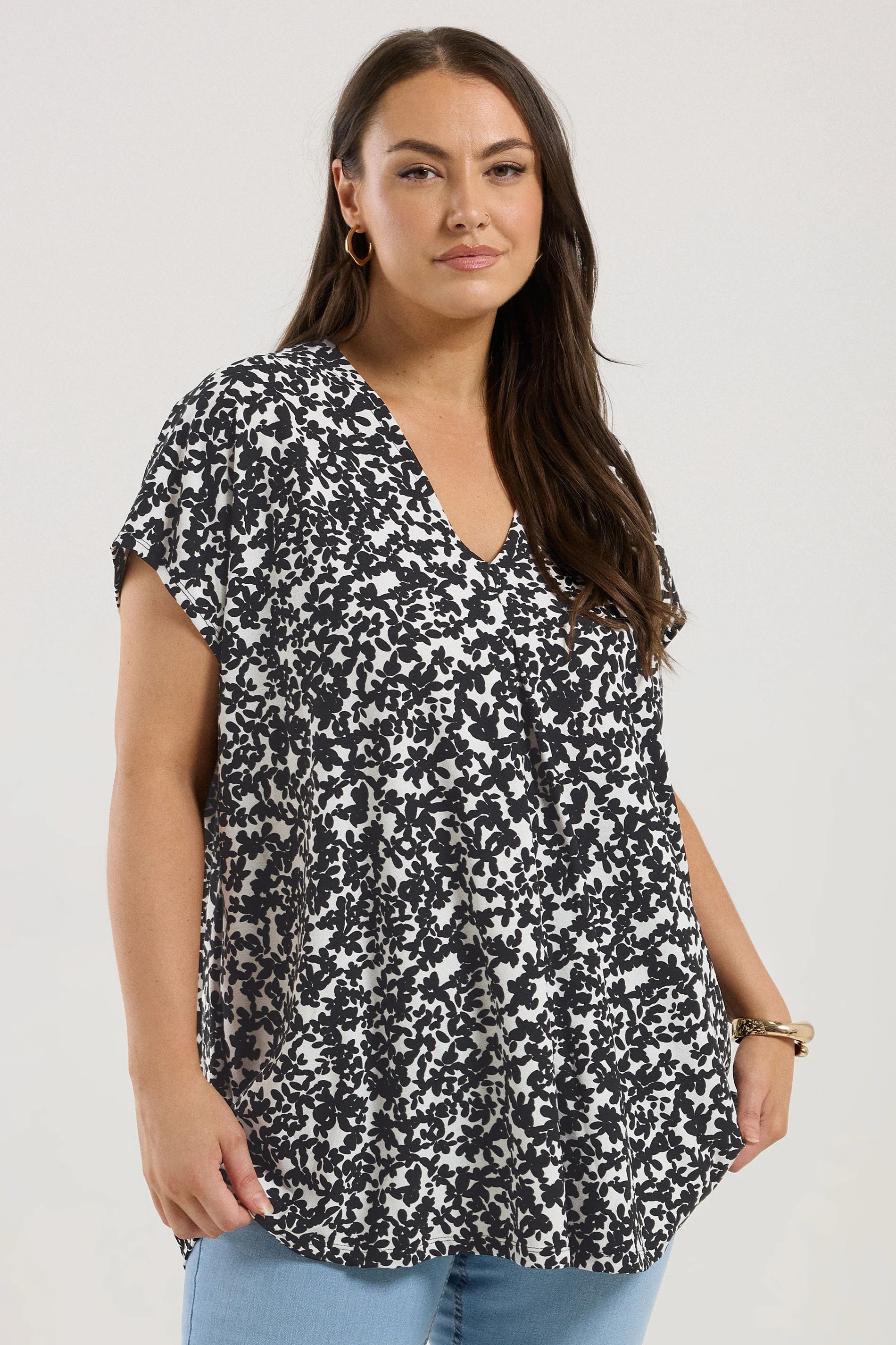 Büyük Beden V Yaka Çiçek Desenli Kısa Kollu Bluz 321704