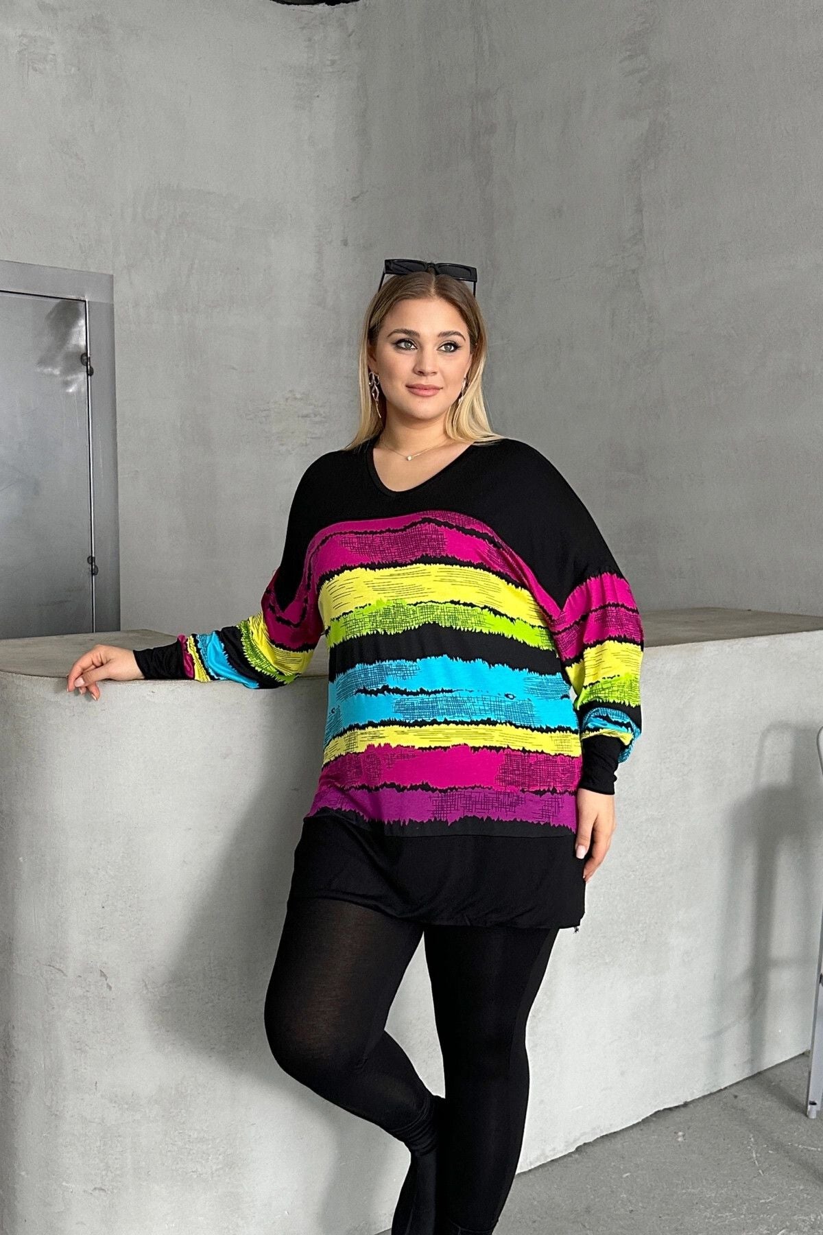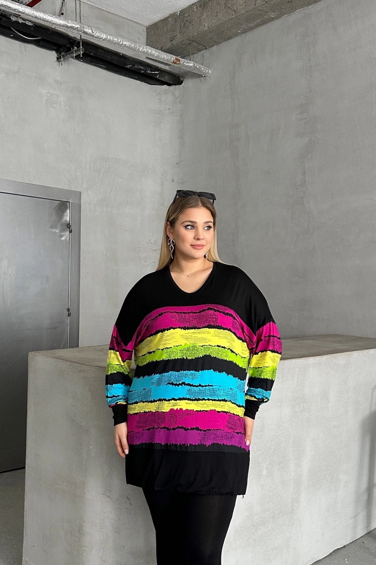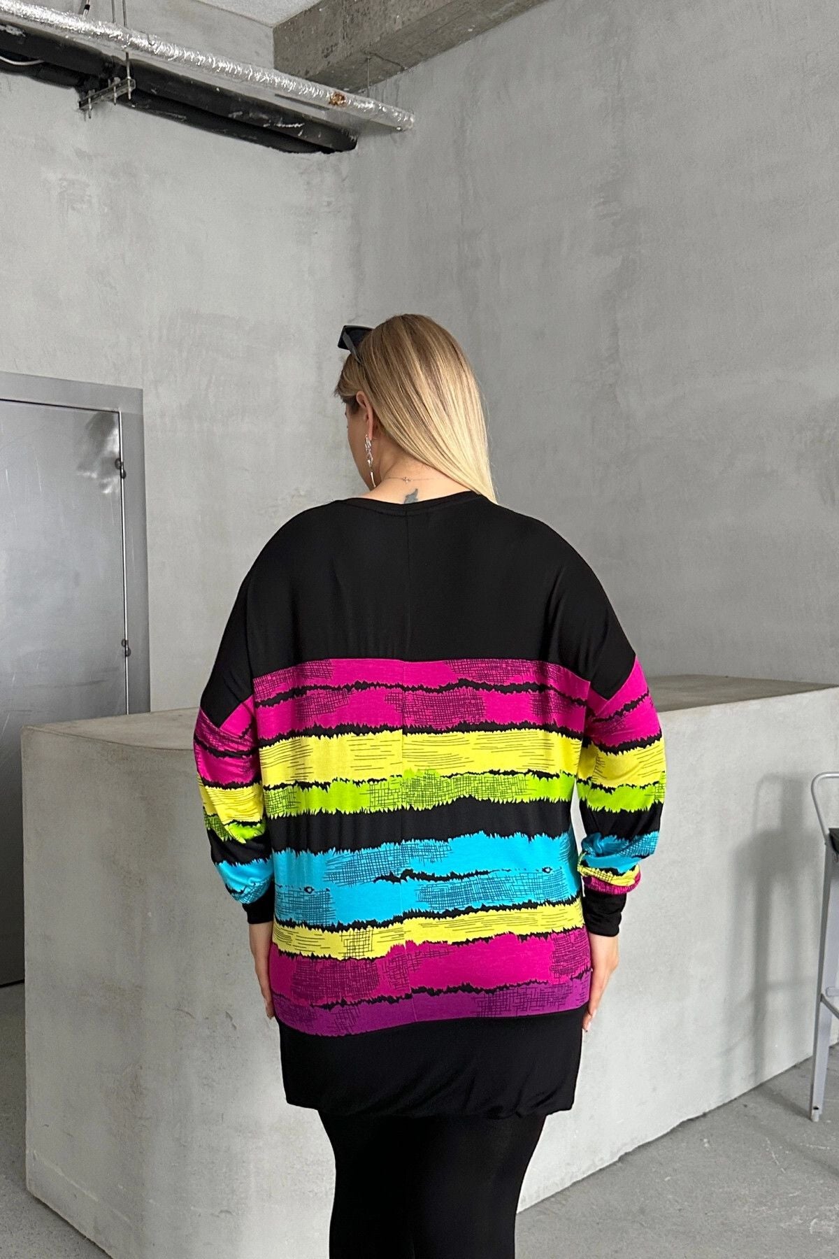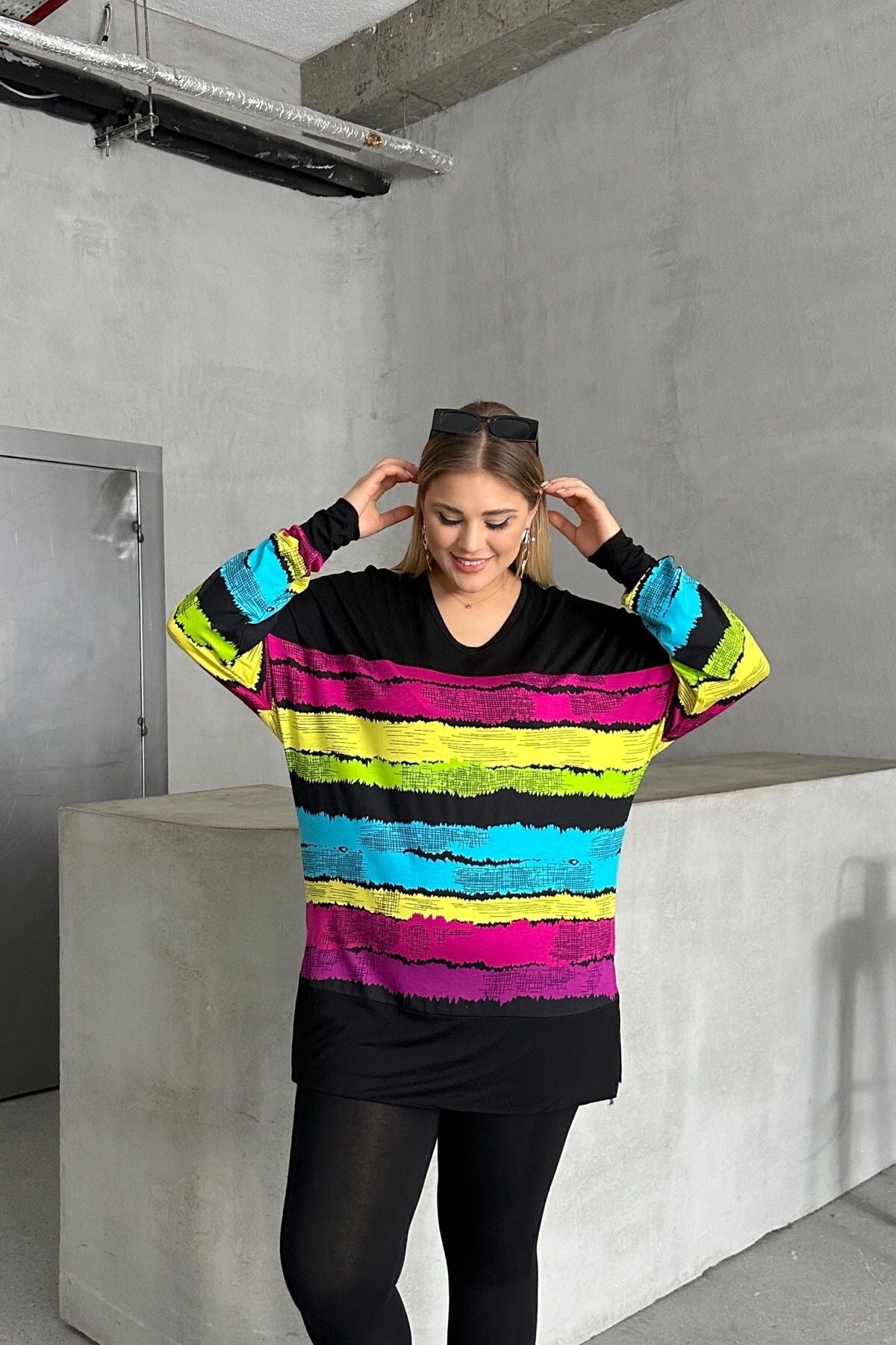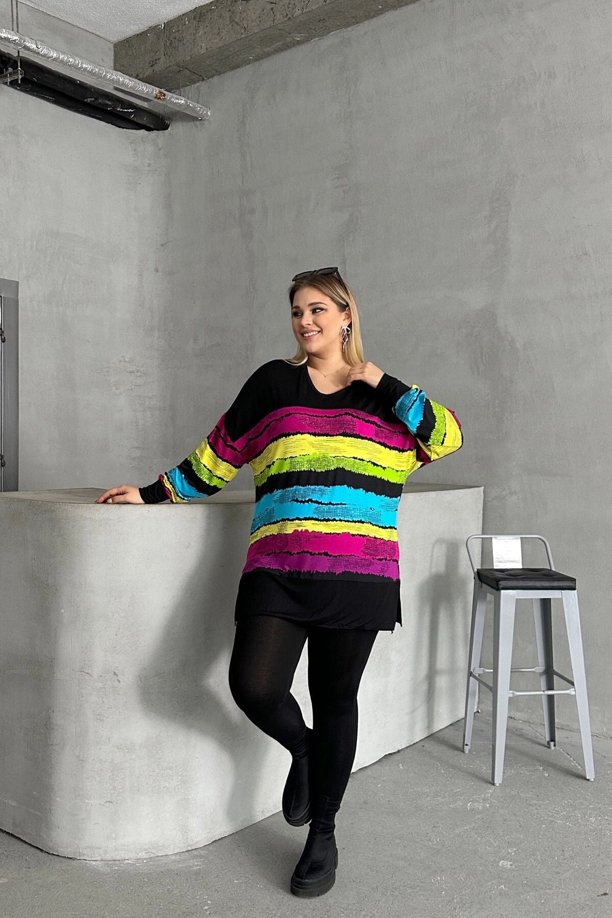 Büyük Beden V Yaka Çizgili Yanları Yırtmaçlı Uzun Kollu Bluz 302014