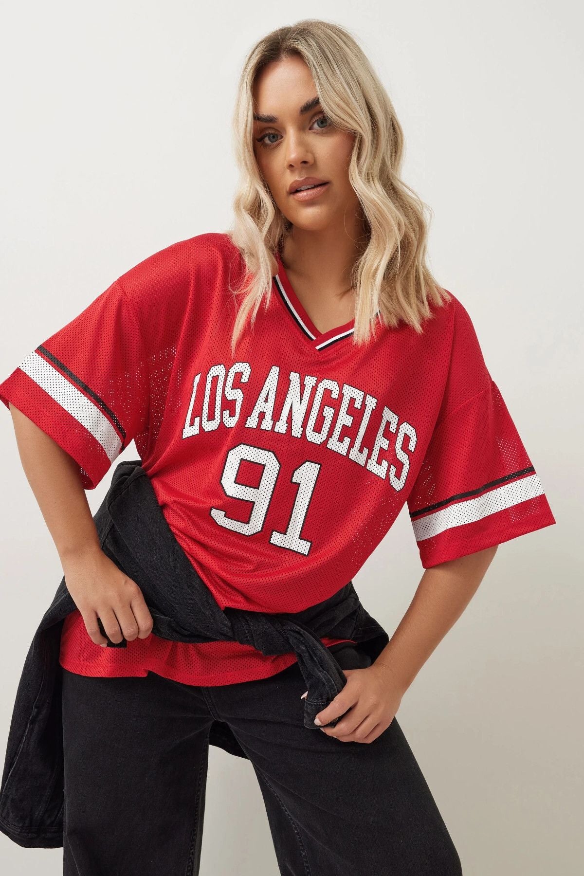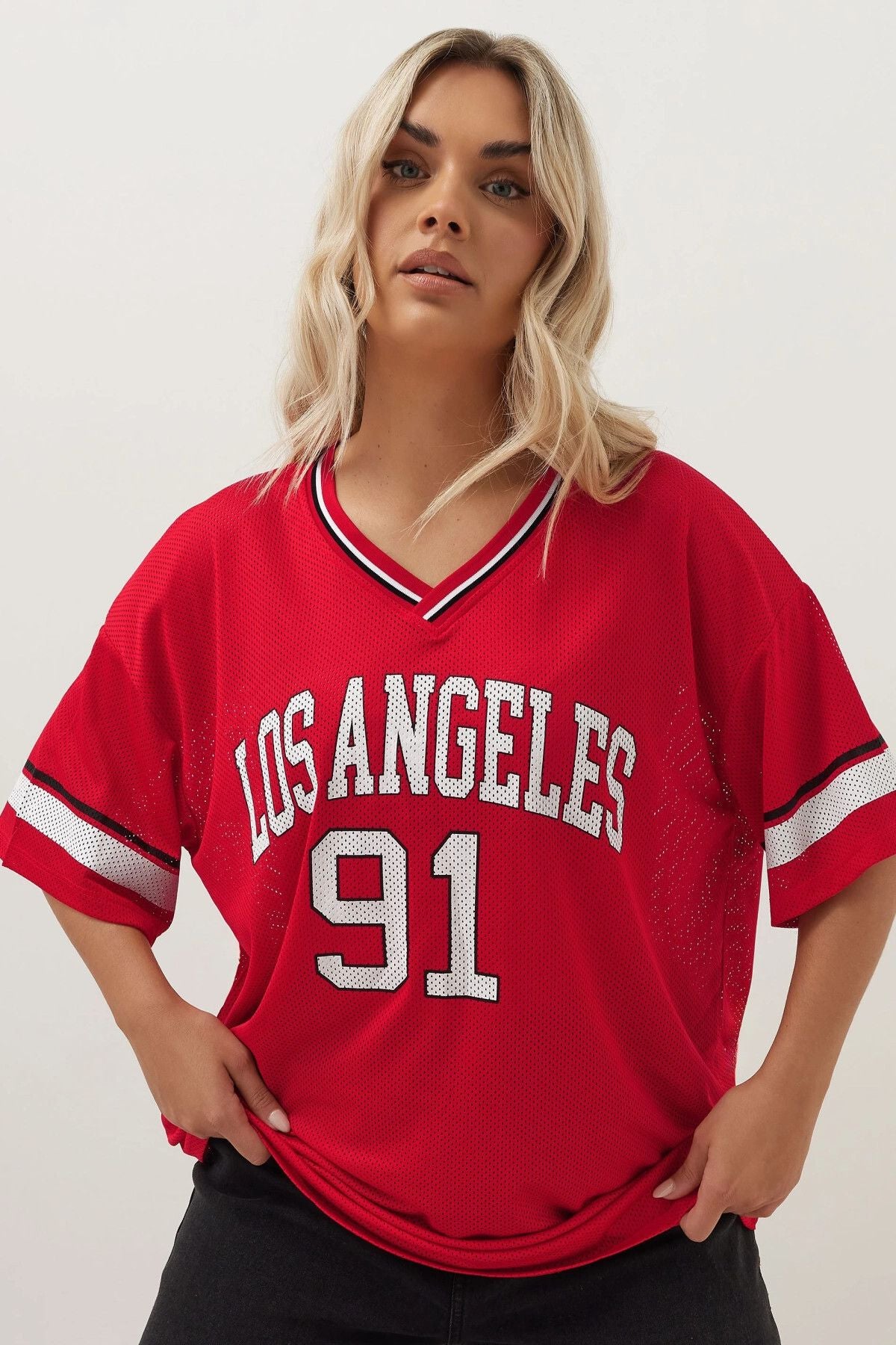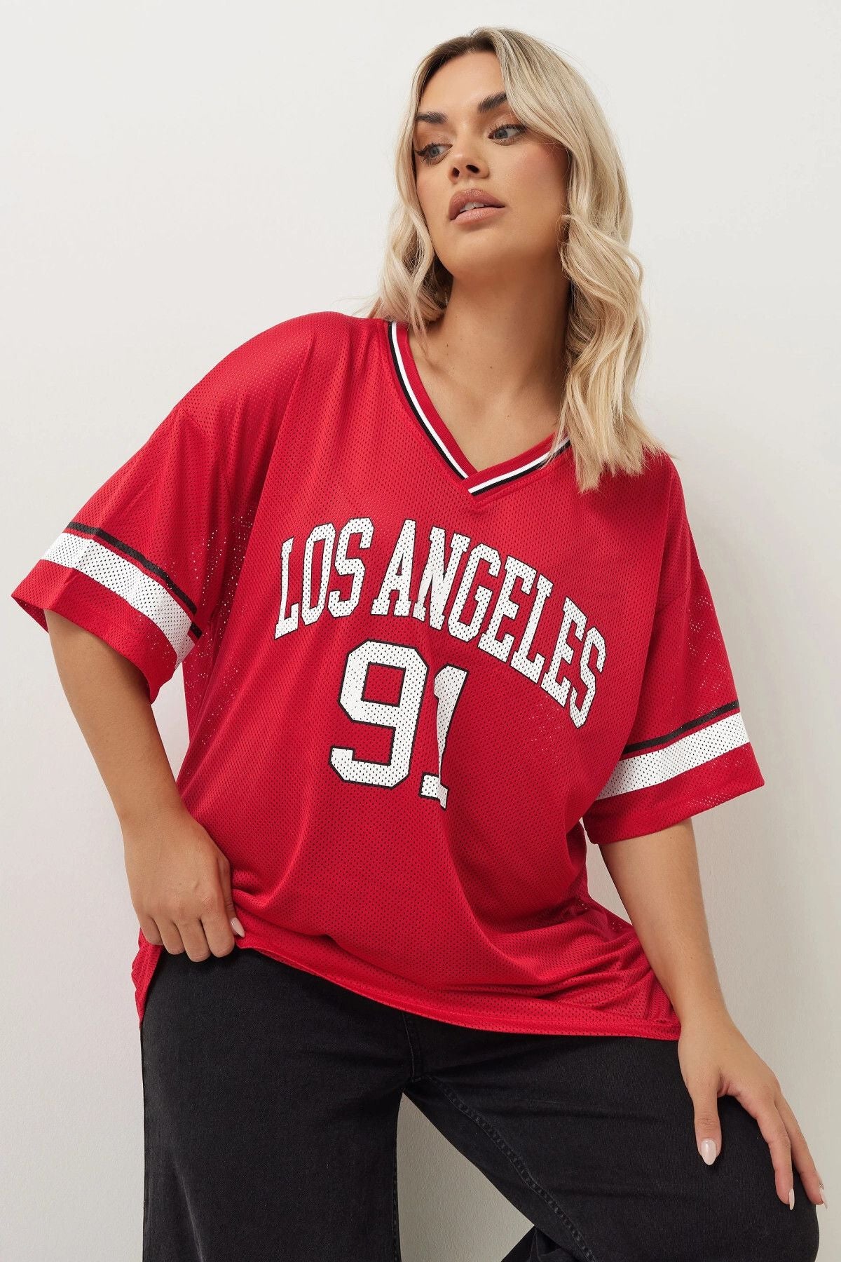 Bu yeni jersey bluz ile hafta sonu gardırobunuza spor bir hava katın! Nefes alabilir dokuma kumaştan üretilen bu bluz, 'Los Angeles' slogan tasarımı, V yakası, kısa kolları ve oversize kalıbı ile öne çıkıyor. Jean ve spor ayakkabı ile kombinlediğinizde giymeyi sevebileceğiniz trend öncülü casual görünümünüzü tamamlıyor. Hafta sonu kazandıran görünüm! Los Angeles sloganın şehirli havasıı ve oversize kalıbın rahat duruşu ile hem trendy hem konforlu bir seçenek sunan bu bluz, hafta sonu stilinizin vazgeçilmez parçası olmaya aday.