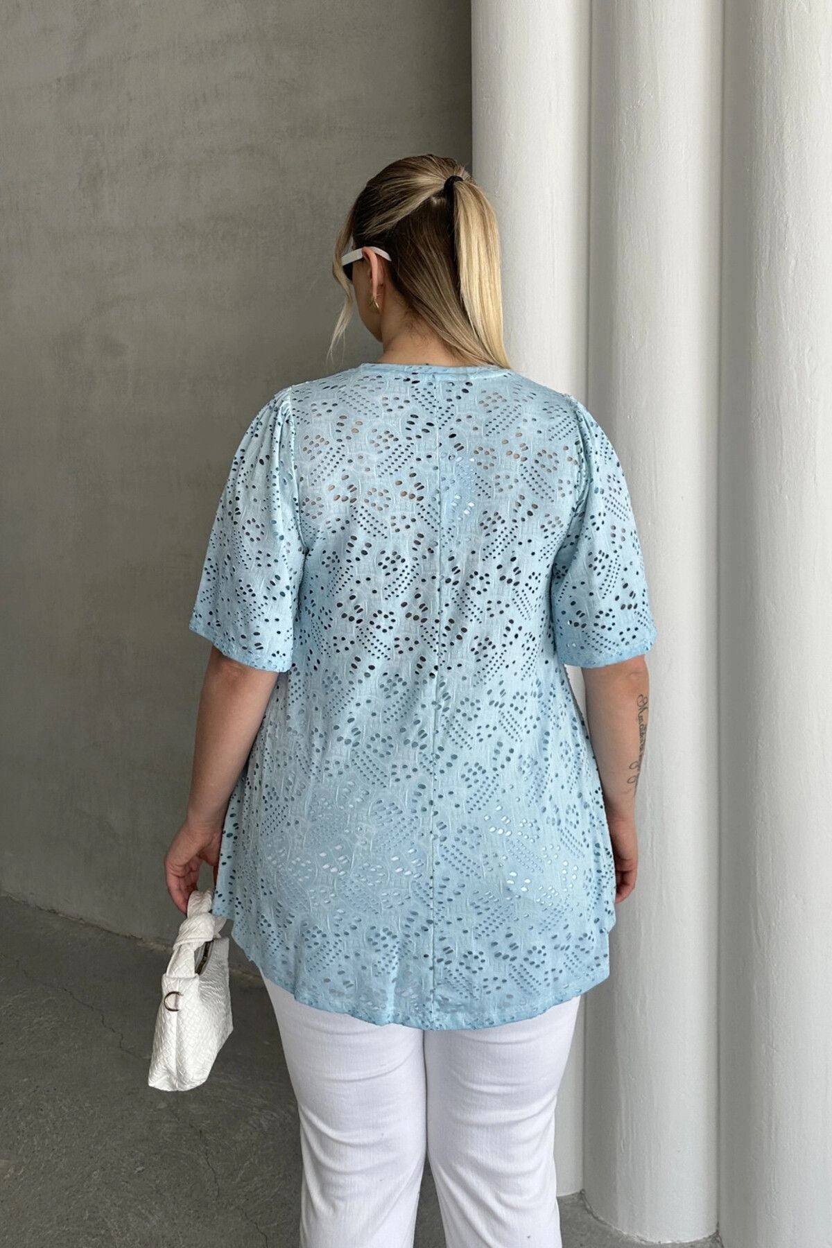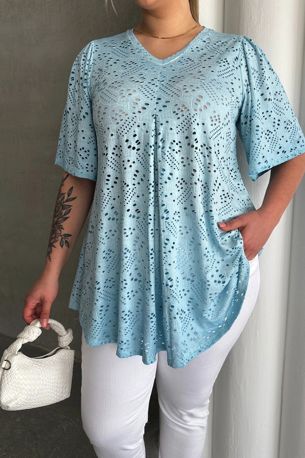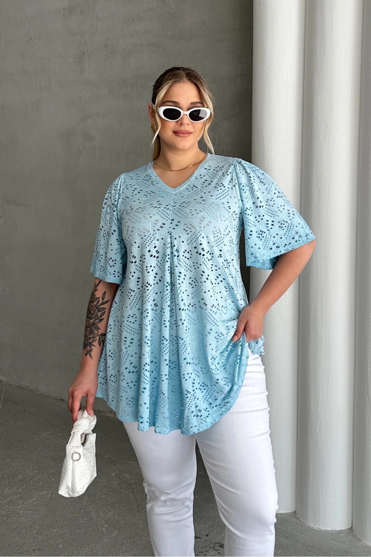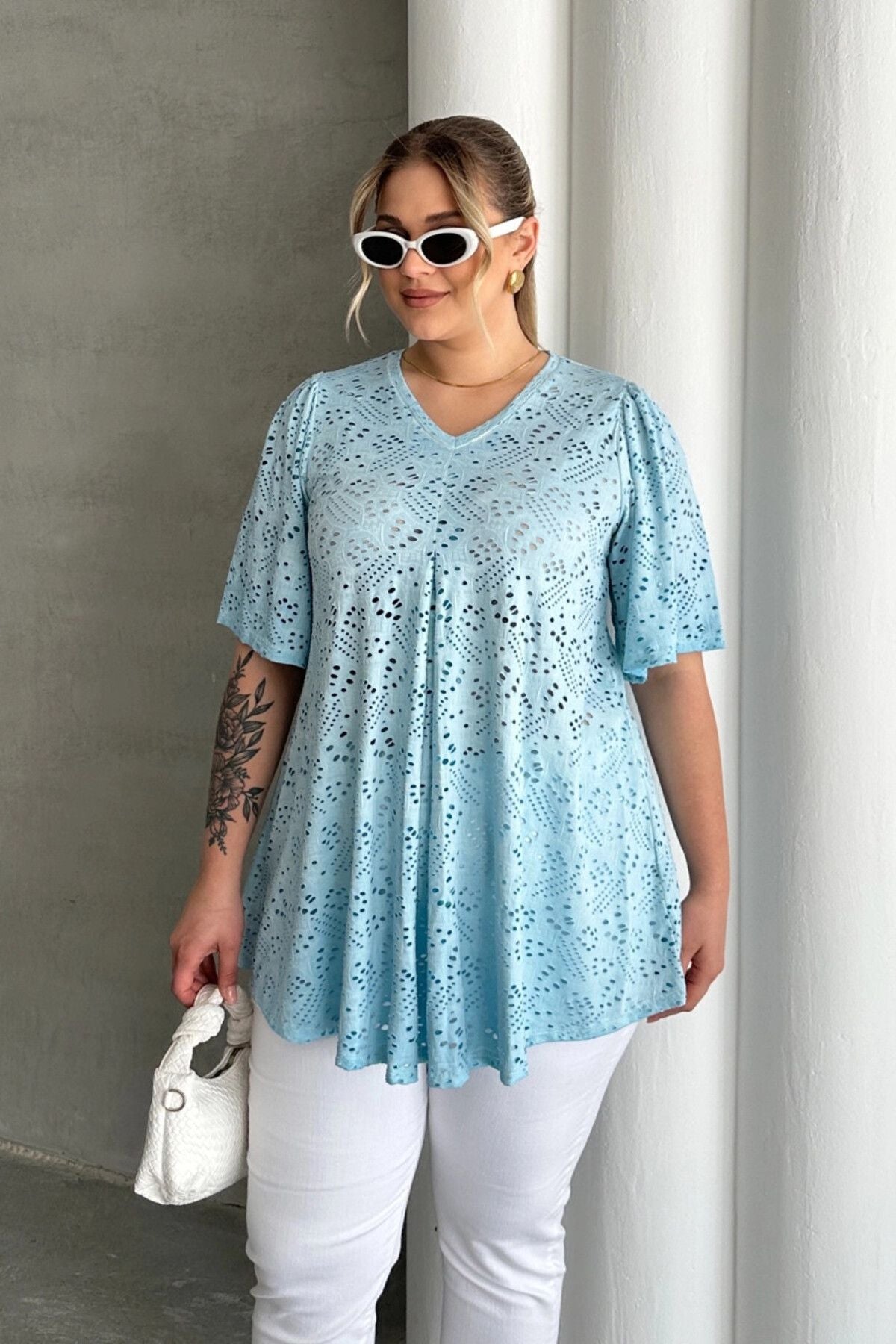 Model Detayı: V Yaka, Kısa Kollu, Lazer Kesim Dantel Detaylı, Astarsız, Salaş Bluz