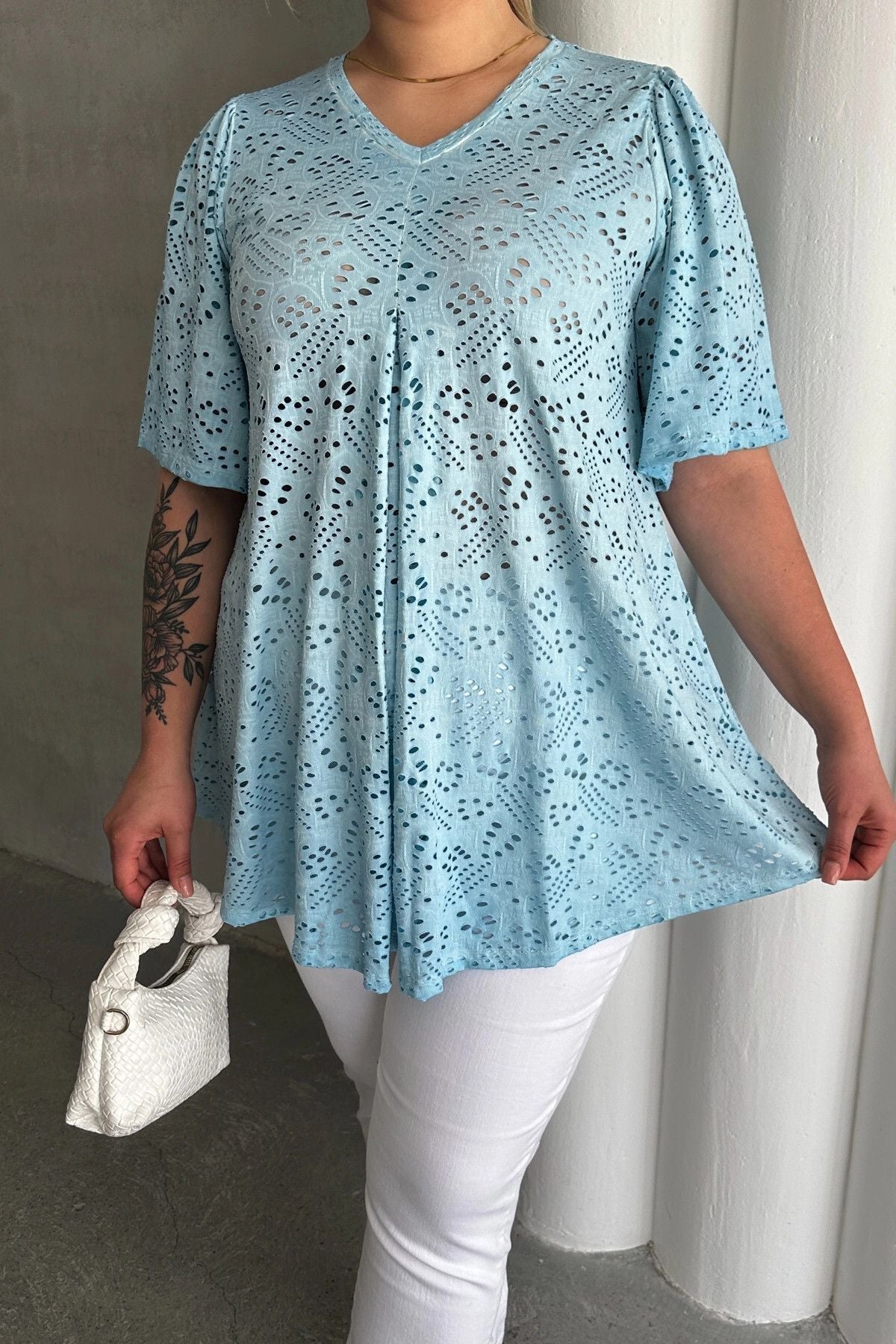 Moda Notu: Zarif lazer kesim dantel detaylarıyla dikkat çeken bu salaş bluz, yaz gardırobunuza bohem bir şıklık katıyor. Beyaz pantolonlarla kombinleyerek hem rahat hem de stil sahibi bir görünüm elde edebilirsiniz.