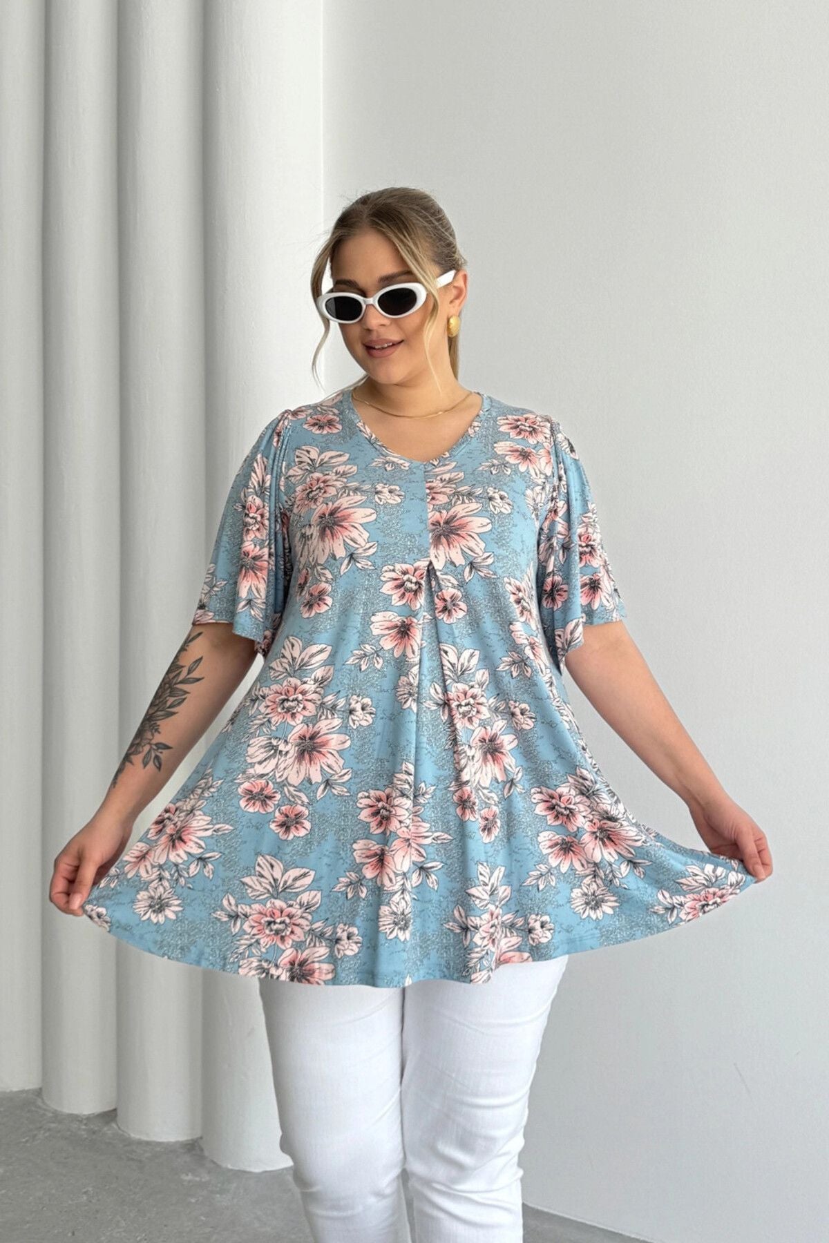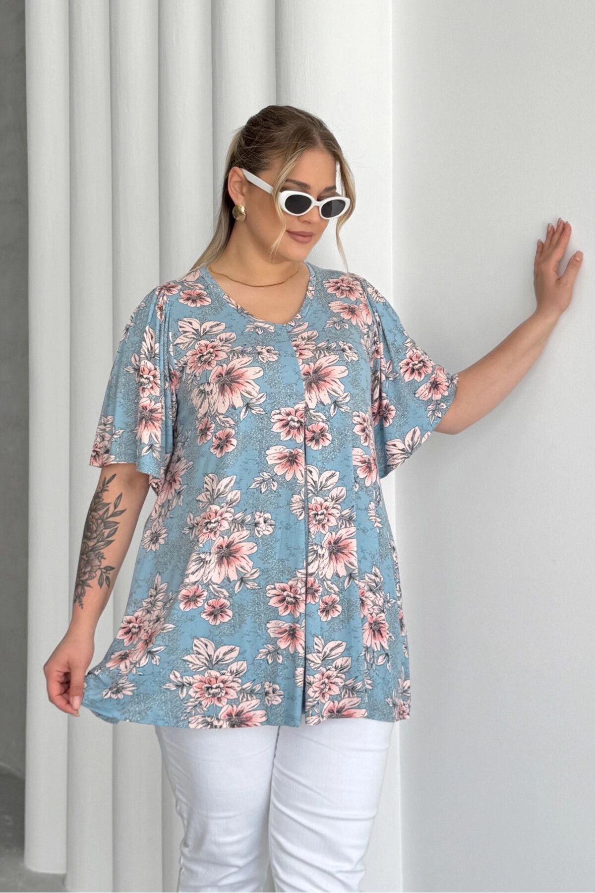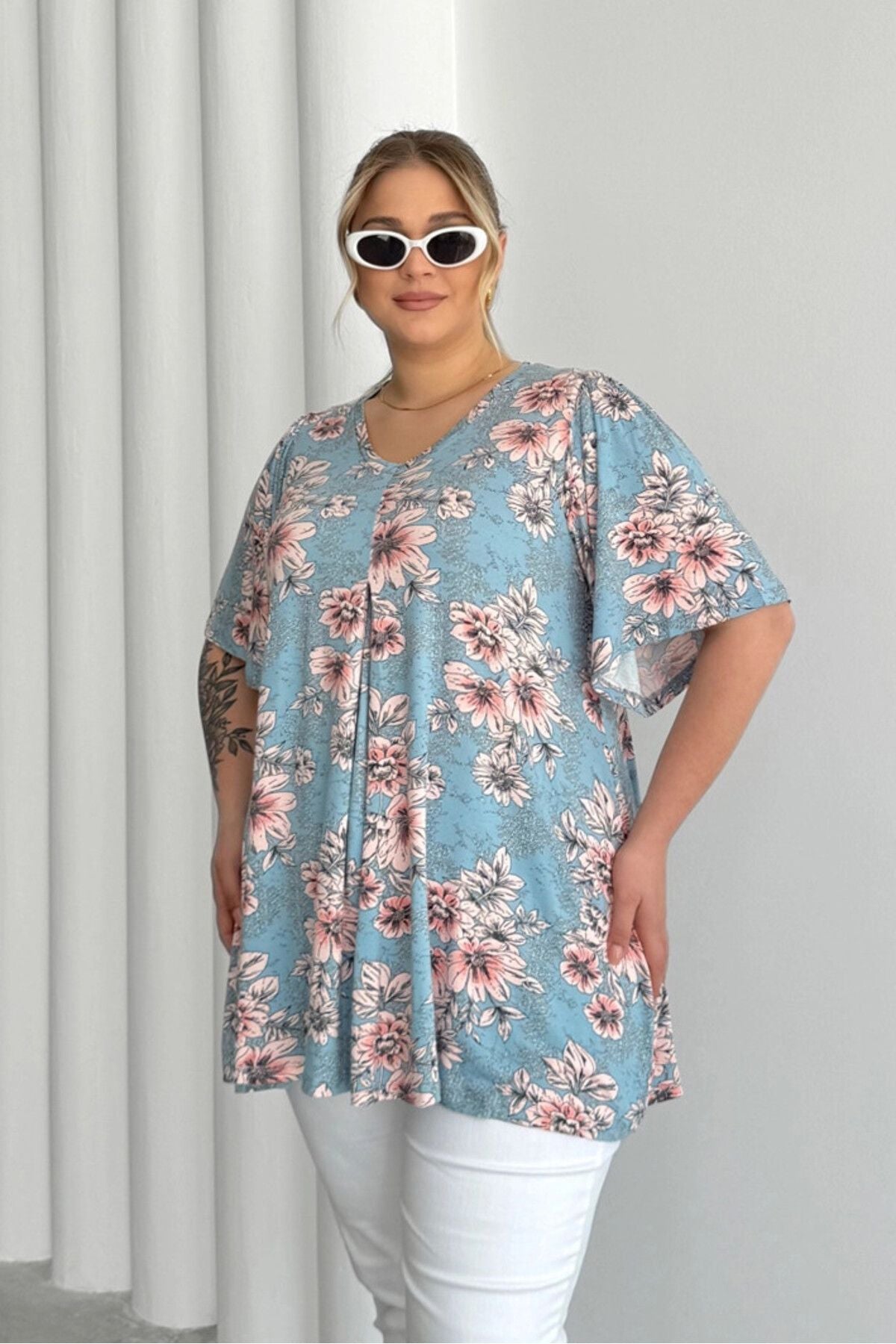 Büyük Beden V Yaka Kısa Kollu Eteği Bollaşan Desenli Bluz 101-44