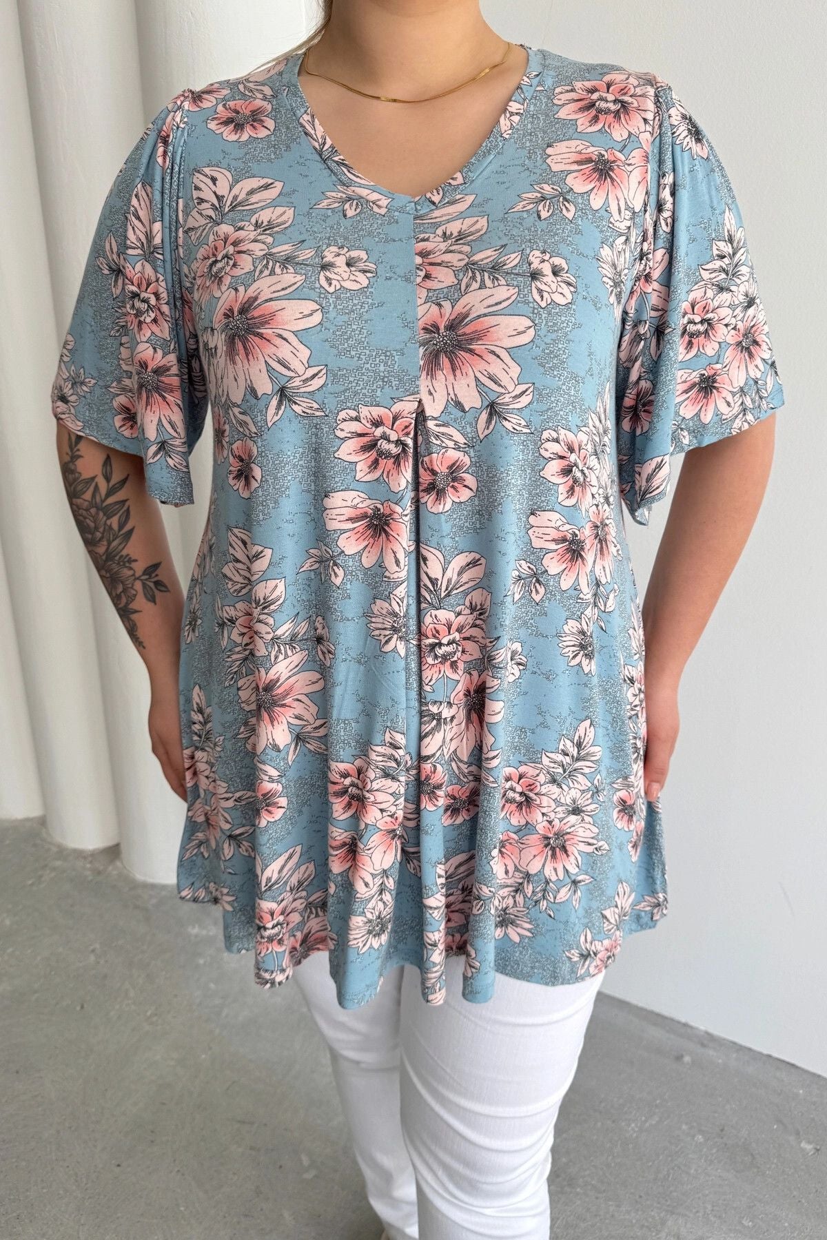 Model Detayı: V Yaka, Kısa Kollu, Eteği Bollaşan, Çiçek Desenli Bluz