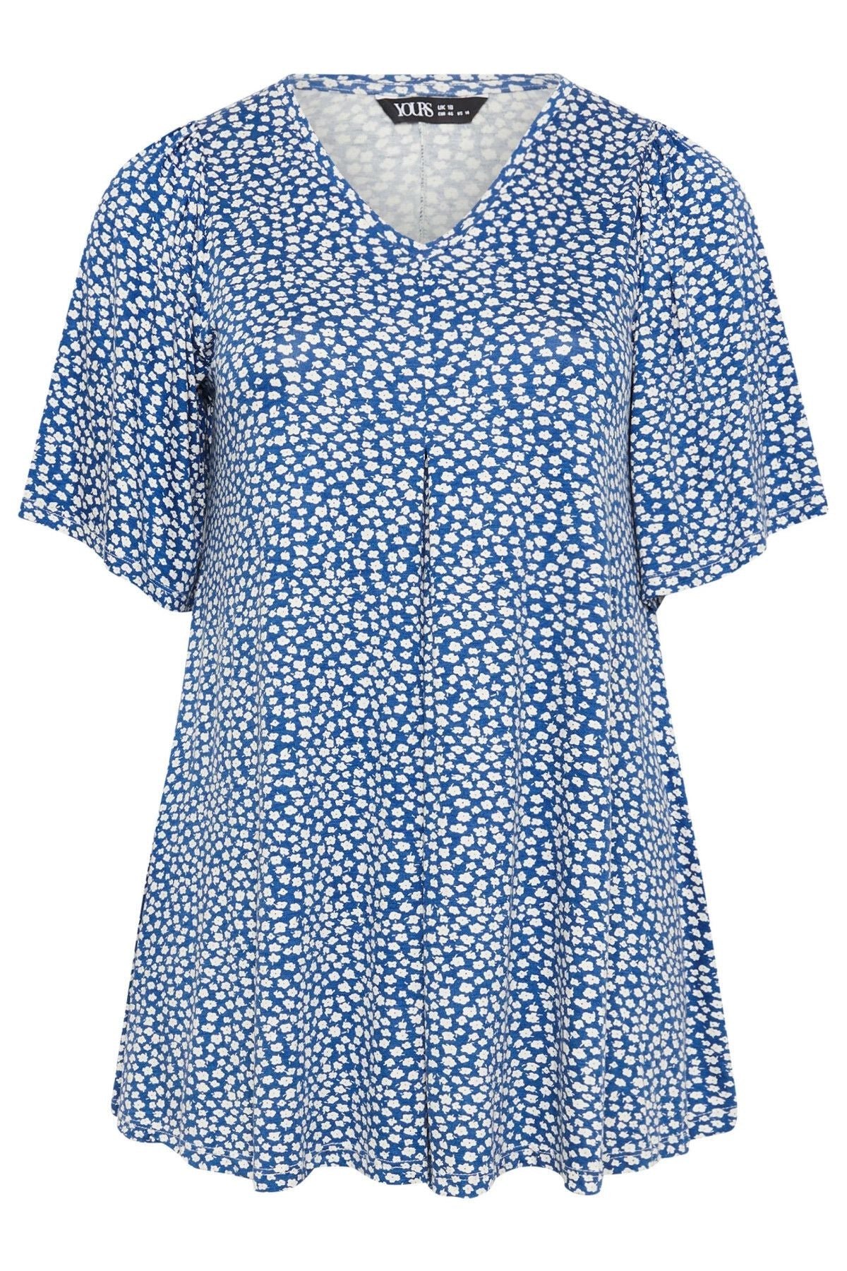 Büyük Beden V Yaka Kısa Kollu Eteği Bollaşan Desenli Bluz 303624