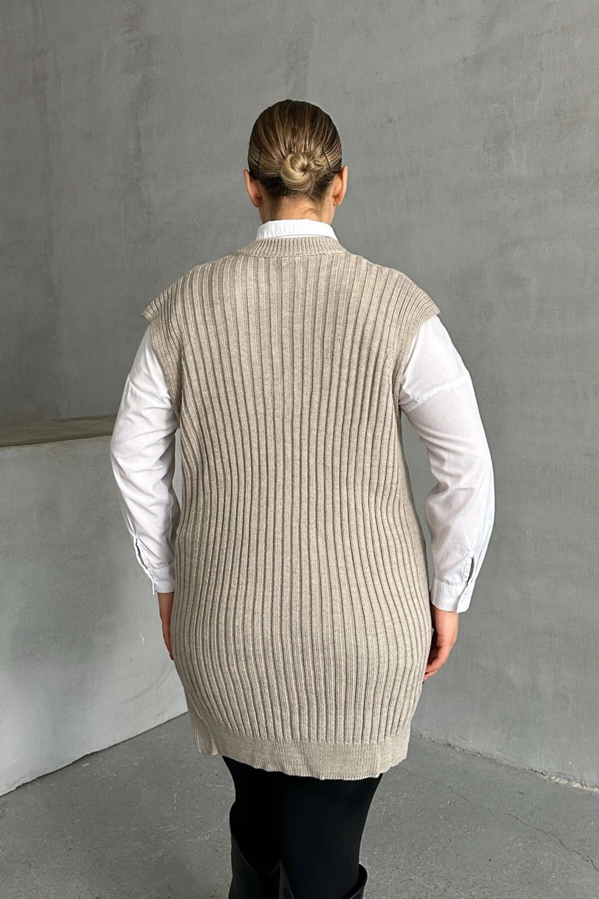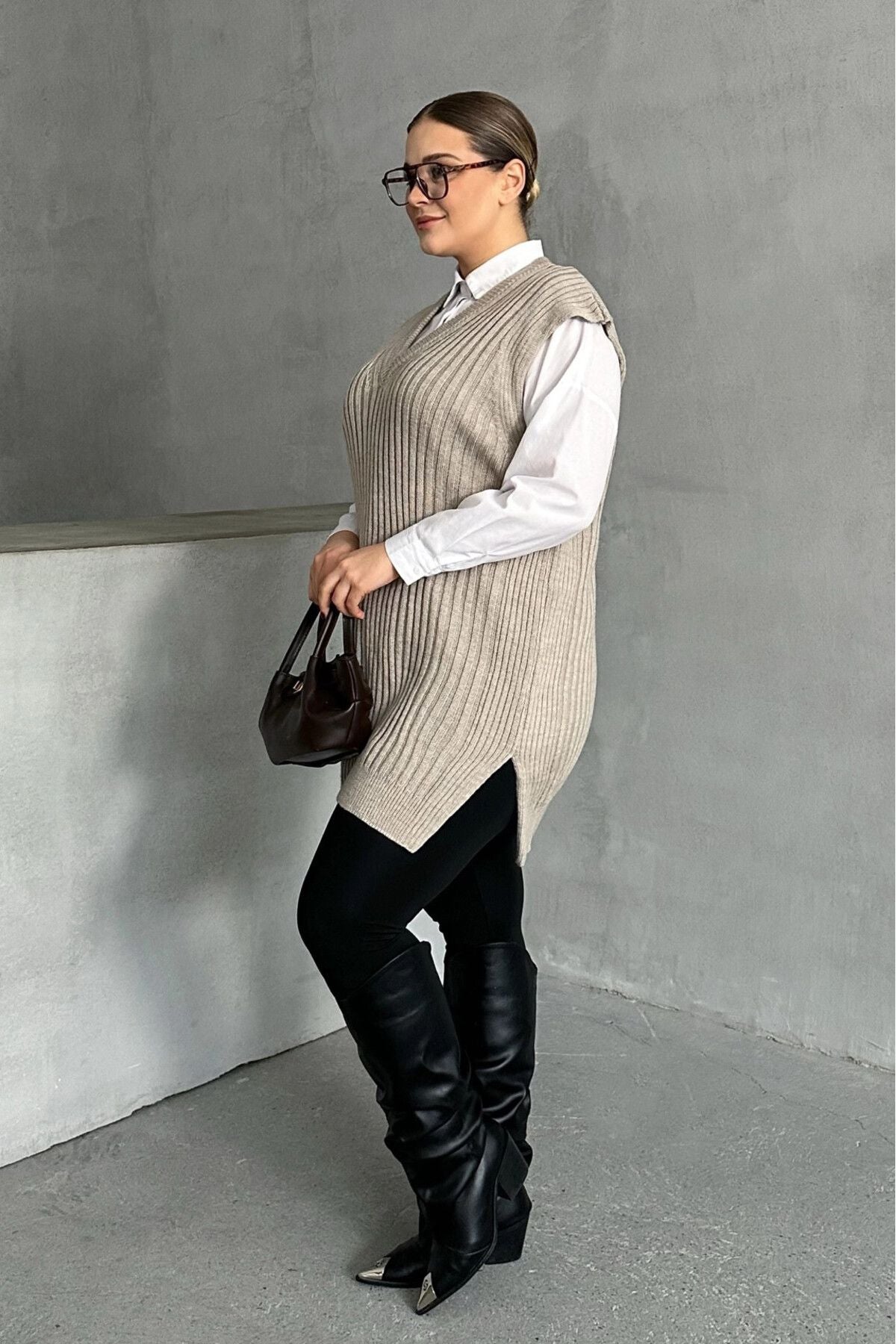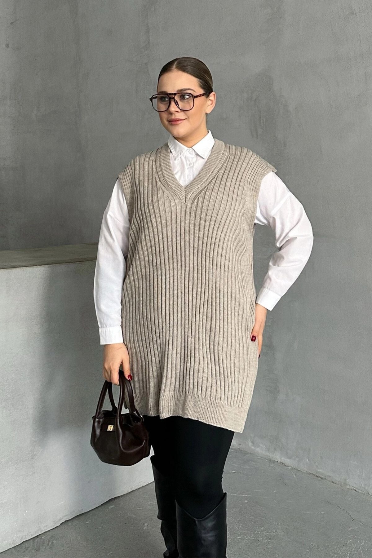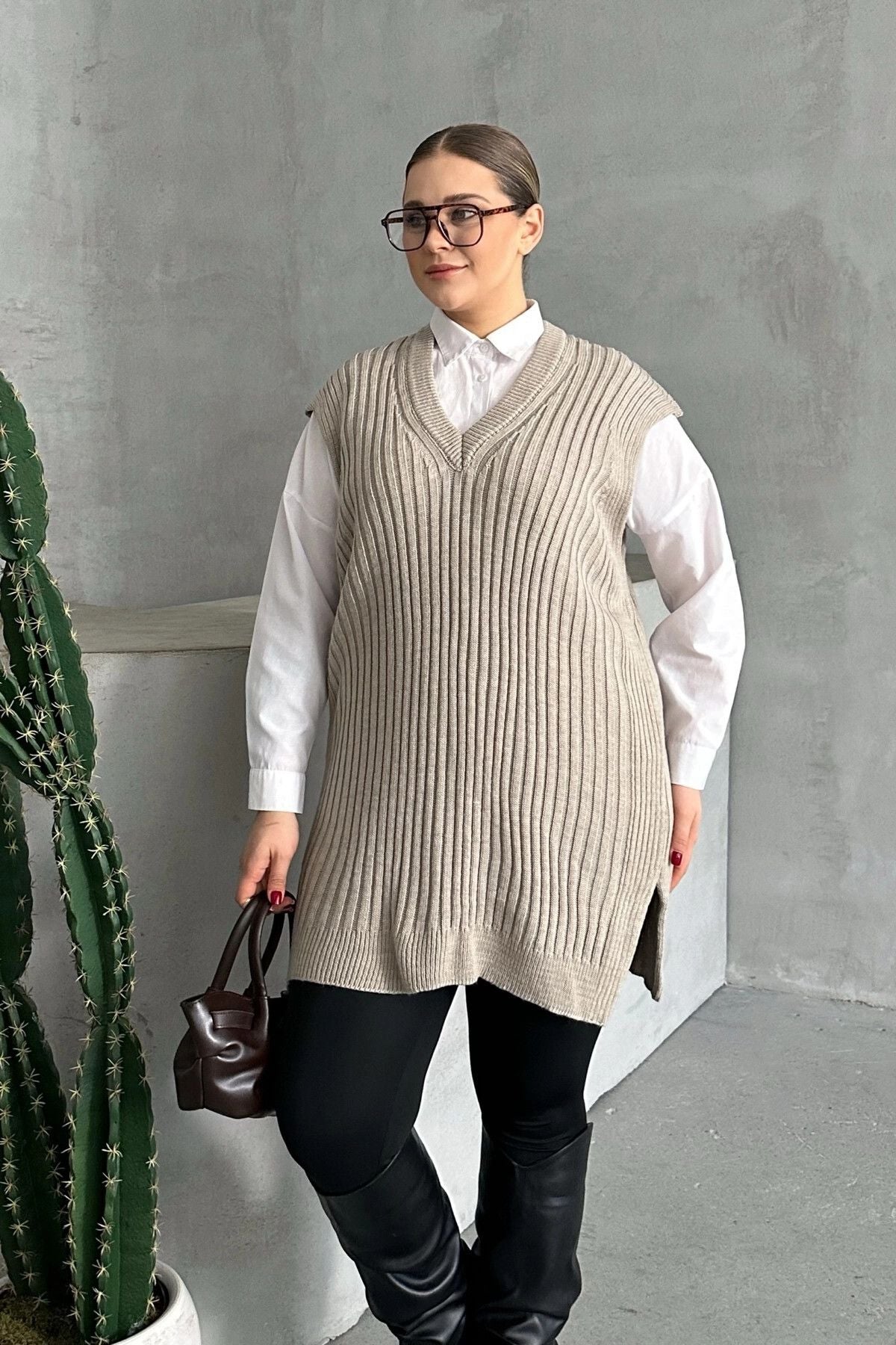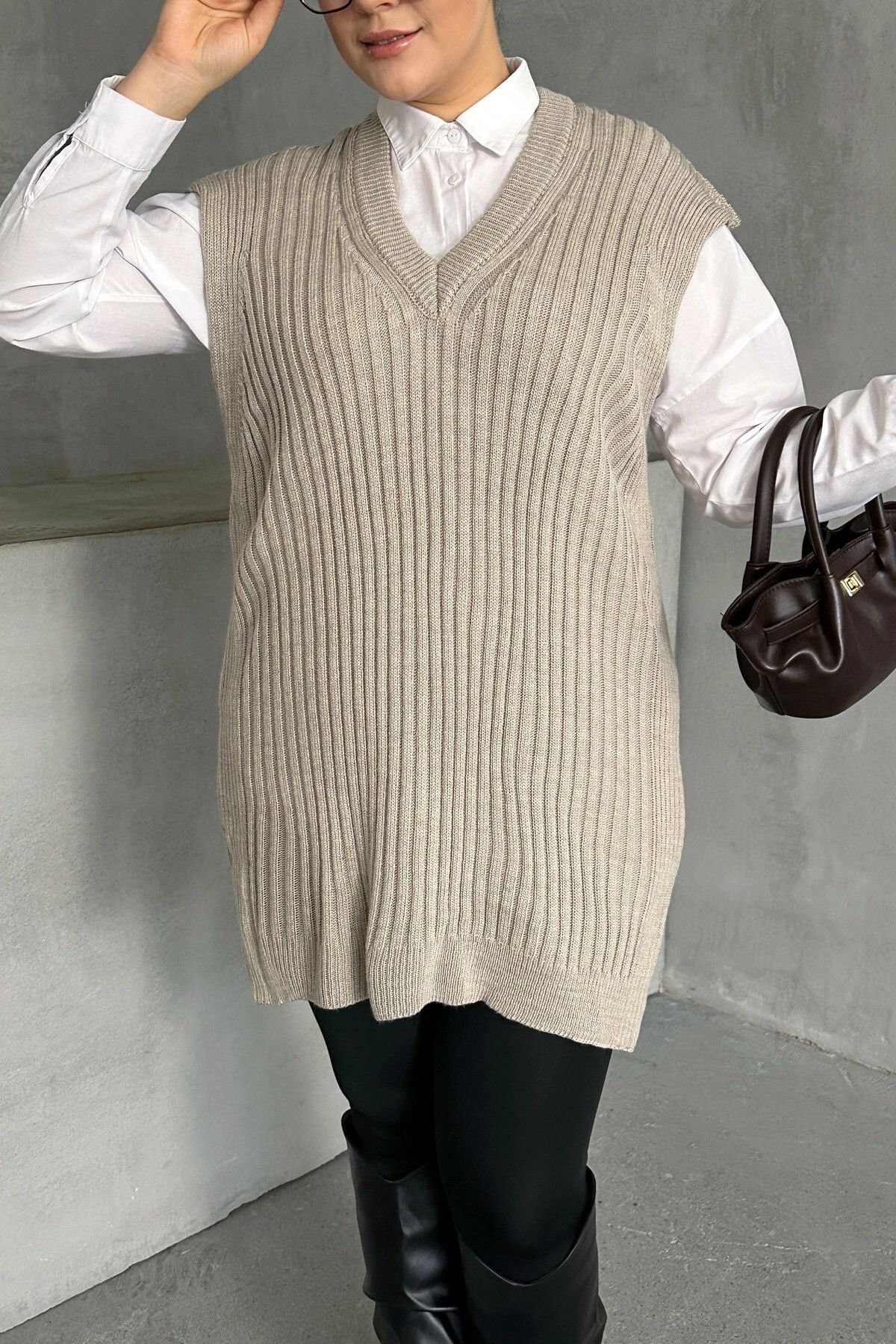 Büyük Beden V Yaka Kısa Kollu Triko Süveter 302133