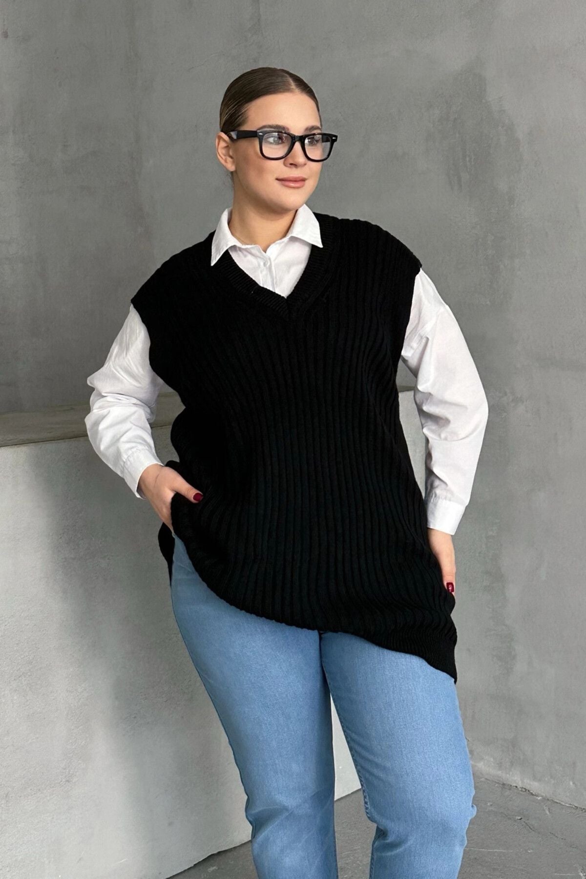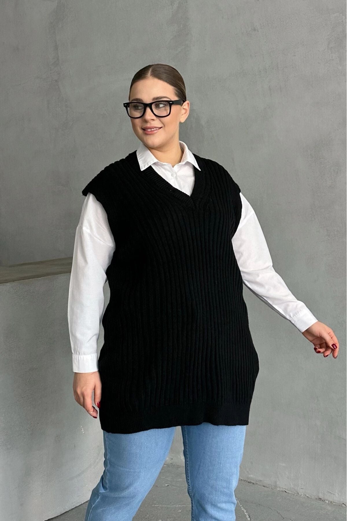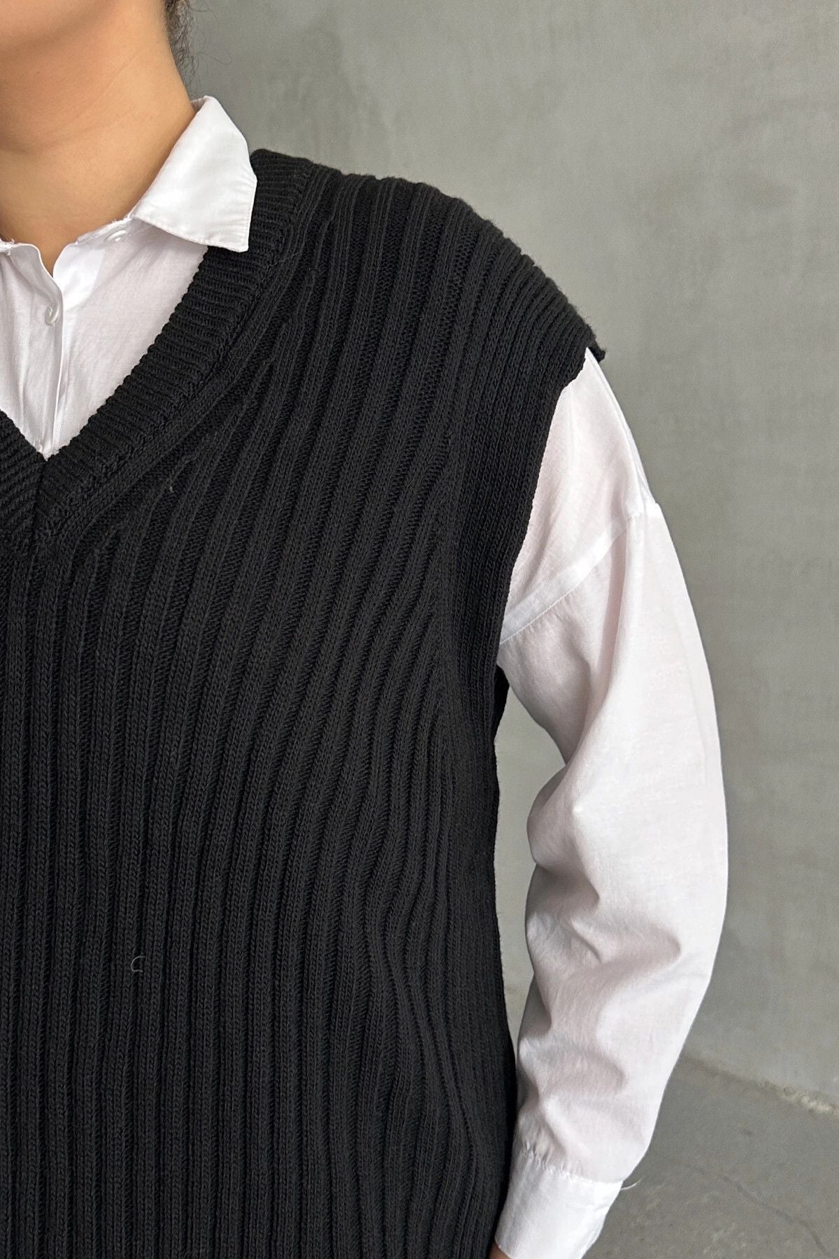 Moda Notu: Klasik ve şık bir görünüm sunan bu V yaka triko süveteri gömlekler üzerine giyerek hem ofis şıklığı hem de günlük kombinler için modern bir stil yaratabilirsiniz.