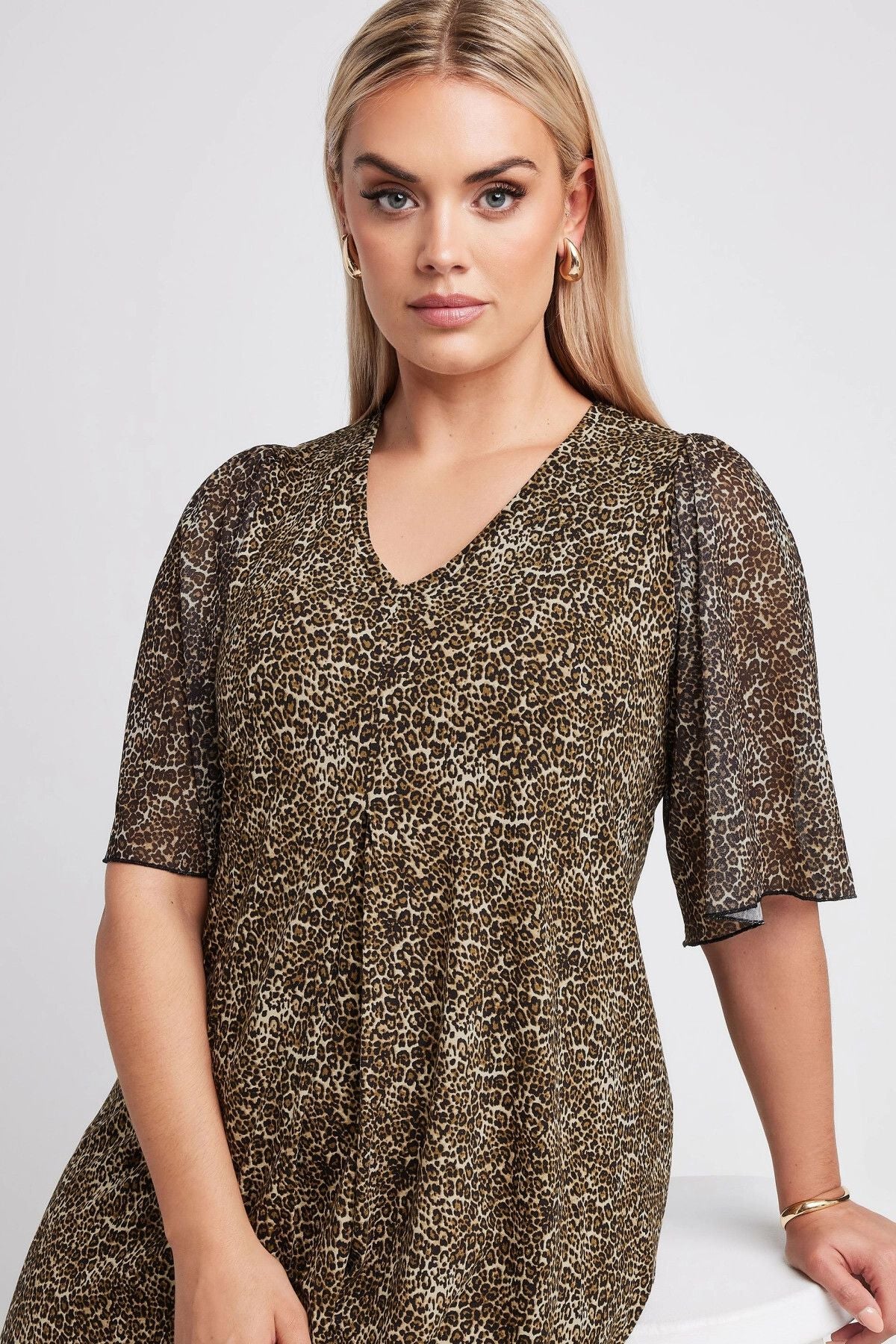 Model Detayı: Leopar baskısı, kısa tül kollar, swing stil, V yaka, pileli ön