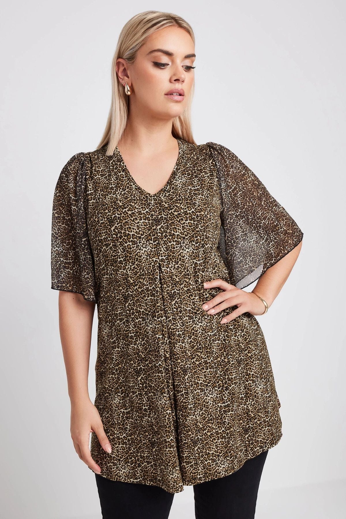 Bu yeni swing bluz ile gece çıkış koleksiyonunuzu yükseltin. Rahat jersey kumaştan üretilen bu bluz, V yakası ve pileli önü ile kısa tül kolları öne çıkıyor. Jean ve topuklu ayakkabı ile kombinlediğinizde akşam yemeği ve içki için mükemmel olan görünümünüzü tamamlıyor. Mükemmel jean ve güzel bluz kombinasyonu! Leopar desenin vahşi çekiciliği ve tül kolların feminen zarafeti ile hem cesur hem şık bir seçenek sunan bu bluz, gece çıkışlarınızın vazgeçilmez parçası olmaya aday.