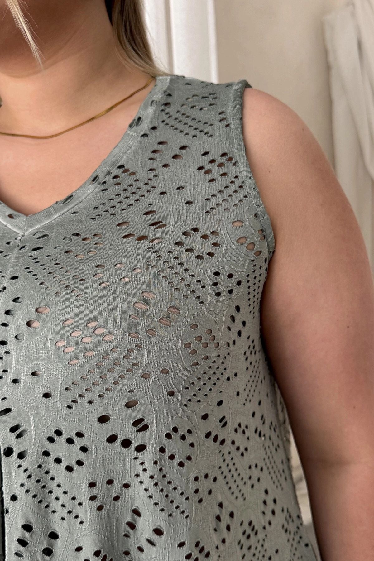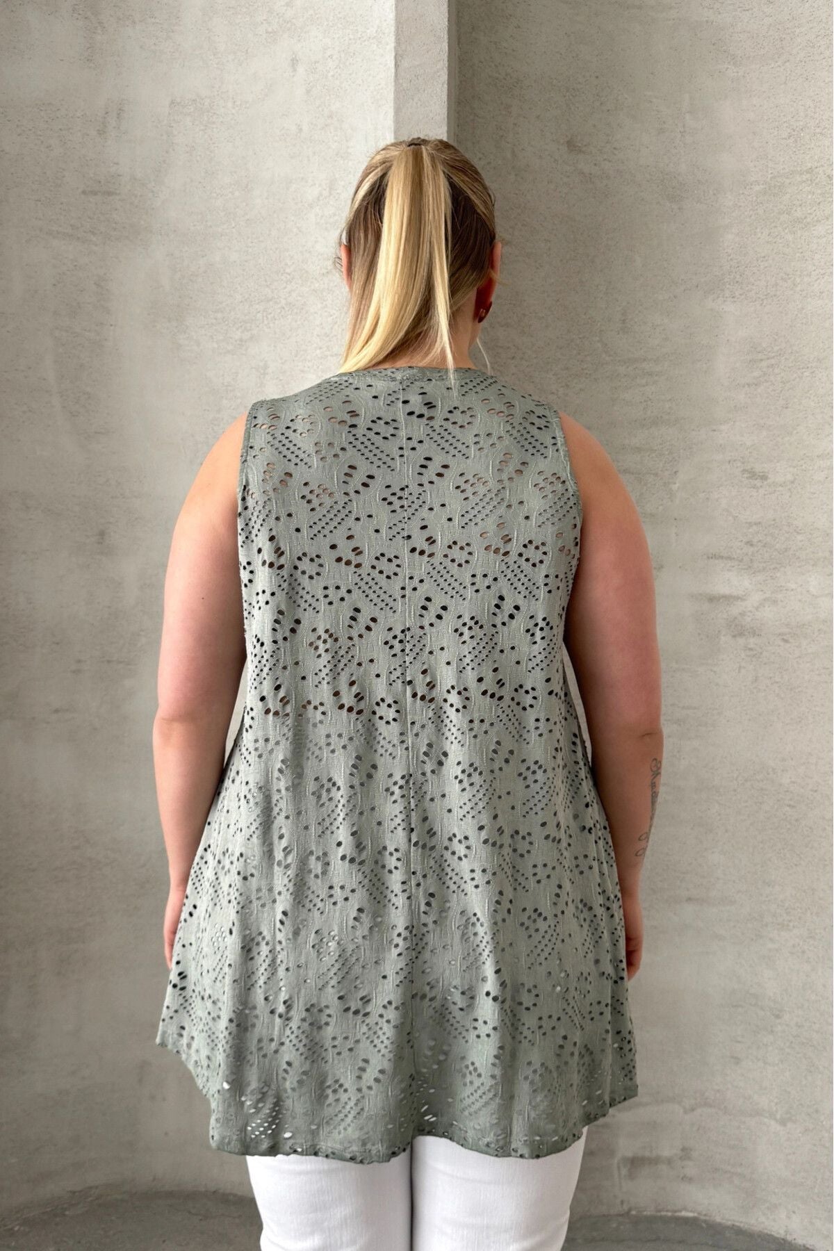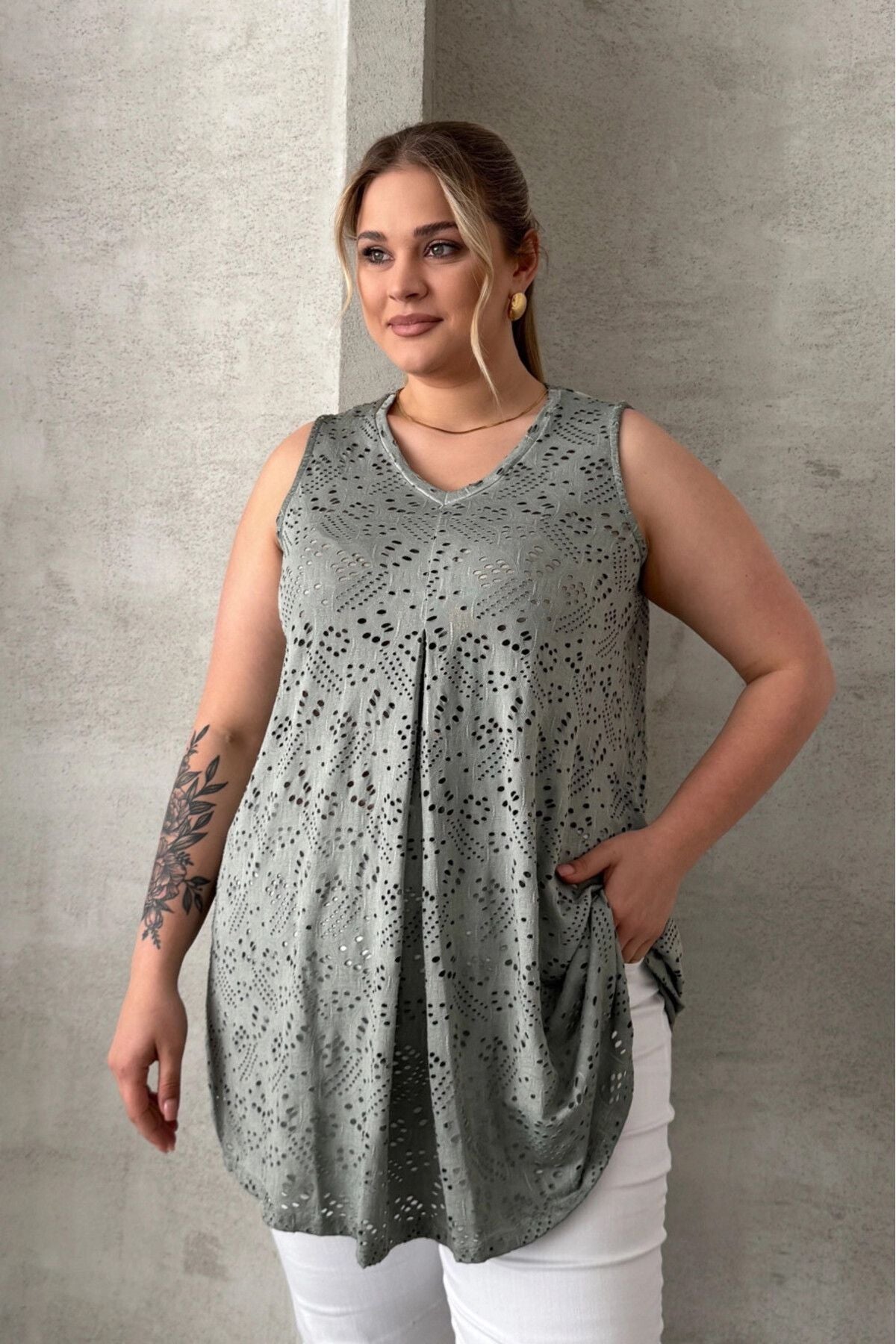 • Model Detayı: Lazer Kesim Dantel Desenli, V Yaka, Kolsuz, Salaş Tunik
