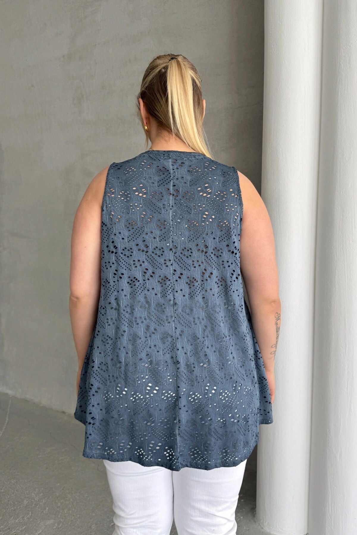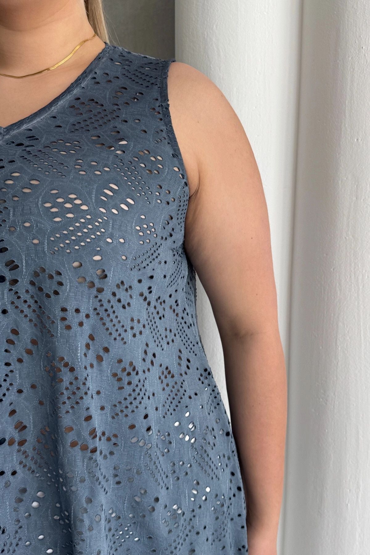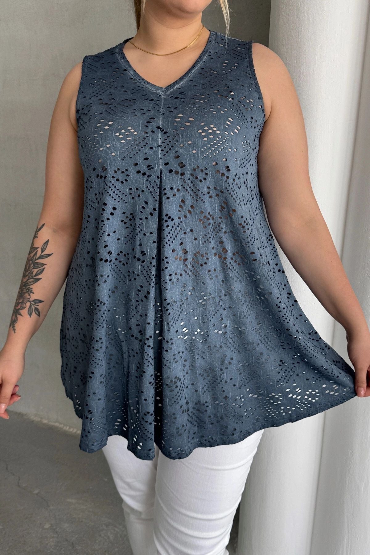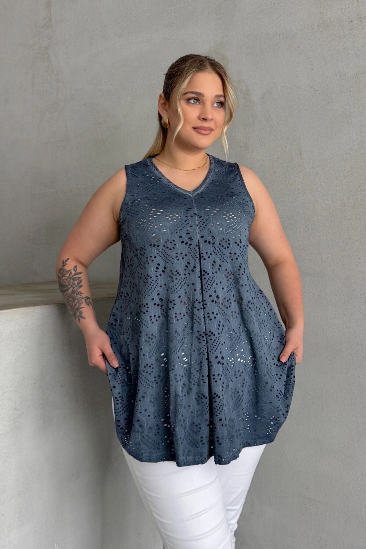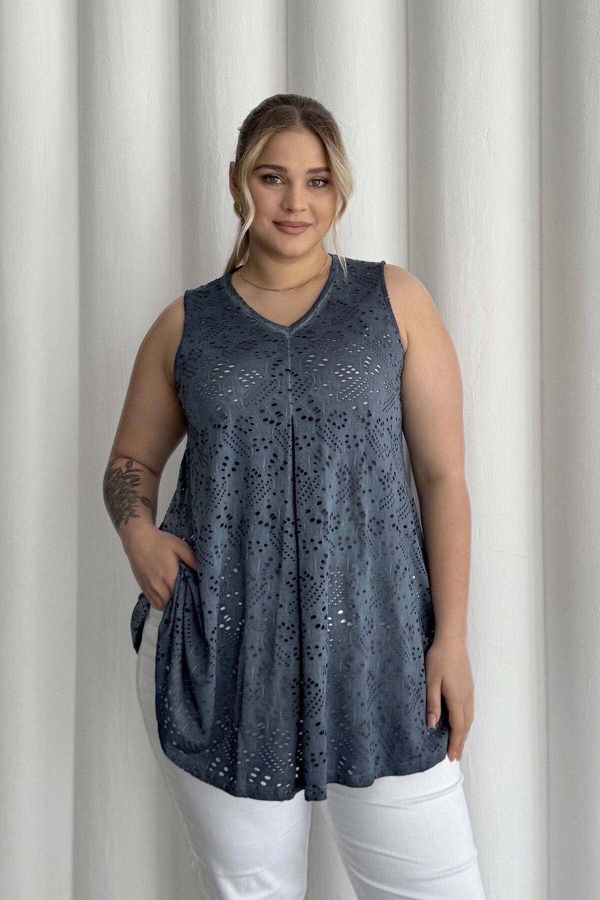 Model Detayı: Lazer Kesim Dantel Desenli, V Yaka, Kolsuz, Salaş Tunik