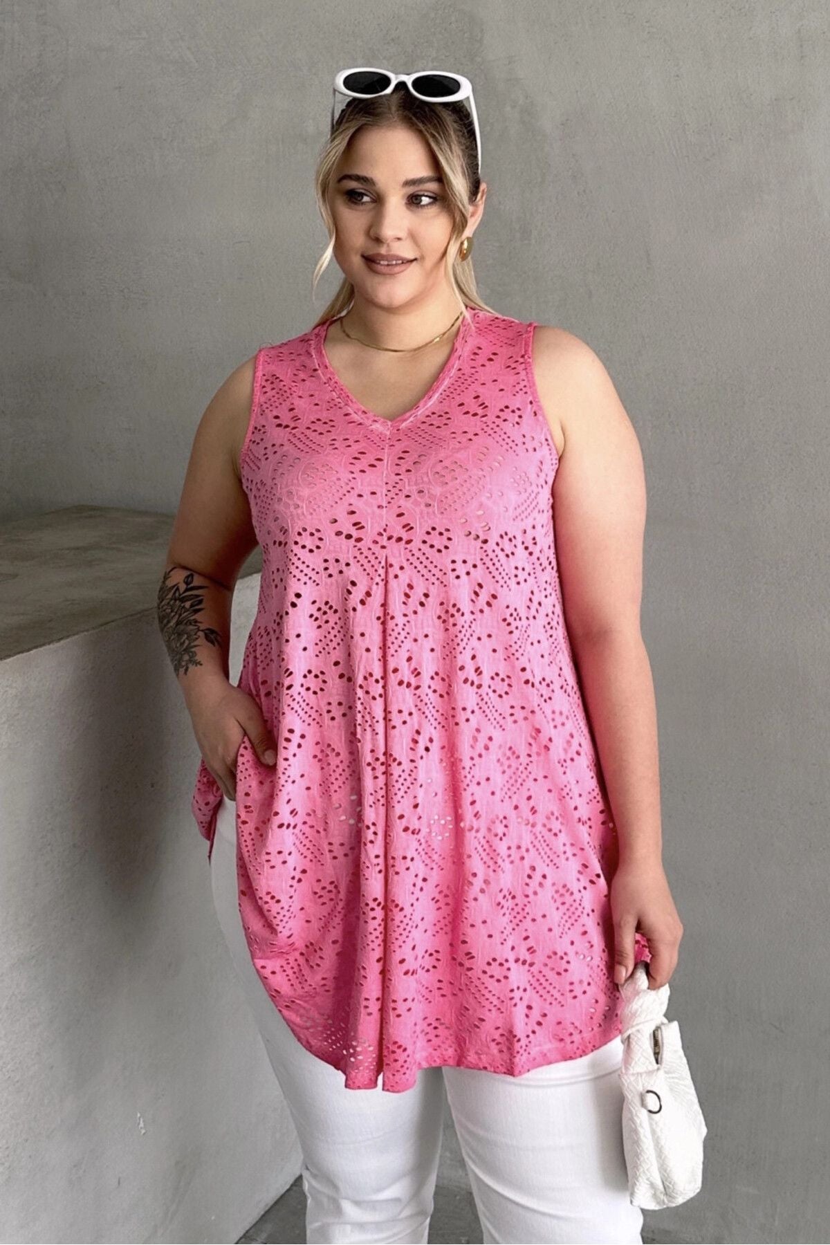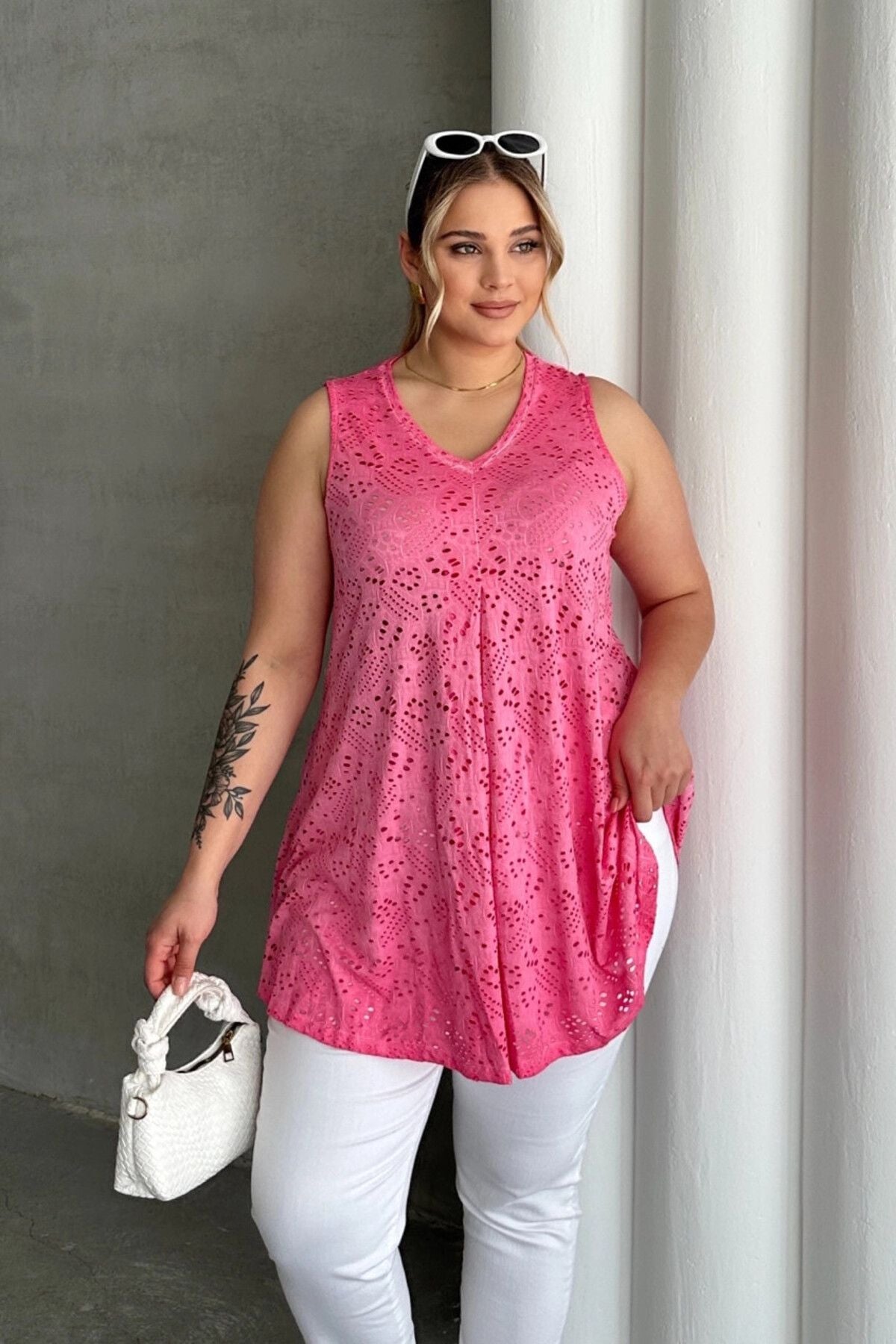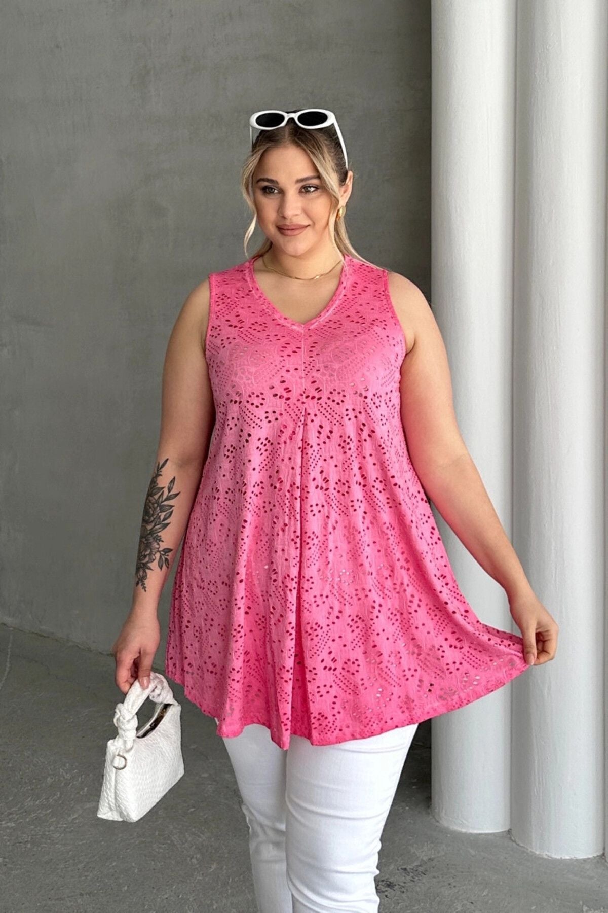 Model Detayı: Lazer Kesim Dantel Desenli, V Yaka, Kolsuz, Salaş Tunik