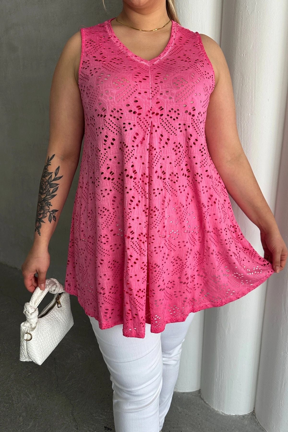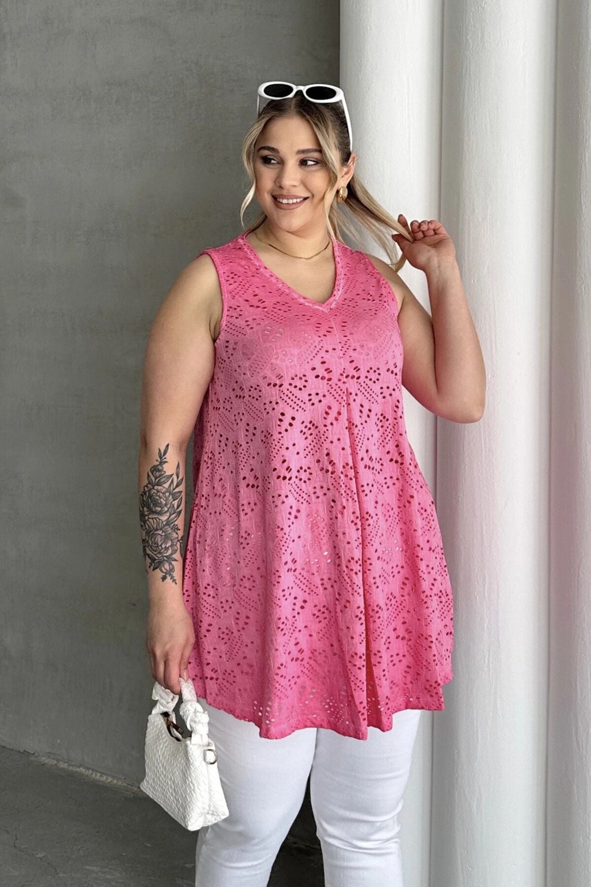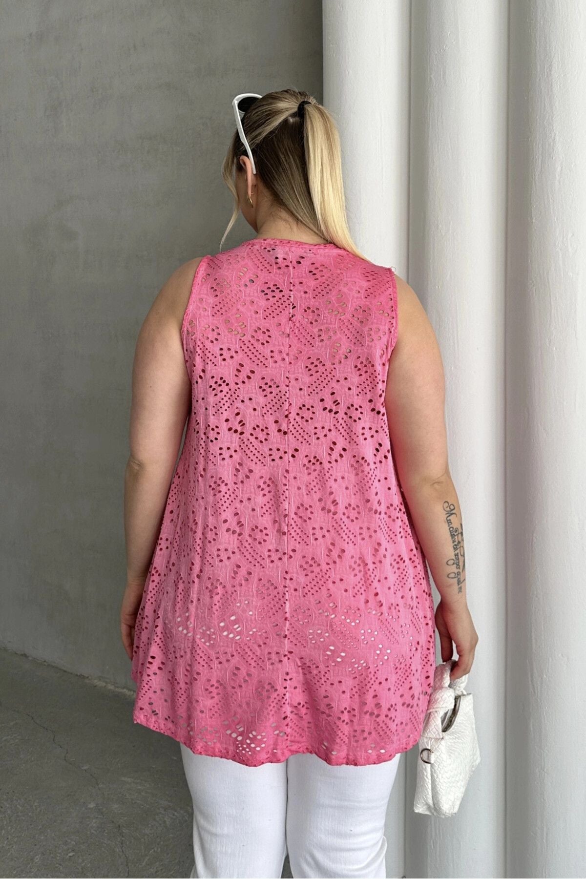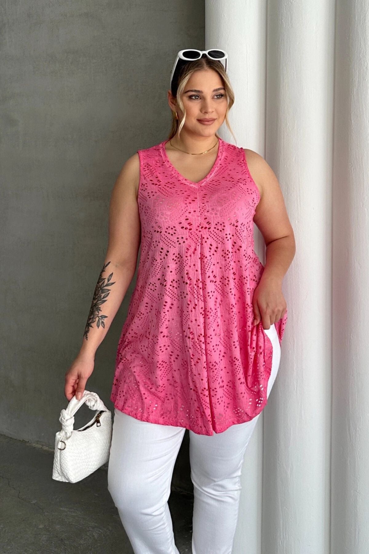 Model Detayı: Lazer Kesim Dantel Desenli, V Yaka, Kolsuz, Salaş Tunik