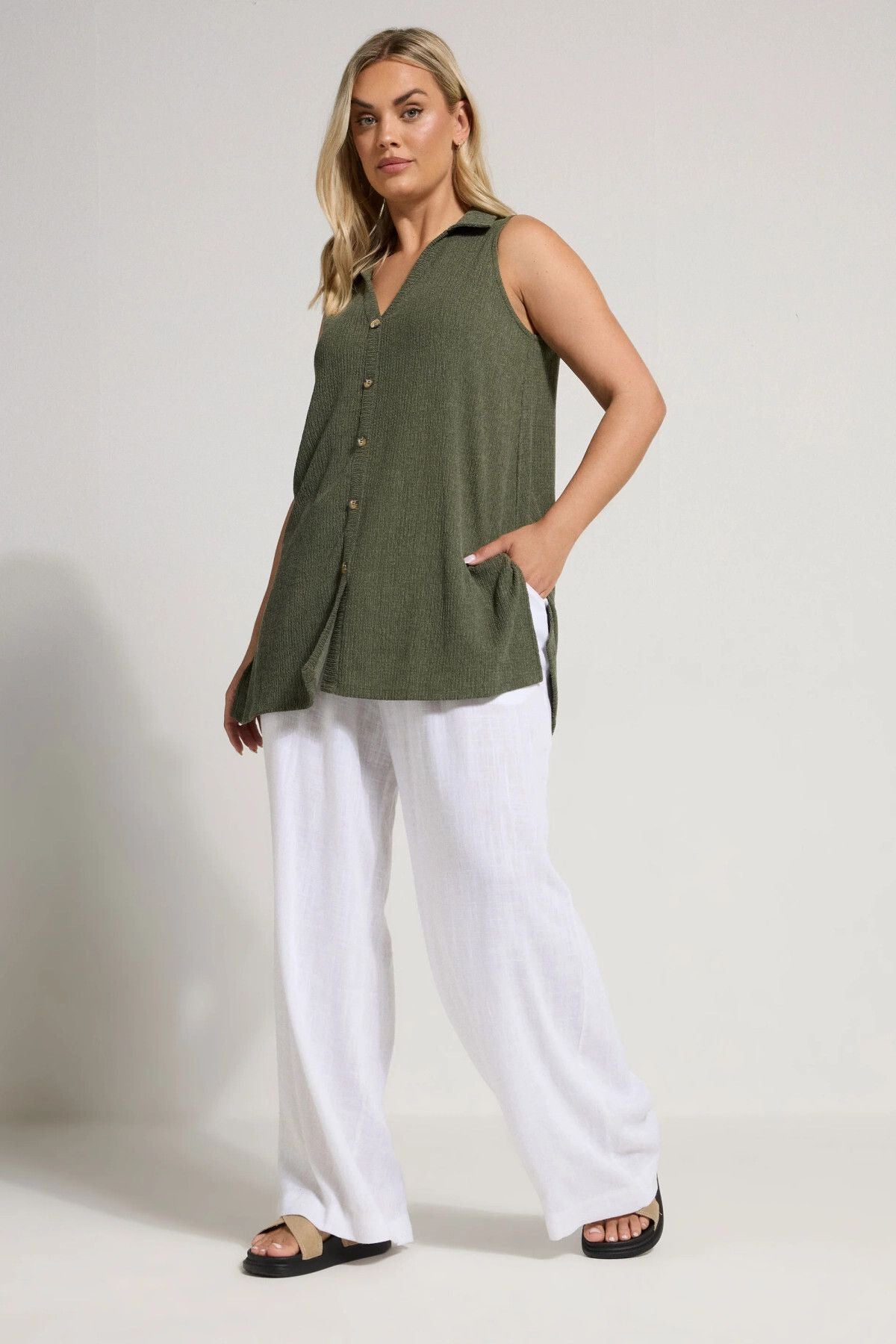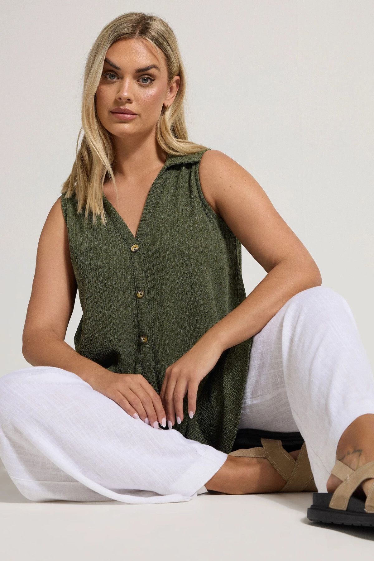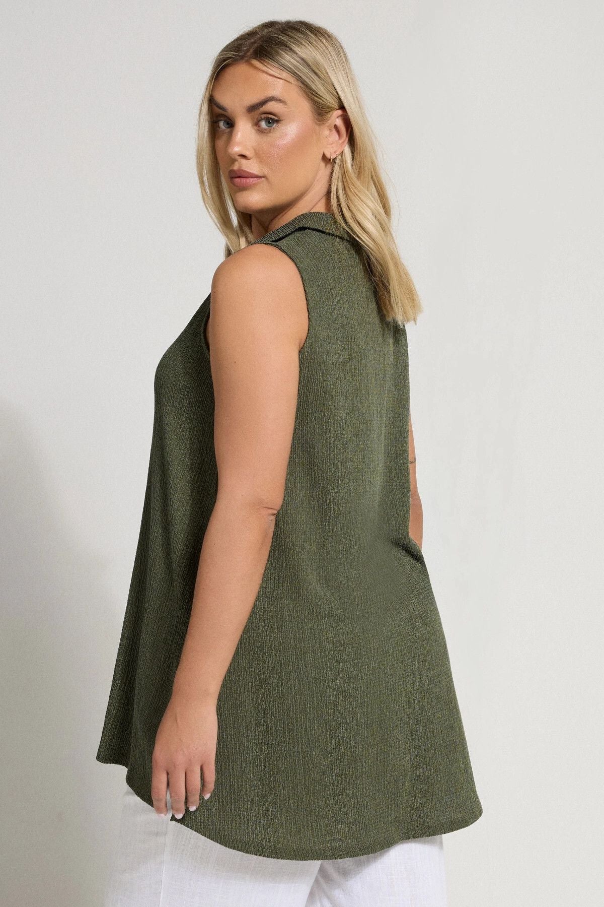 Bu sezon bu yeni dokulu gömlek ile günlük gardırobunuzu yükseltin! Rahat dokuma kumaştan üretilen bu gömlek, kolsuz görünümü, klasik yakası, V yakası, düğmeli ve yan yırtmaç etek ucu detayları ile öne çıkıyor. Pantolon ve sandalet ile kombinlediğinizde bu yaz tekrar tekrar tercih edeceğiniz görünümünüzü tamamlıyor! Yeni vazgeçilmez gömleğiniz! Dokulu kumaşın zengin hissi ve klasik gömlek kesimin şık duruşu ile hem sofistike hem rahat bir seçenek sunan bu gömlek, yaz gardırobunuzun temel elemanı olmaya aday.