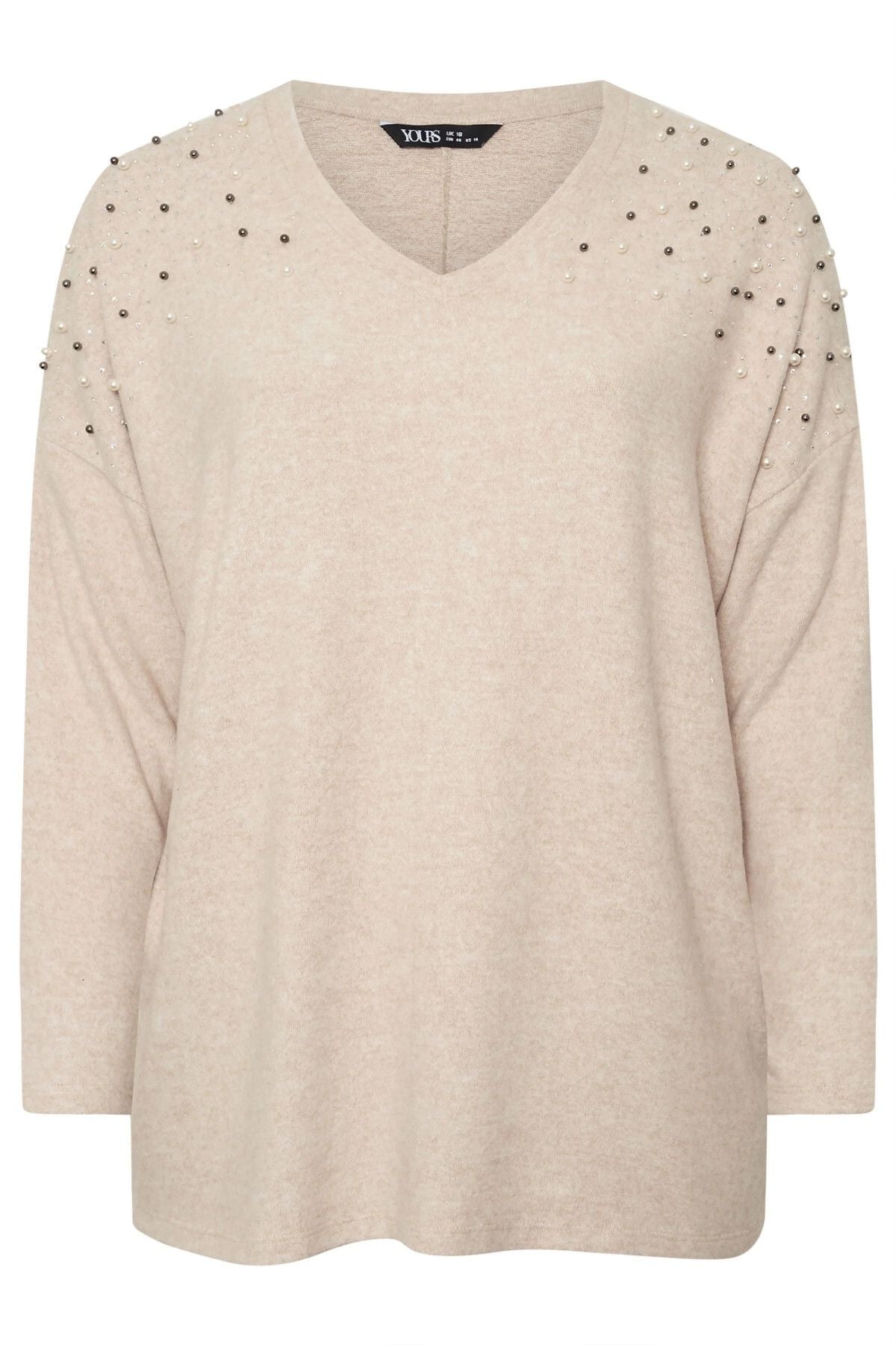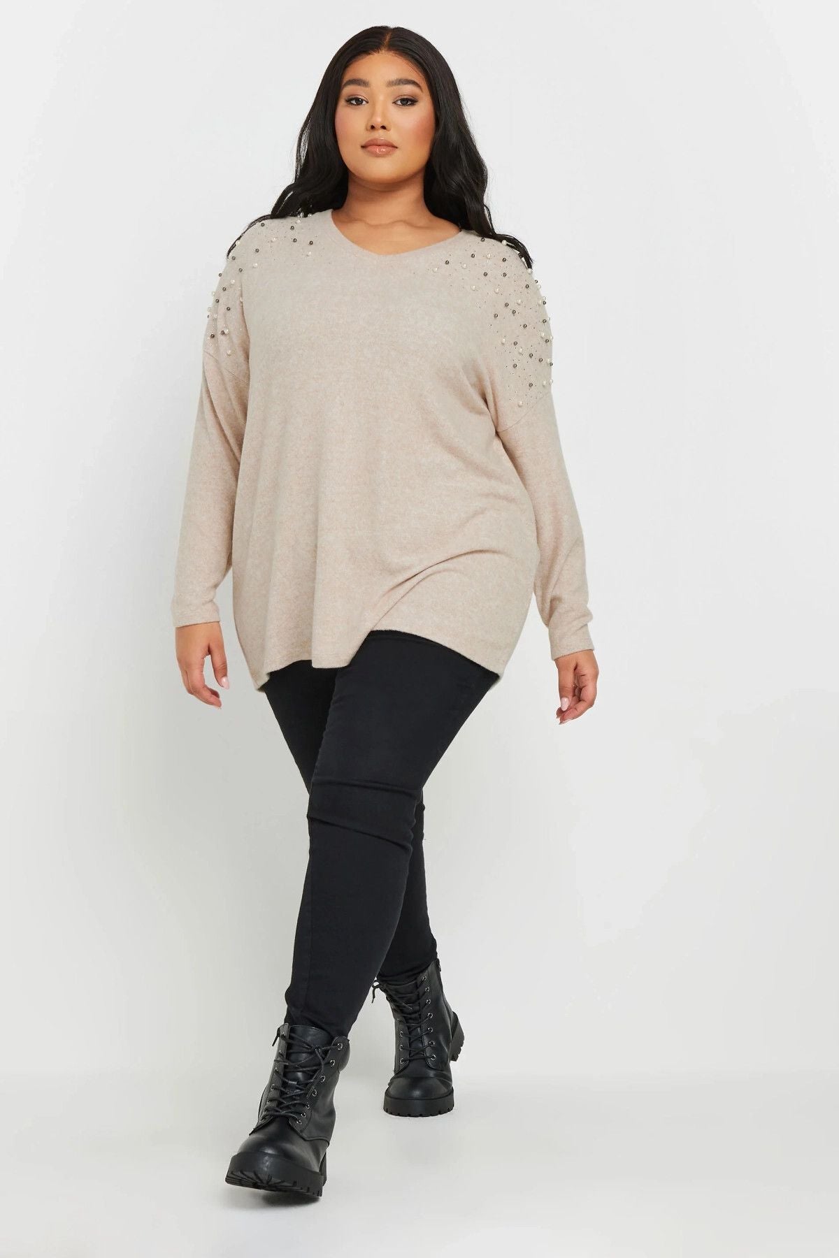 Büyük Beden V Yaka Uzun Kollu Omzu Boncuk İşlemeli Kazak 322301