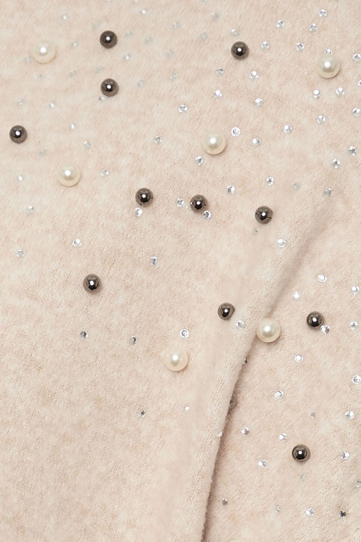 Model Detayı: İnci ve taş süsleme, düşük omuz tasarım, V yaka, uzun kol