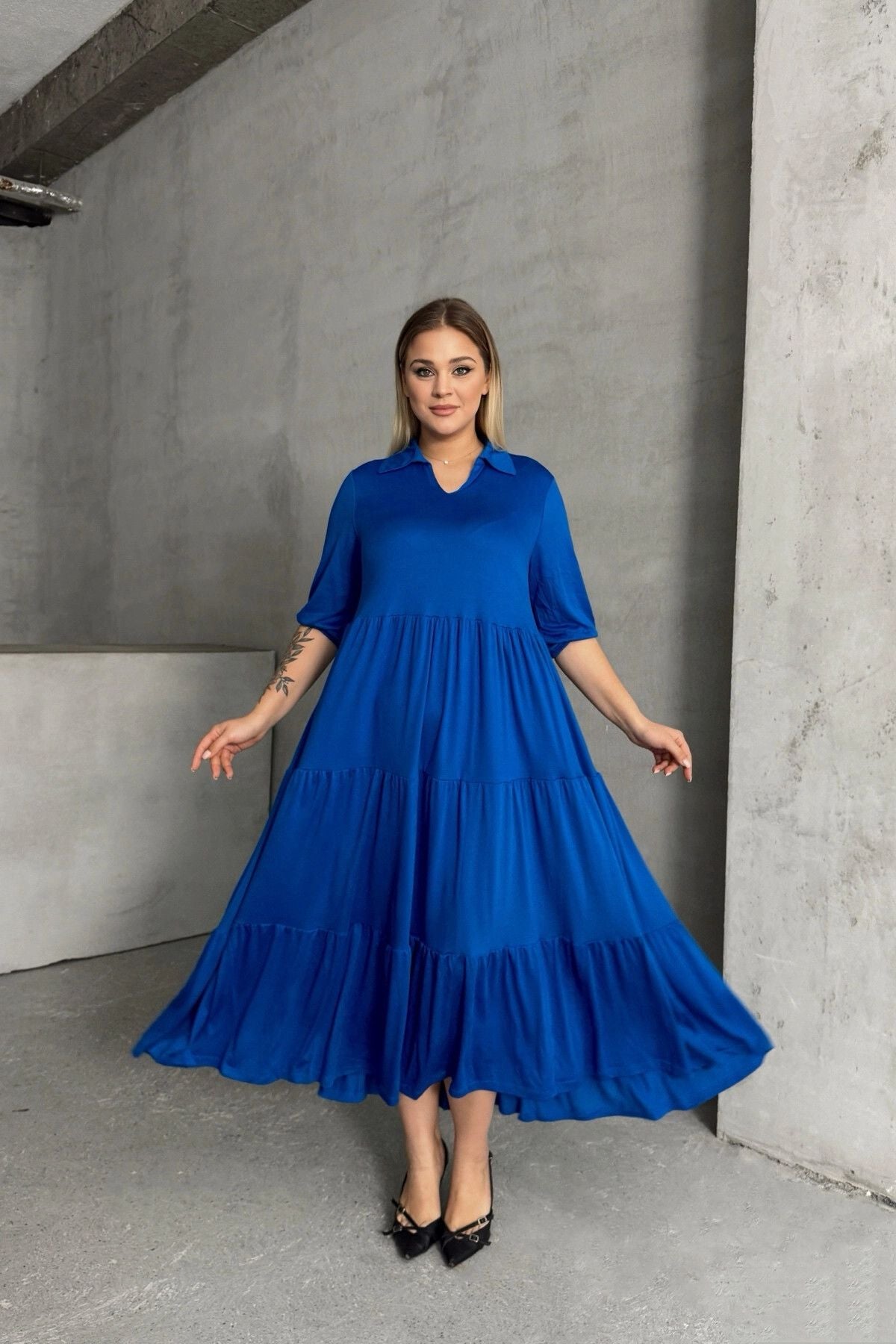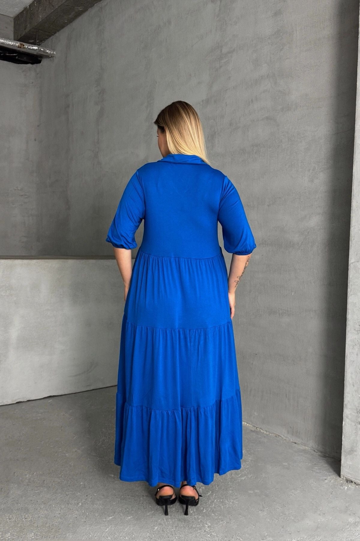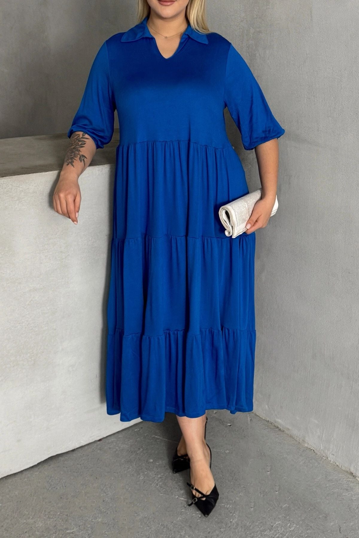 Büyük Beden V Yaka Yarım Kollu Beli Lastikli Uzun Elbise 302149