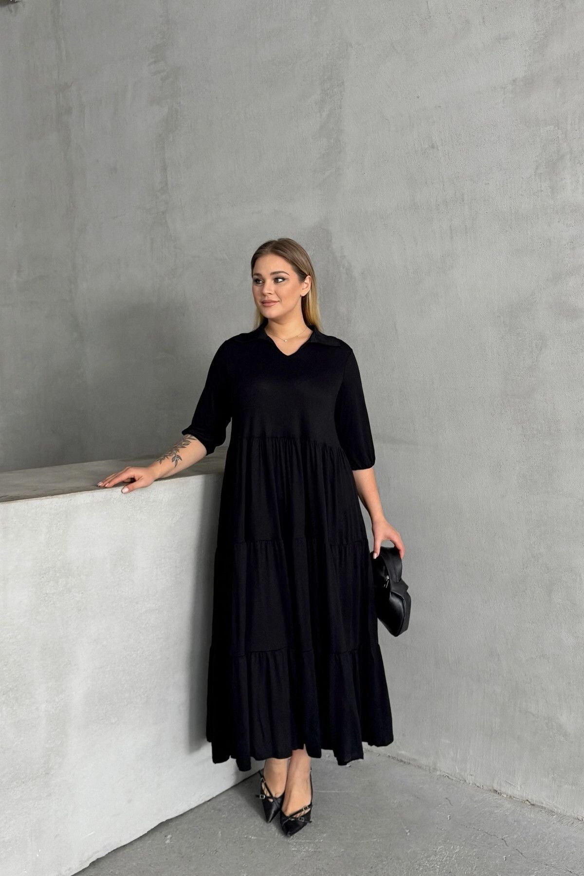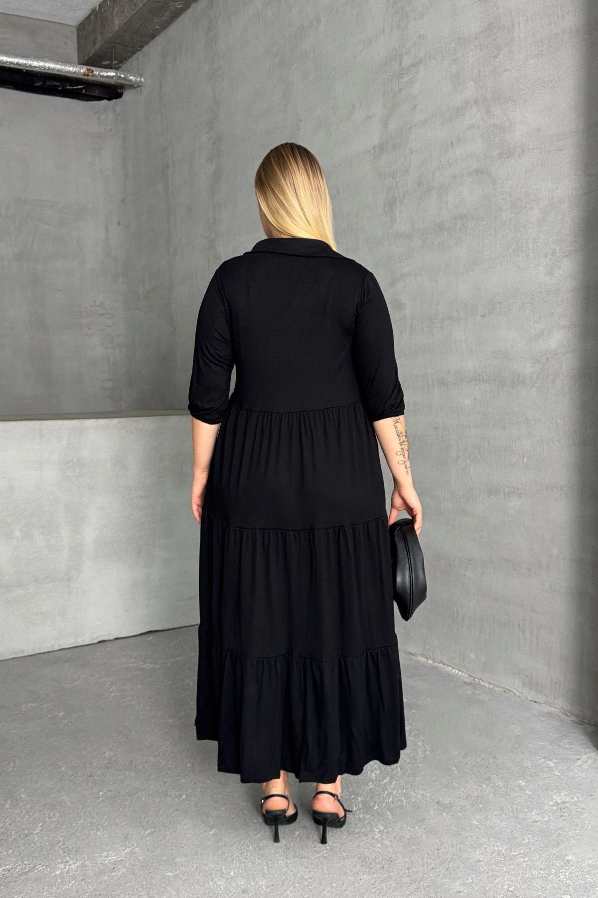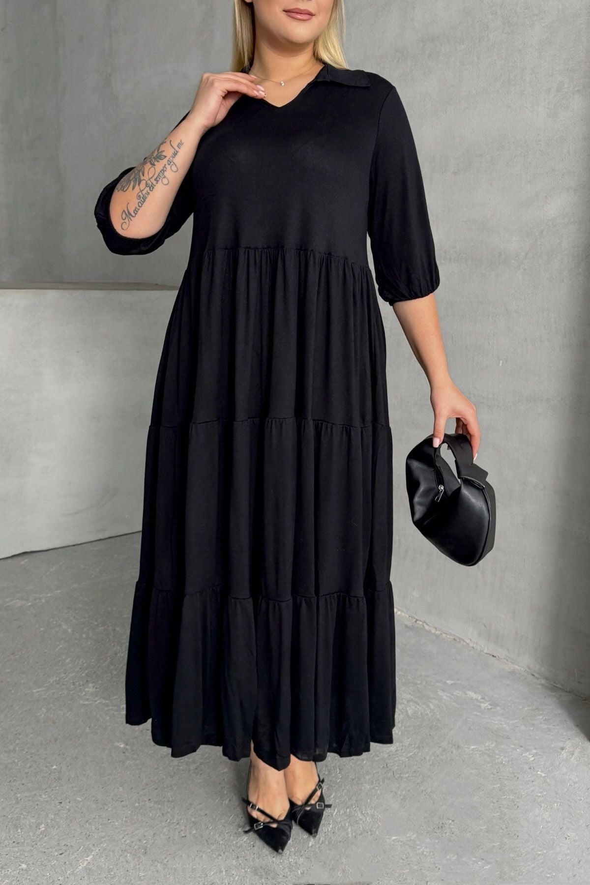 Model Detayı: Gömlek Yaka, 3/4 Kol, Kat Kat Etekli, Maxi Boy Elbise