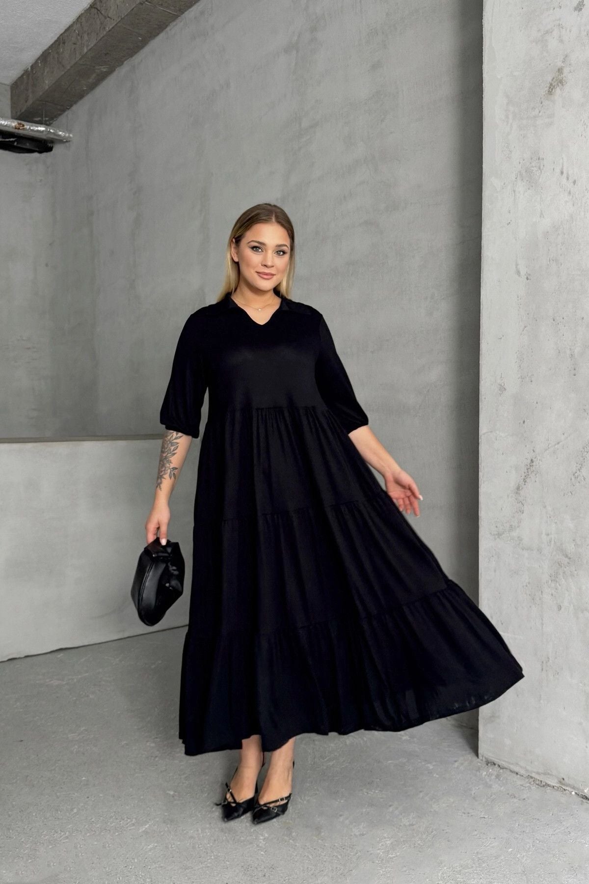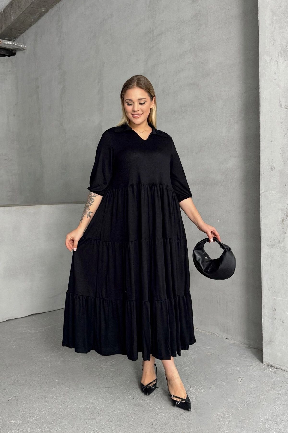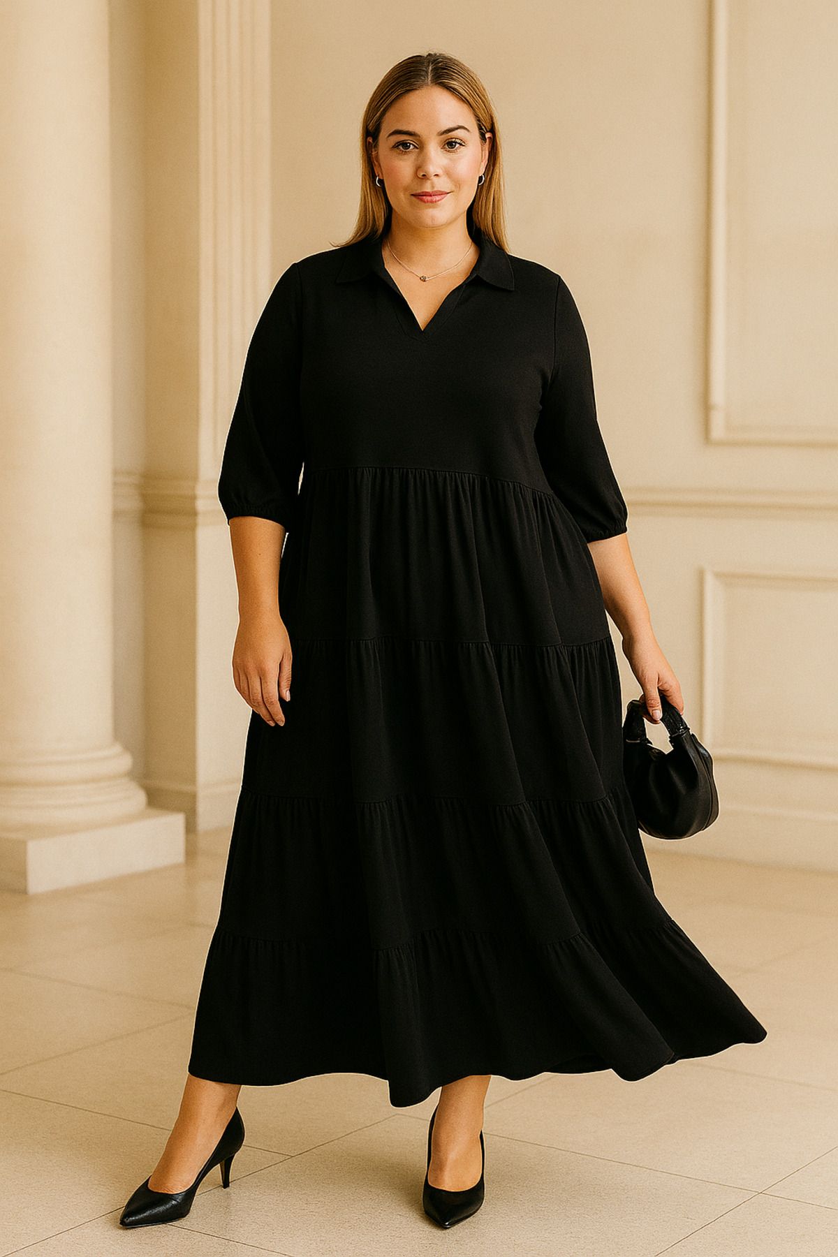 Model Detayı: Gömlek Yaka, 3/4 Kol, Kat Kat Etekli, Maxi Boy Elbise