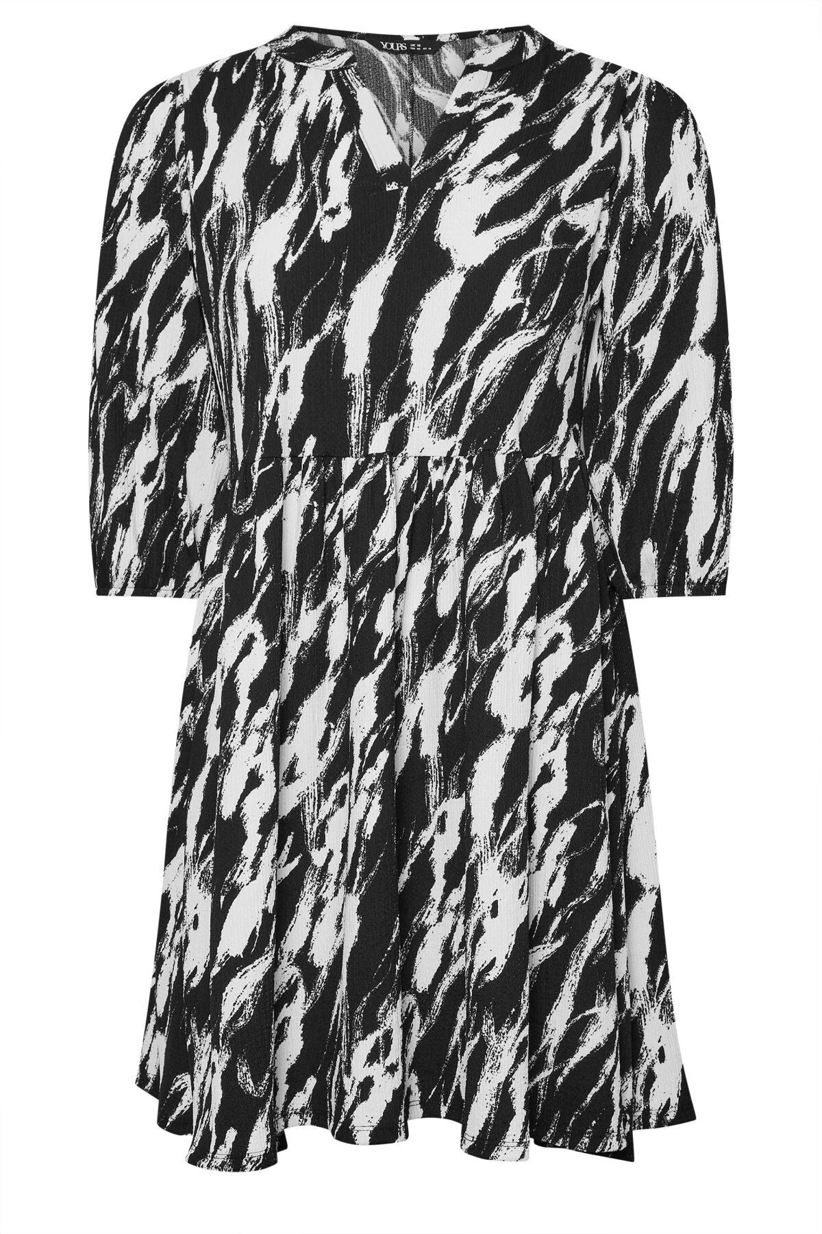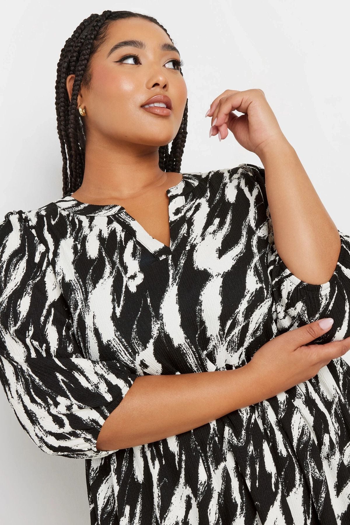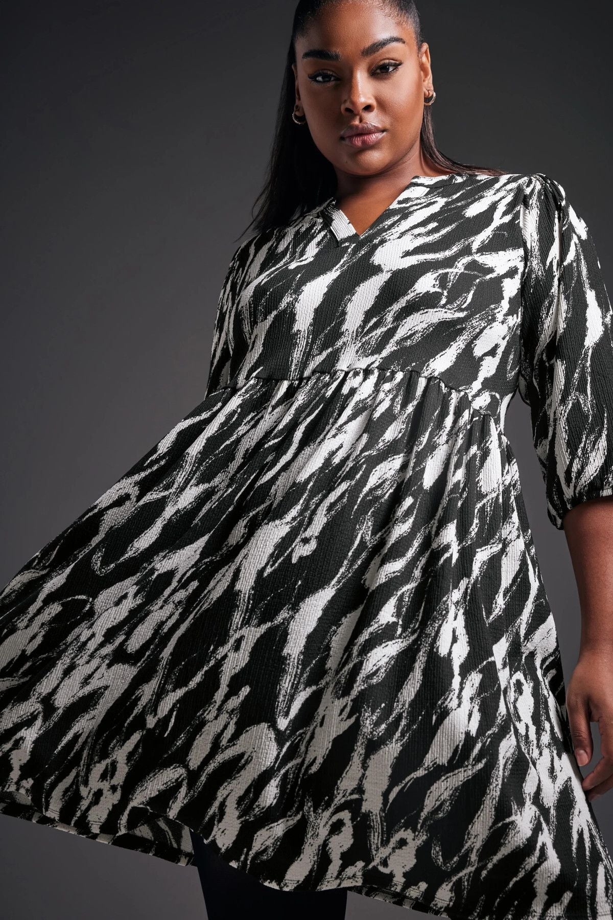 Model Detayı: Soyut baskı, smock stil, çentikli yaka, dokulu tasarım, 3/4 uzunlukta kol